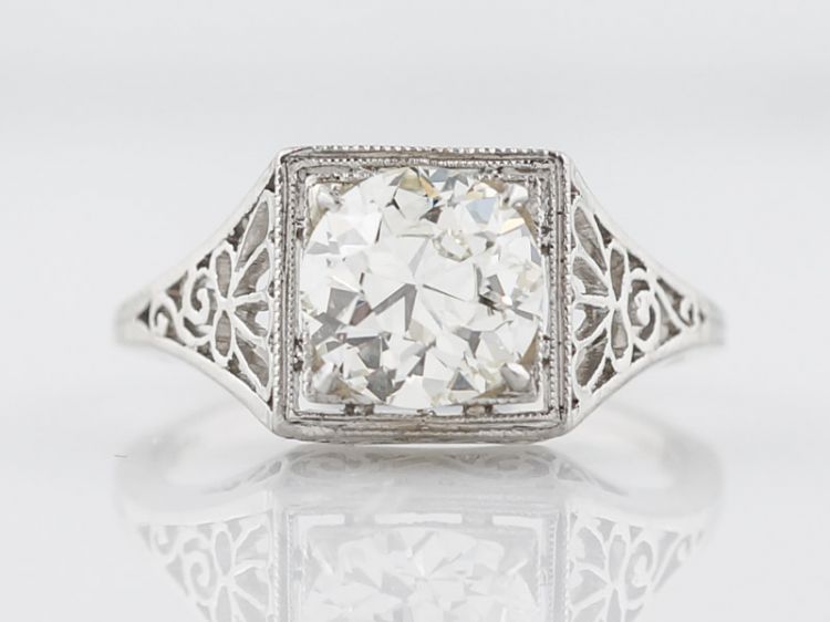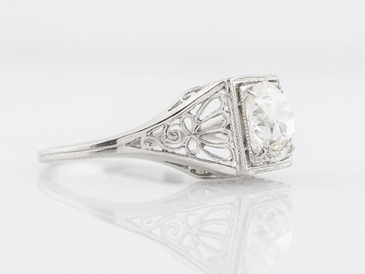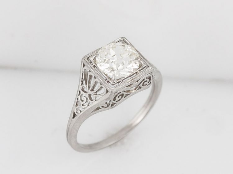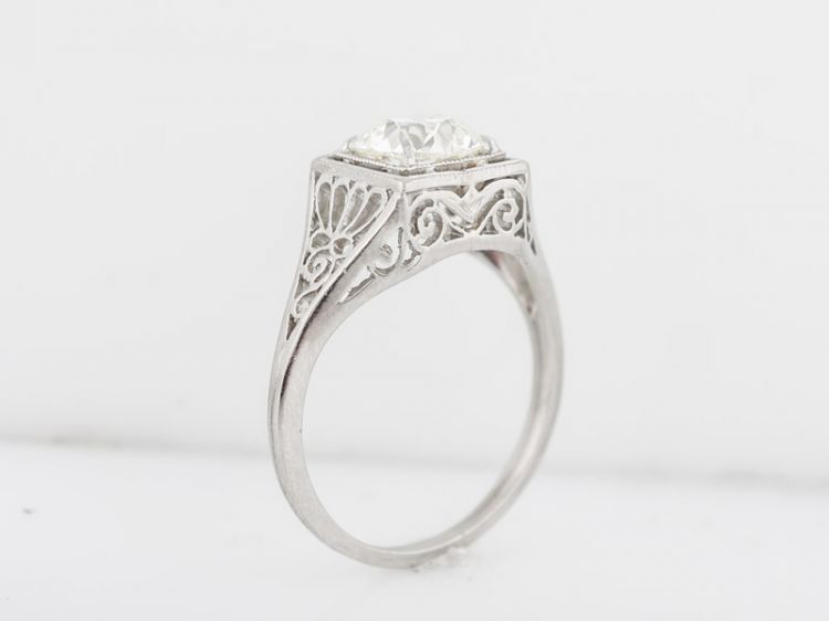 Filigree diamond engagement ring Art Deco. This original antique Art Deco diamond solitaire ring features a brilliant 1.41 carat old European cut diamond. The diamond is bead set into a decorative square bezel with a milgrain detail. There is an additional exterior square bezel surround the center diamond creating a slightly larger appearance. The shank and gallery of the ring have an incredible fine open platinum filigree detail in a scrolling pattern. The lines of the ring are bold while the mounting feels delicate in structure and is truly a tribute to the capabilities of platinum.