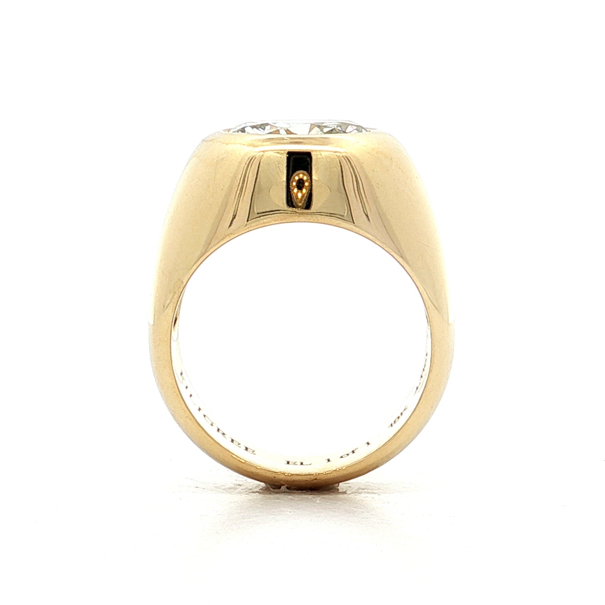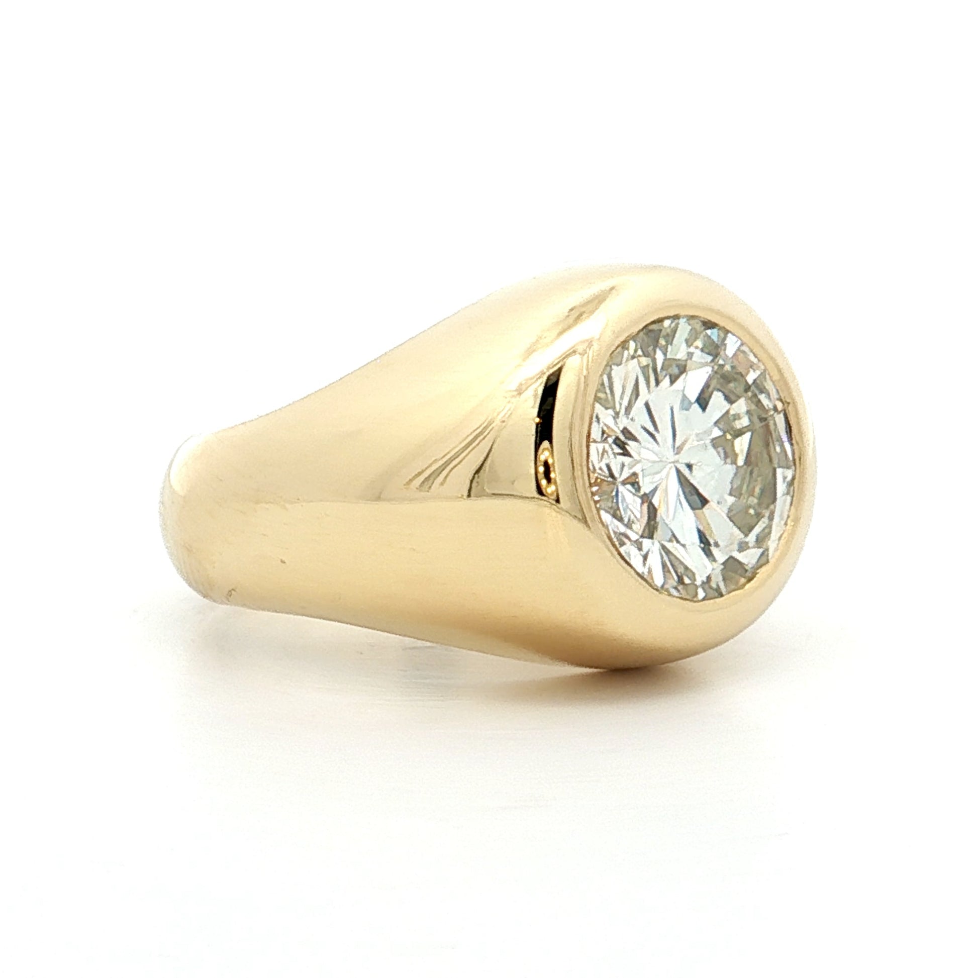This engagement ring from the Filigree x Eleanor Leftwich Collection features an 18 karat yellow gold band with a 4.11 carat round brilliant cut diamond. The diamond has VS1 clarity and N color, and sits flush with the band for a smooth profile. The gold band creates a backdrop that highlights the substantial center stone.