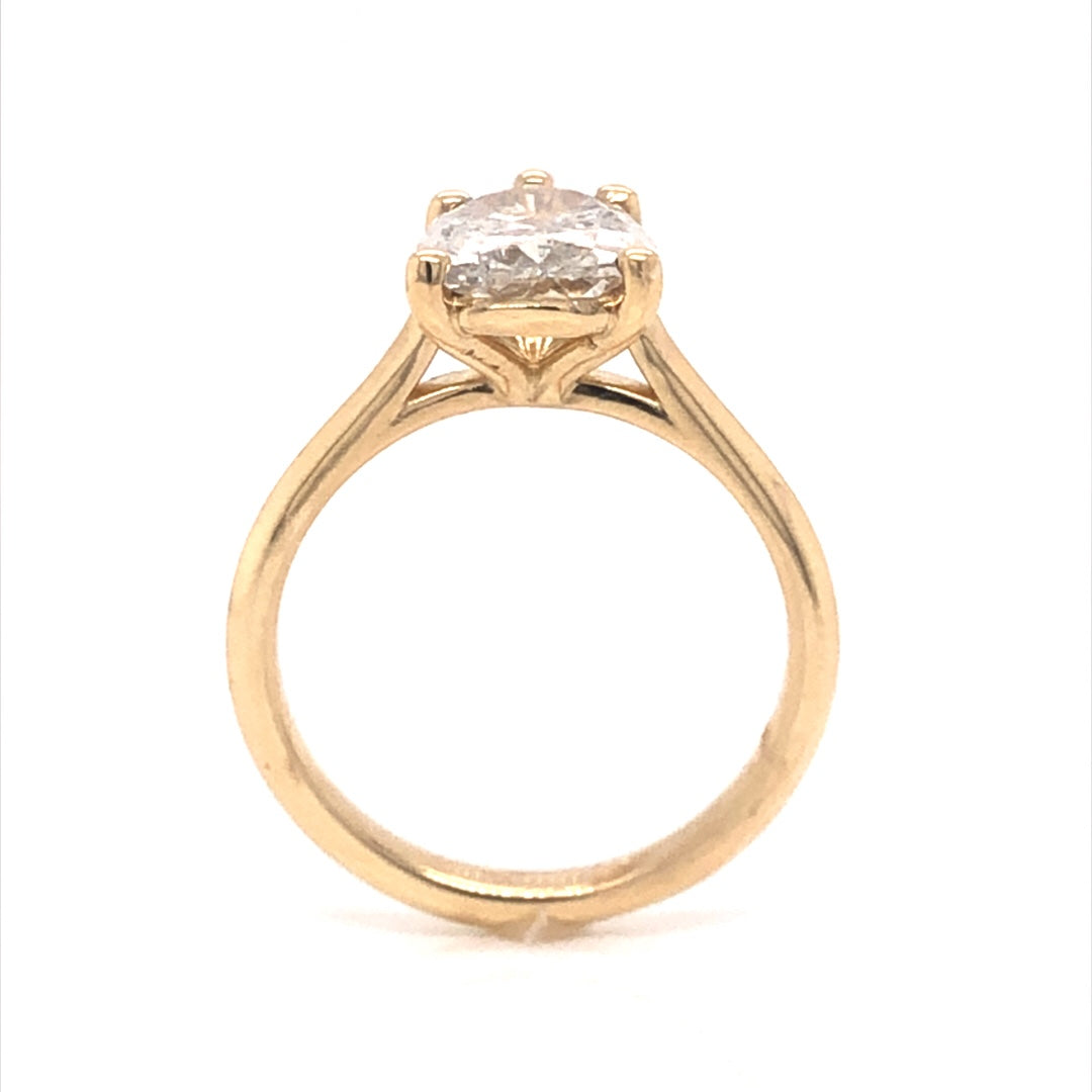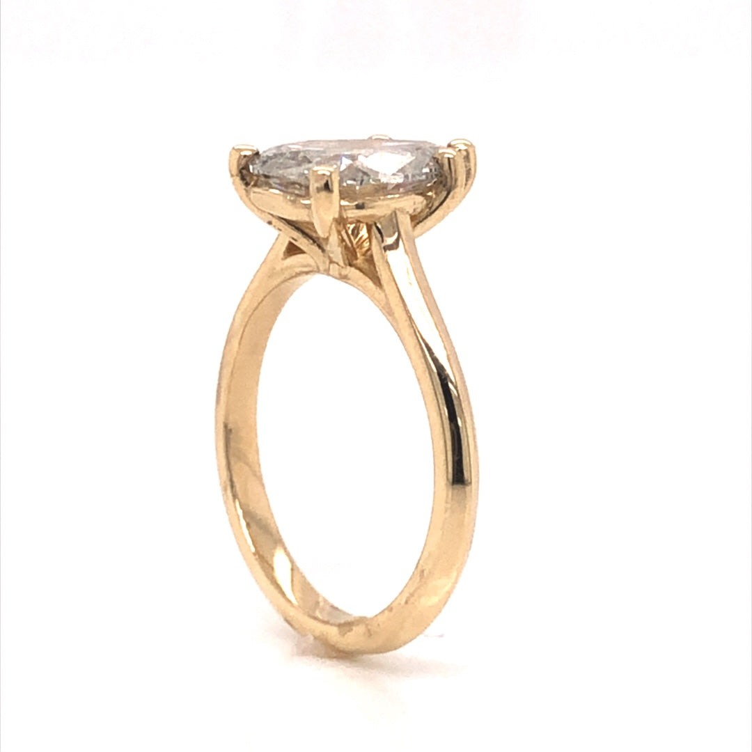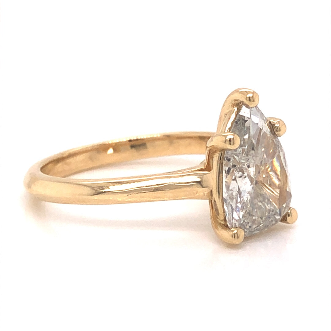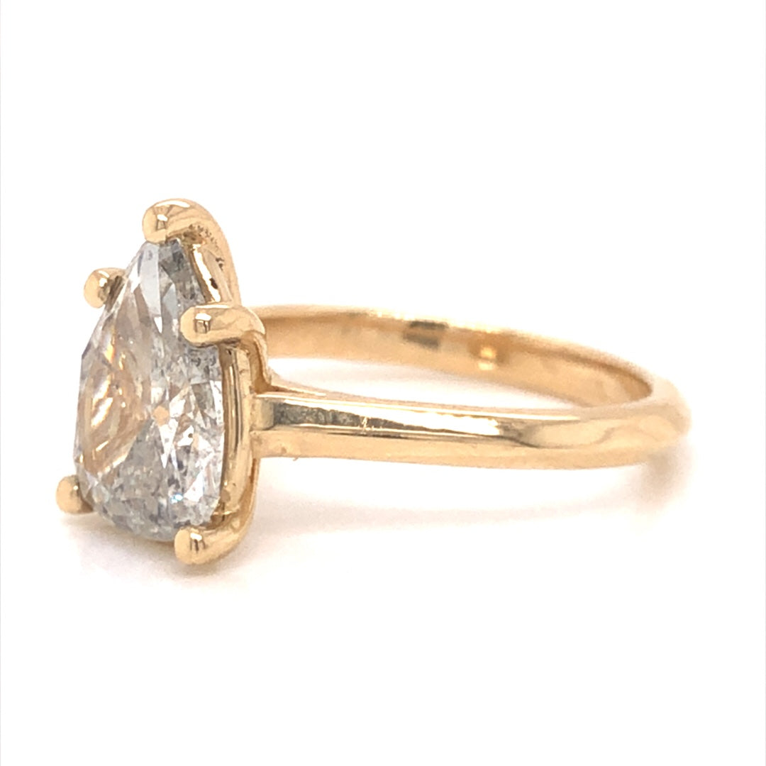 This stunning engagement ring features a 2.14 carat pear cut diamond in five prongs. The near colorless diamond features intricate facets, cut for maximum brilliance. Elegant in shape design. Finished on a high polished 14 karat yellow gold band, this modern ring is the definition of beauty.