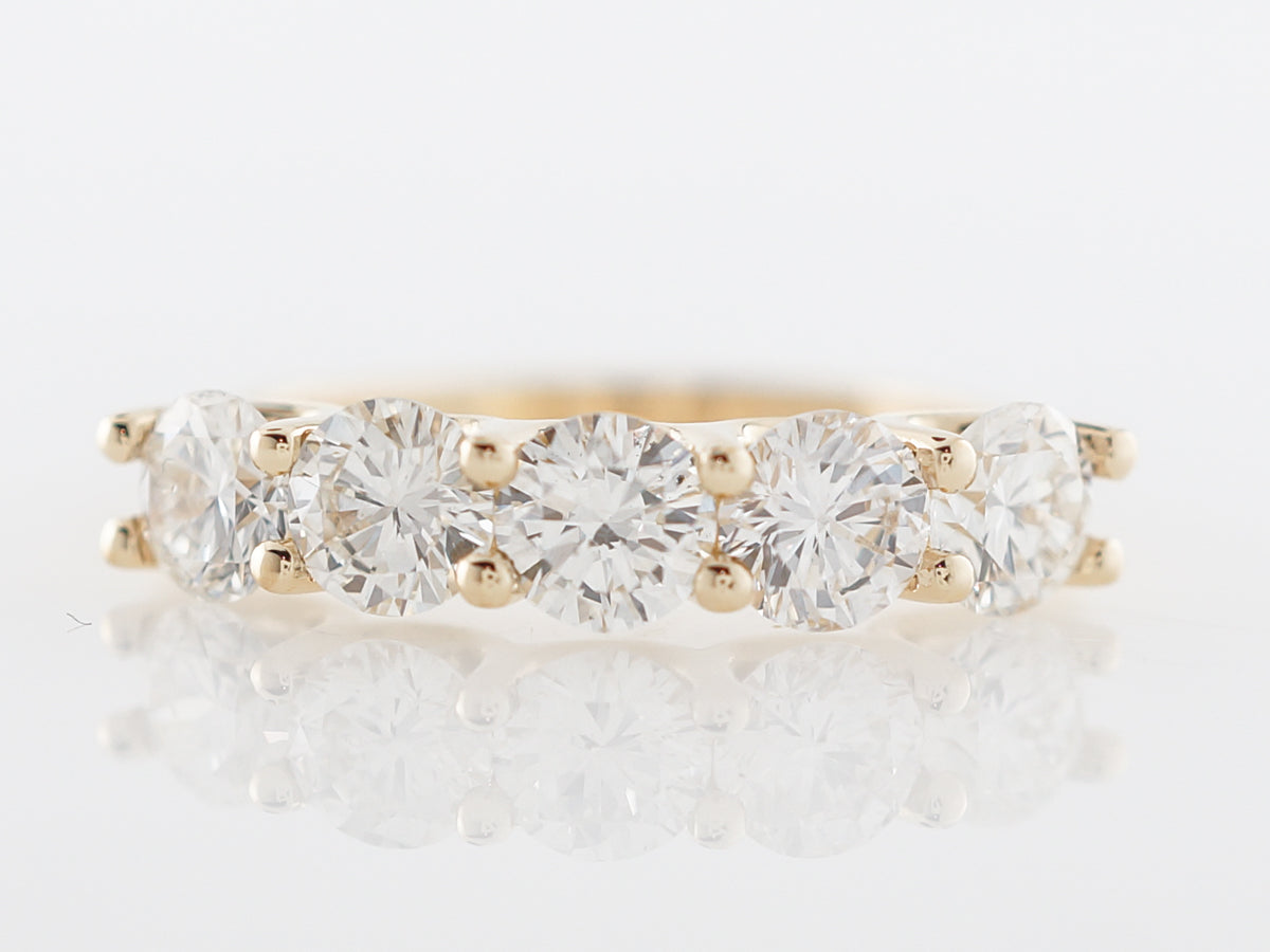 This large diamond band is set with five (5) stunning Round Brilliant diamonds across the bridge of the finger. The share prong 14 karat yellow gold mounting features delicate shared prongs creating an all diamond appearance from the top view. Each diamond weighs about .36 carats with a total diamond weight of 1.80 carats. Lovely on its own or perfect for the center piece of a stacking band set.