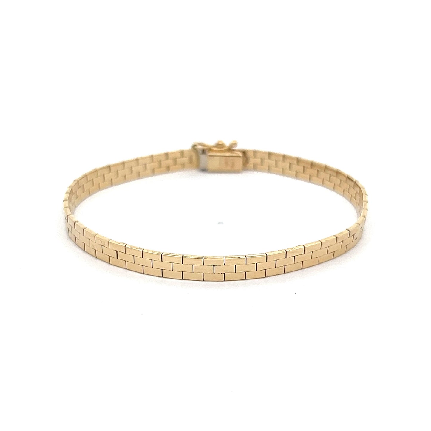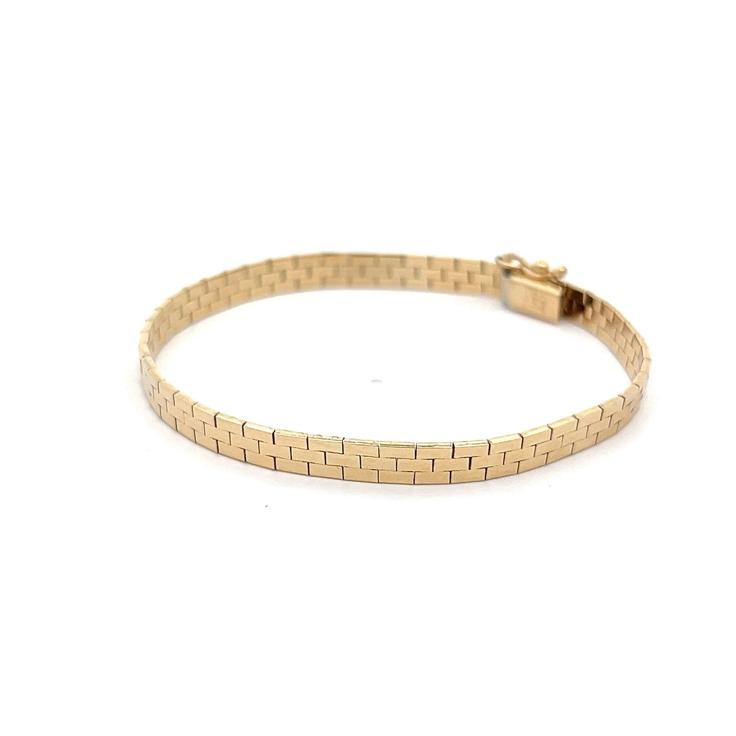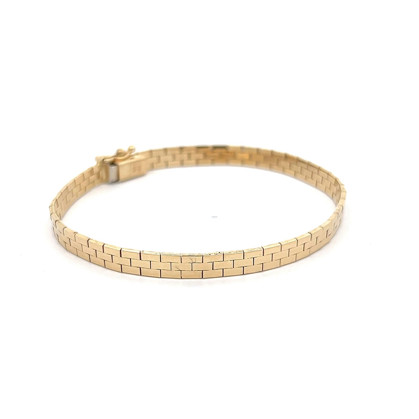 This modern bracelet features a sleek flat link design in 14k yellow gold. The flat links are reminiscent of brick layers that add a touch of texture to the piece. The bracelet is very stackable and easy to wear. Another versatile piece, this bracelet can be dressed up or down and is a great addition to any collection.