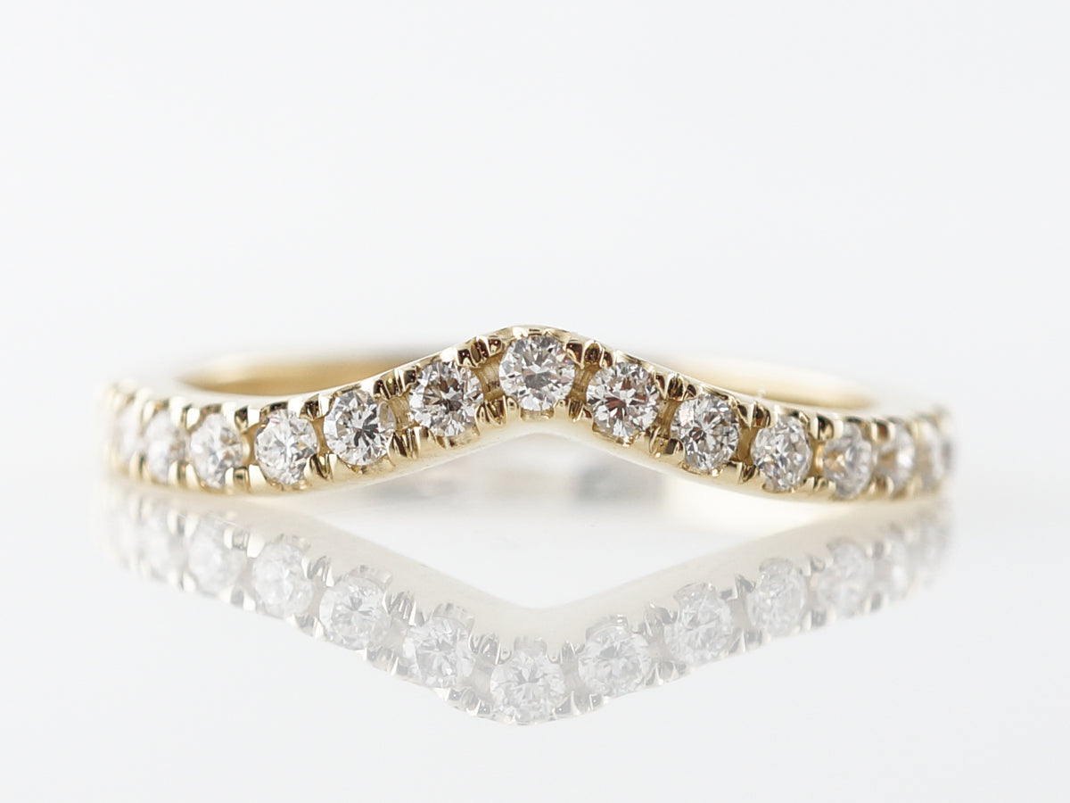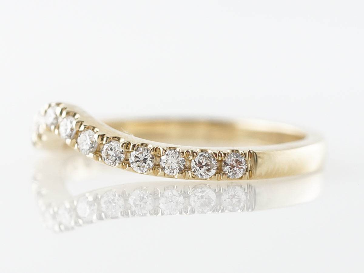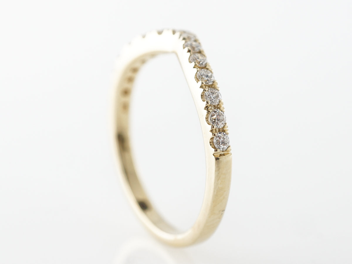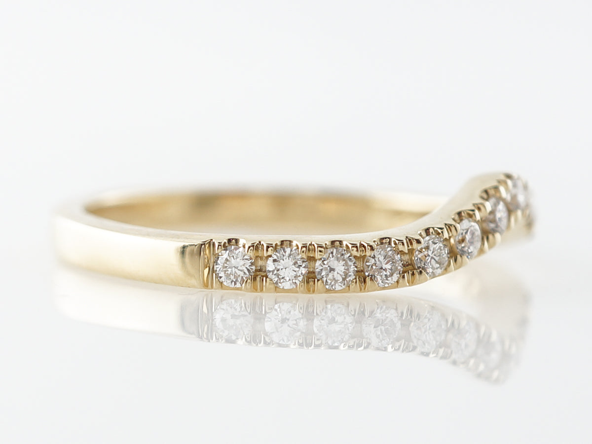 Gently Curved Diamond Band in 14k Yellow Gold. This curved diamond wedding band is finished in 14 karat yellow gold. The curve in the band features lovely bead setting that gives a nice border on each side and allows a wider engagement ring to fit closely against the band. The band features fifteen (15) round brilliant diamonds bead set in a single line for a total weight of .28 carats.
