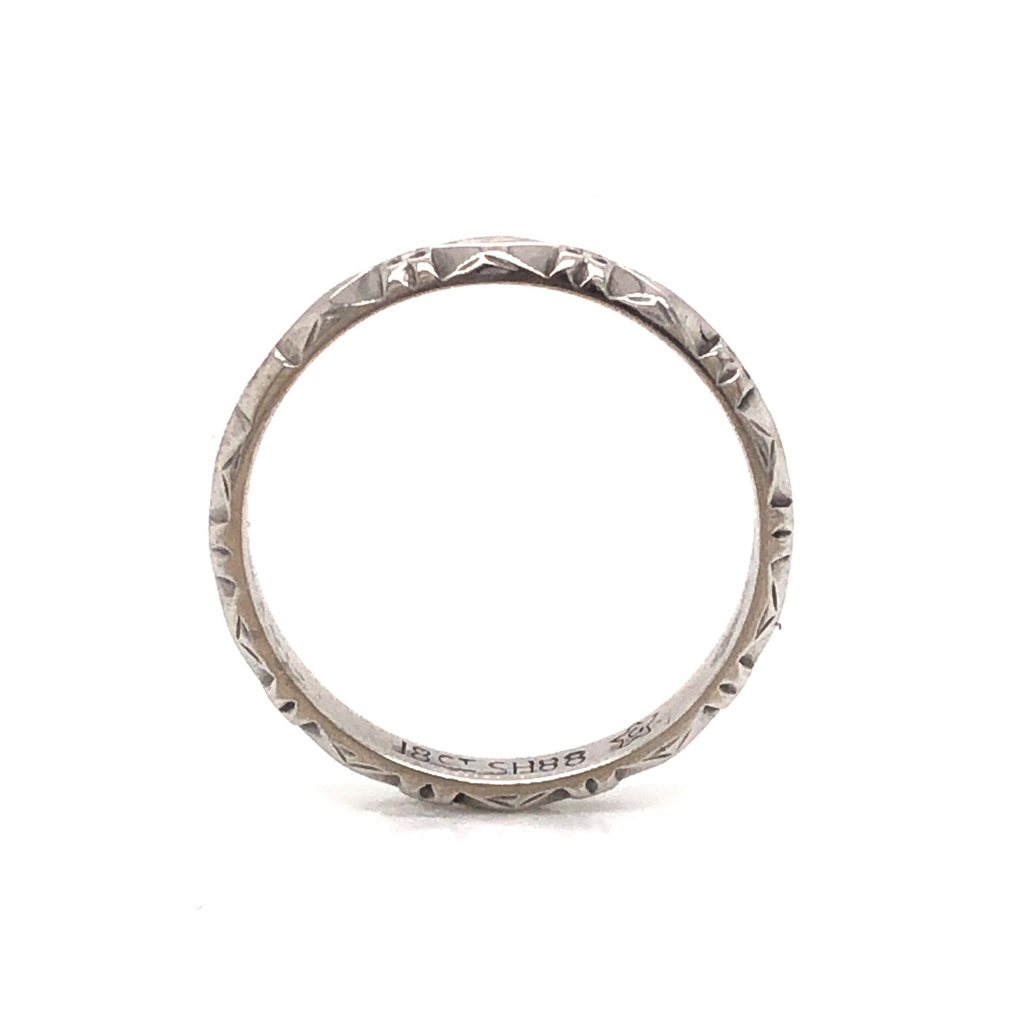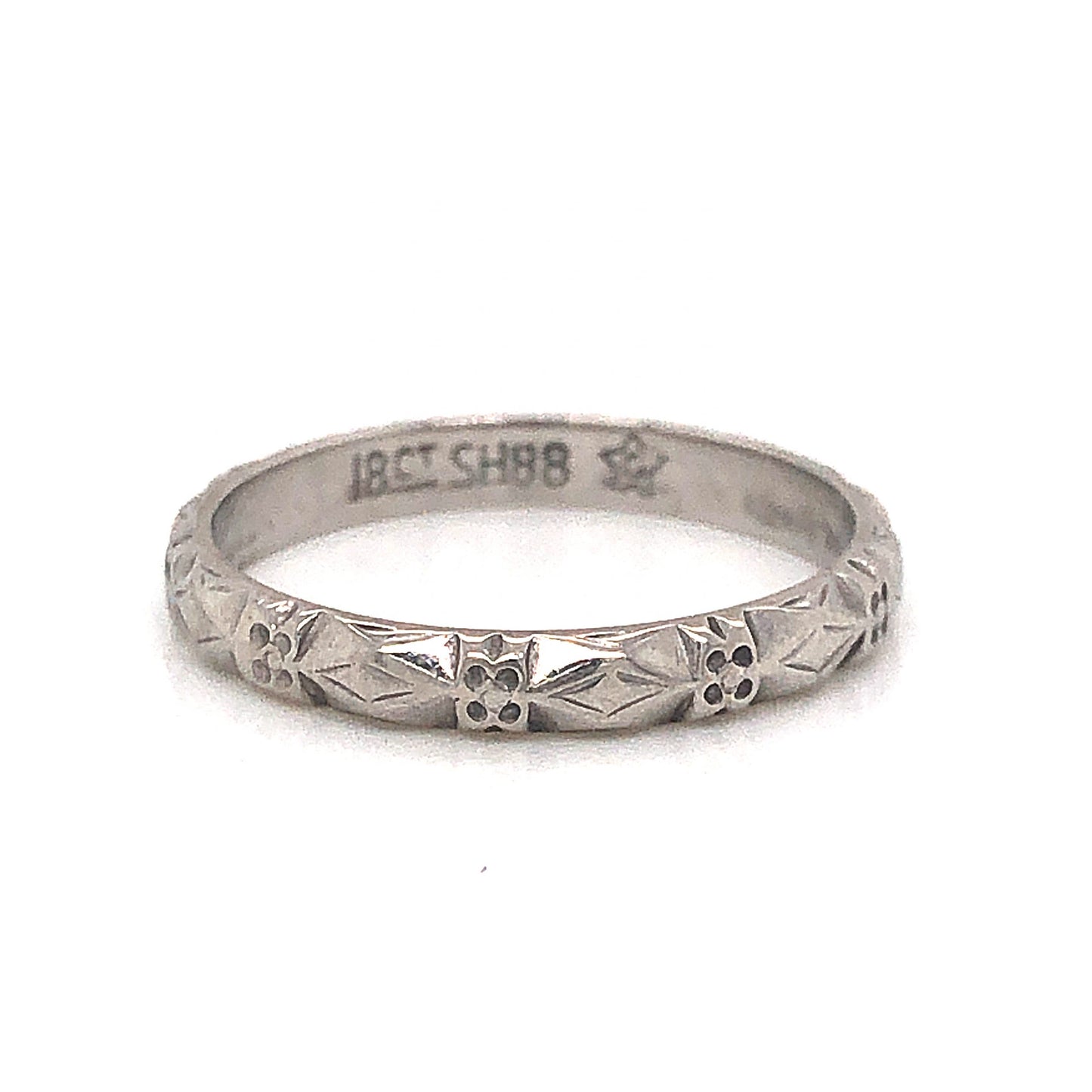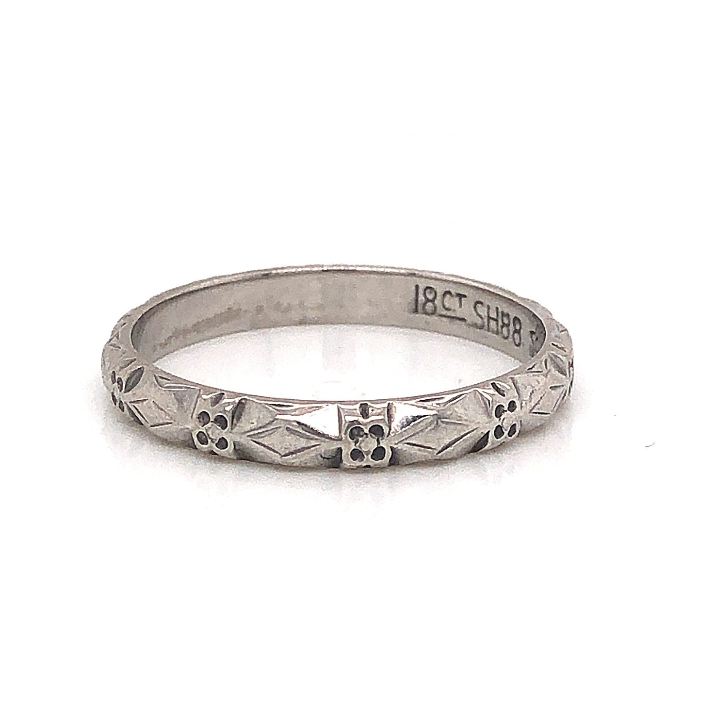 This Art Deco wedding band features structured floral engravings finished in shimmering 18 karat white gold. The antique wedding band measures 2.70mm wide and has a one of a kind engraved pattern around the entire ring. Lozenges and florets punctuate the band. This stylish and stackable ring reaches 1.35 mm about the finger and is finished in high polished 18K white gold.