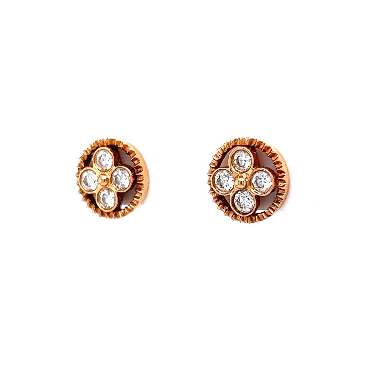 Geometric Diamond Cluster Earrings in Rose Gold. These adorable diamond cluster earrings feature .24 carats of round brilliant cut diamonds set in 14 karat rose gold. The neat clusters hold four diamonds evenly amid a ring of dainty little spines pointed upwards.