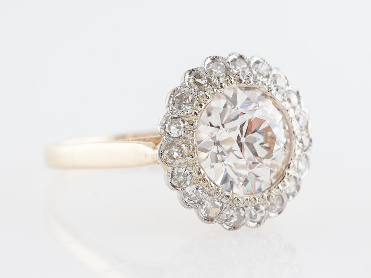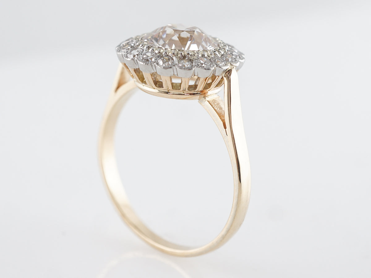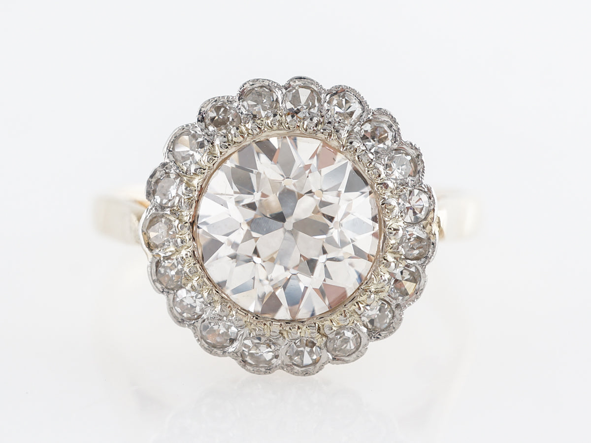 GIA European Cut Diamond Engagement Ring in 14K. This magnificent Victorian engagement ring features a 1.58 carat Old European cut diamond set in 14 karat yellow gold and platinum. The VS2 clarity center stone is GIA certified and set inside a lovely halo of Old Mine cut diamonds. The simple shank and regal crown basket are the finishing touches to this amazing vintage engagement ring.