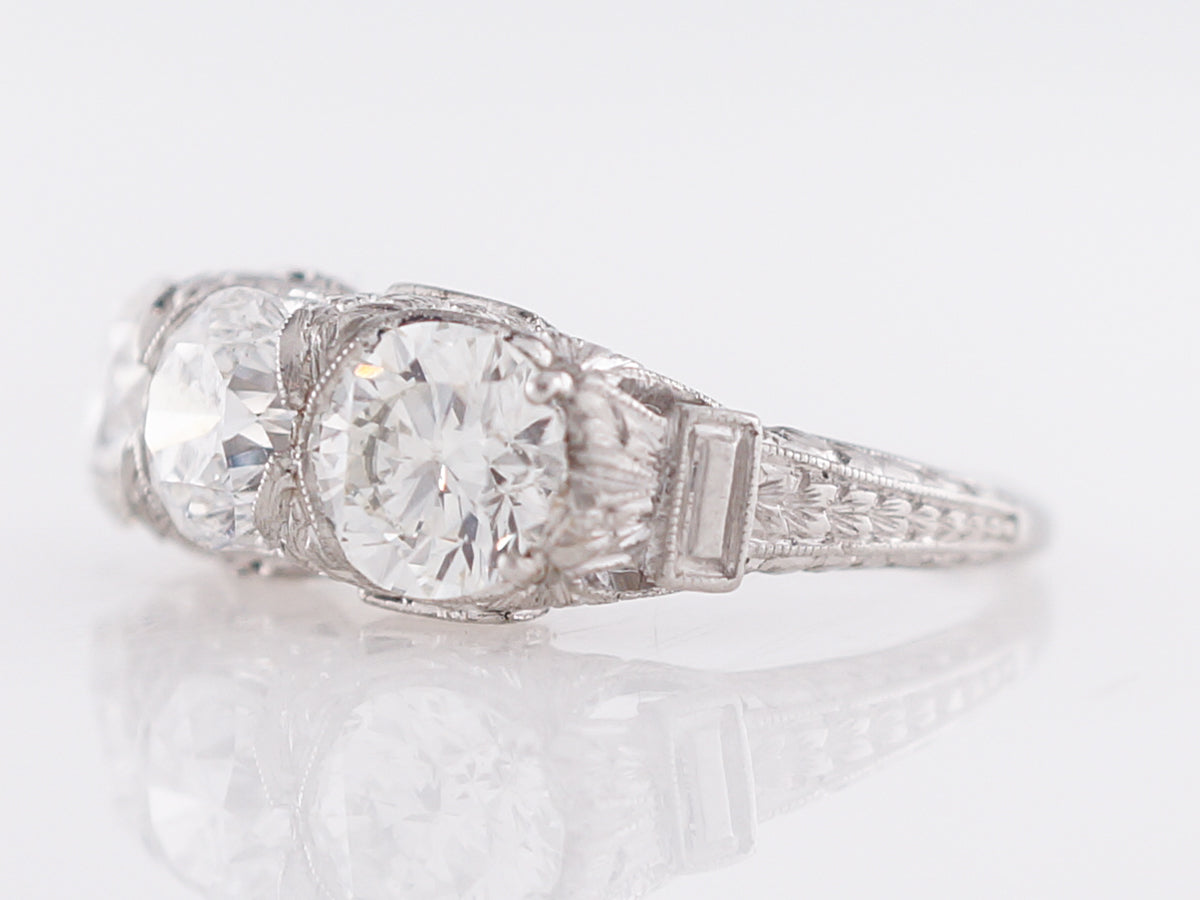 GIA Three Stone Diamond Engagement Ring in Platinum. This modern engagement ring is a stunning take on the three stone design. Three 1.00 carat GIA certified round brilliant diamonds are set across the top and provide an incredibly elegant look. Additionally, immaculate engraving adorns the shoulders and undercarriage and provide a wonderful antique aesthetic to the ring.