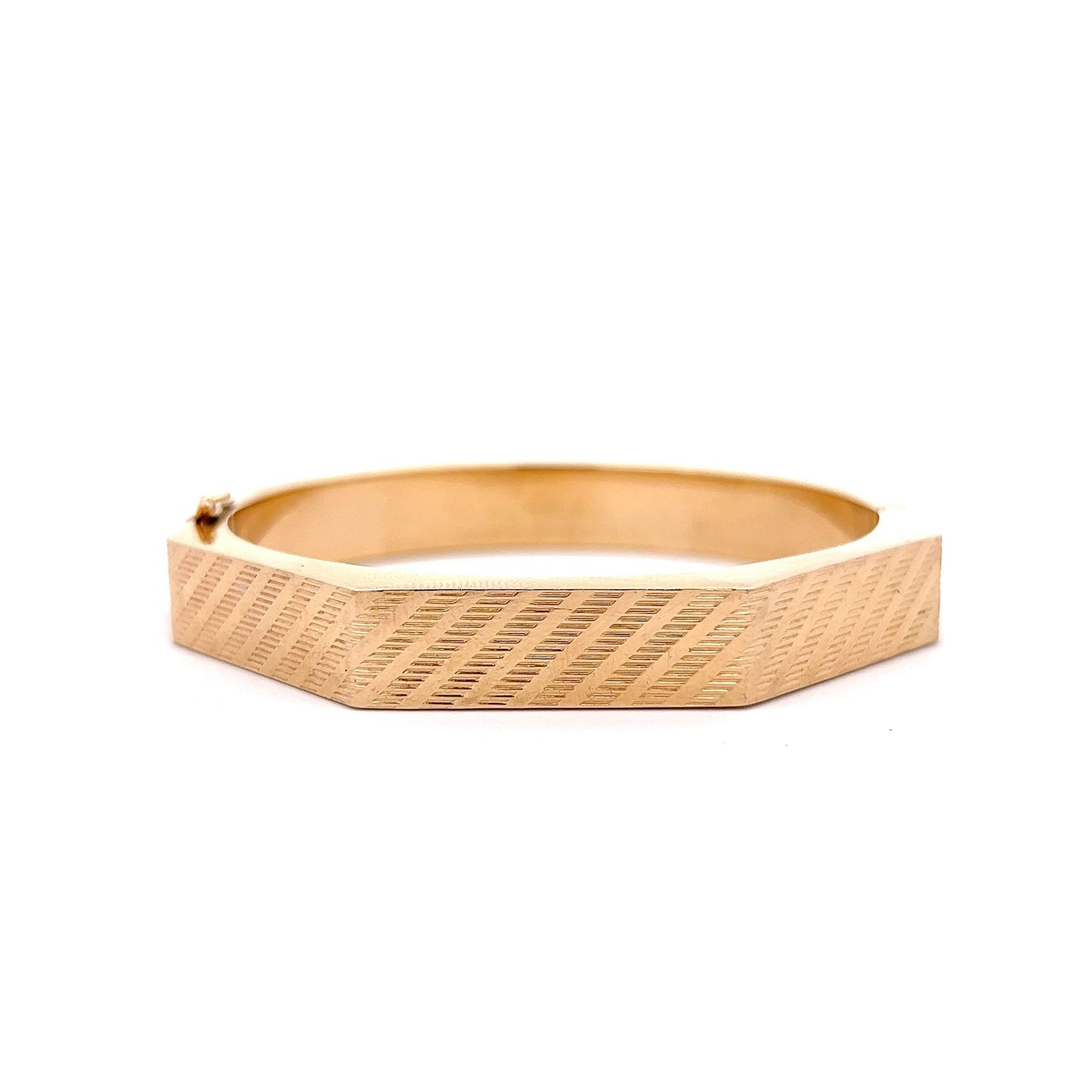 This modern bangle bracelet is crafted in luxurious 14 karat yellow gold with a unique octagonal shape and textured finish. The bold yellow gold is richly radiant with a subtle shimmer, perfect for making a chic statement. The octagonal shape ensures a comfortable fit and adds a unique touch of style to the bracelet.