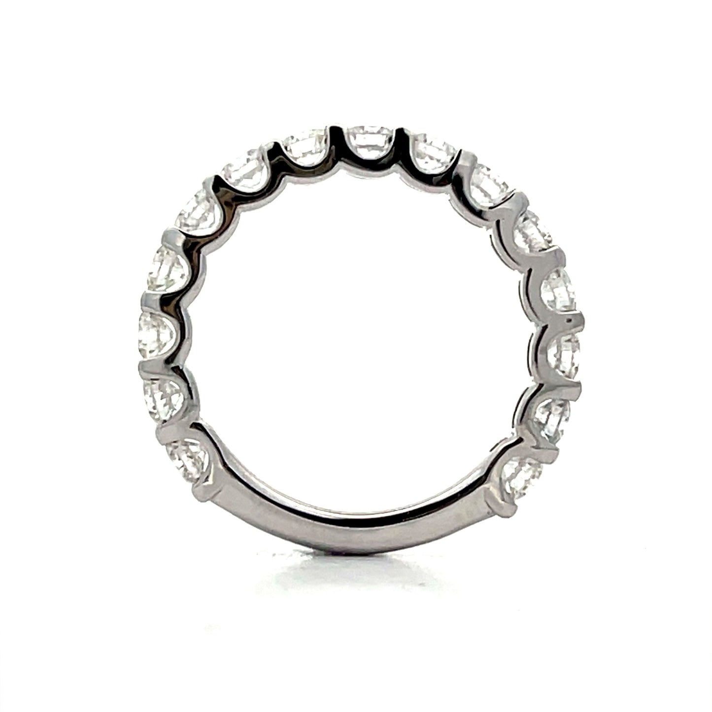 This 18 karat white gold wedding band brings a clean, modern look with an undeniable sparkle. Crafted as a 3/4 eternity band, it features round brilliant cut diamonds set in a shared prong design, allowing light to flow through each stone and creating a continuous shimmer. With VS2 clarity and G-H color grade, these diamonds offer a bright, eye-catching display against the polished white gold band. Perfect as a standalone piece or paired with an engagement ring, this band is an elegant choice for those who appreciate refined shine and simplicity in design.