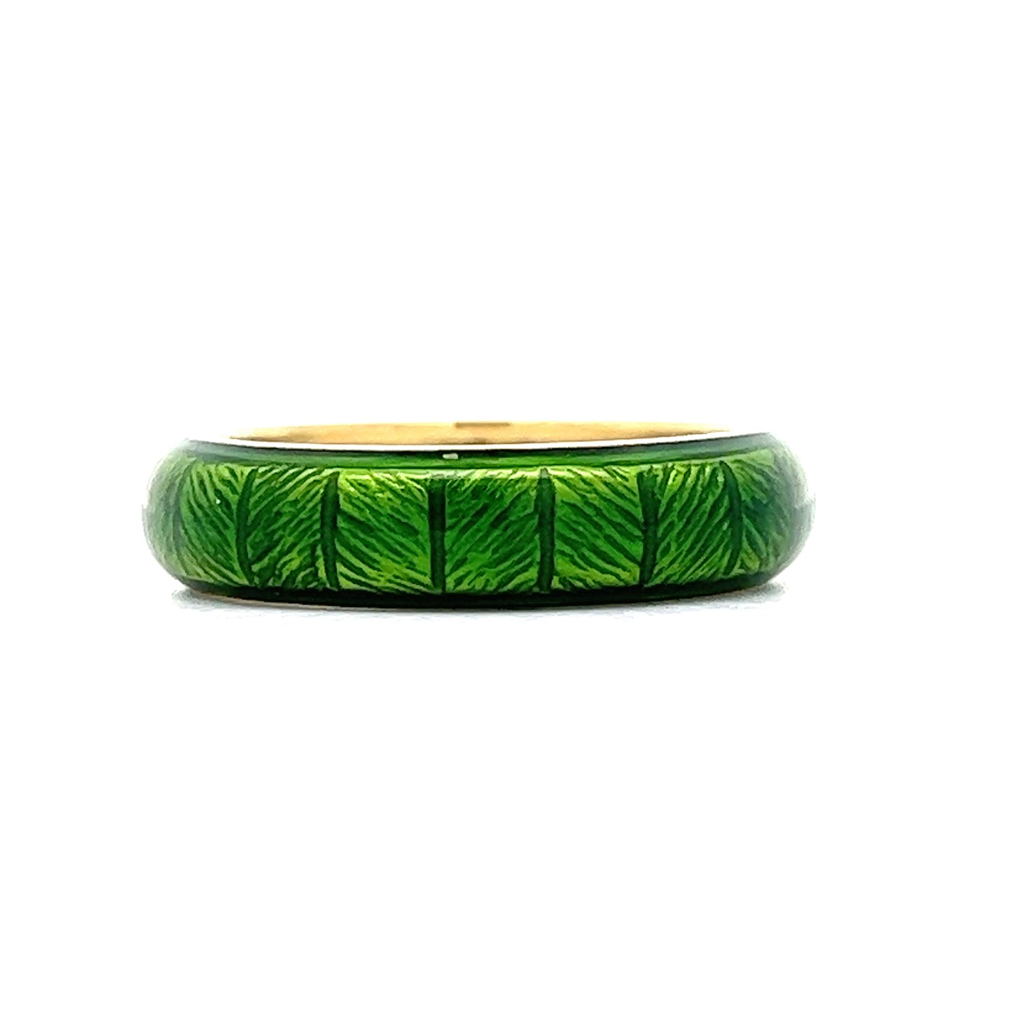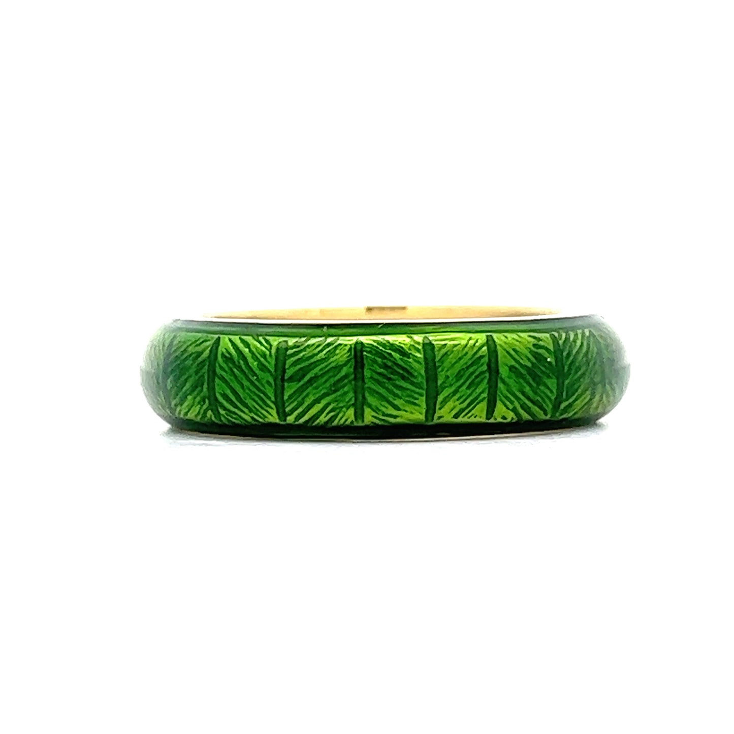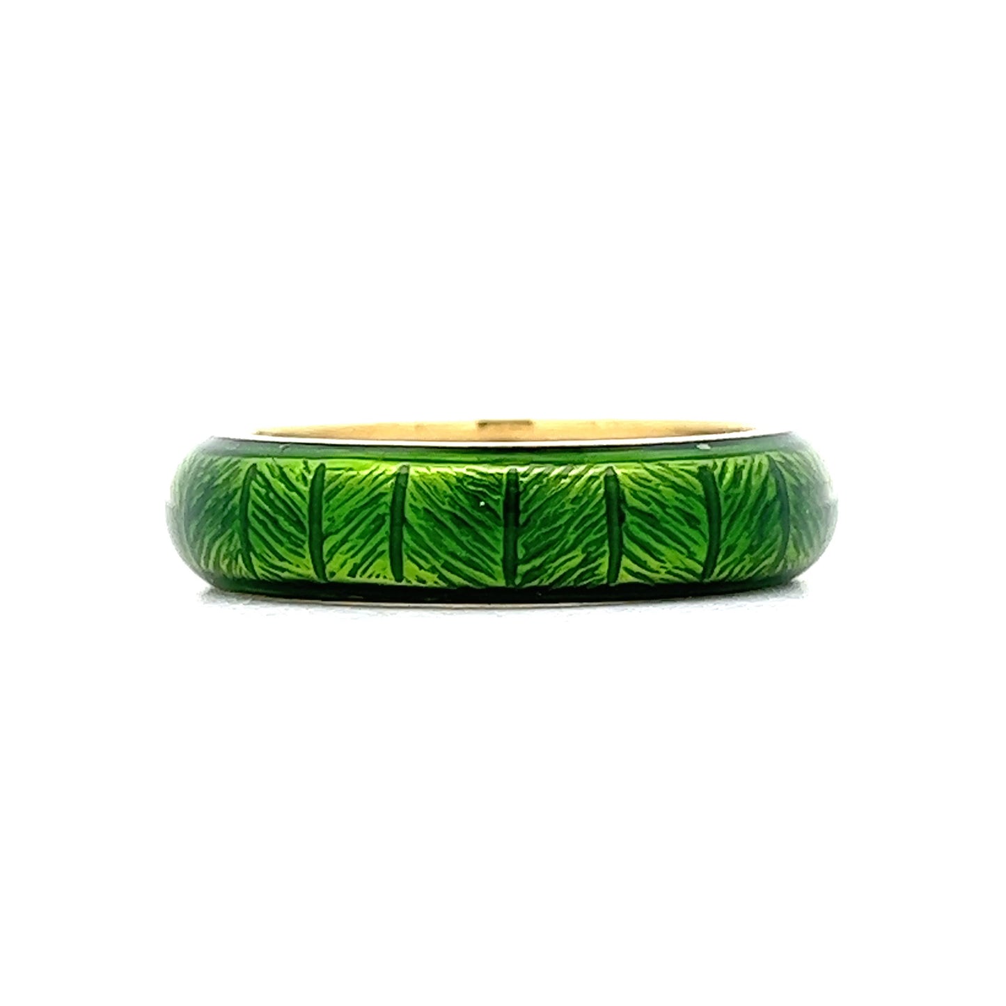Crafted in 18 karat yellow gold, this ring features a linear textured design with an eye-catching green enamel. The smooth polished gold is contrasted by the bright green enamel, making it a perfect way to add a bit of unique color!