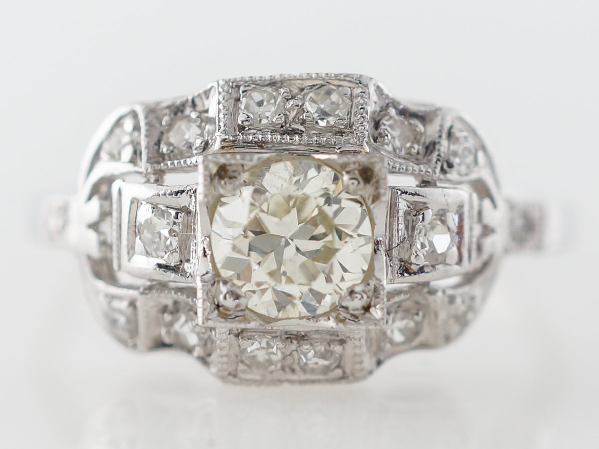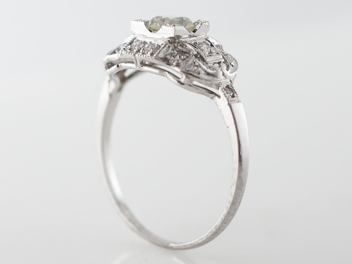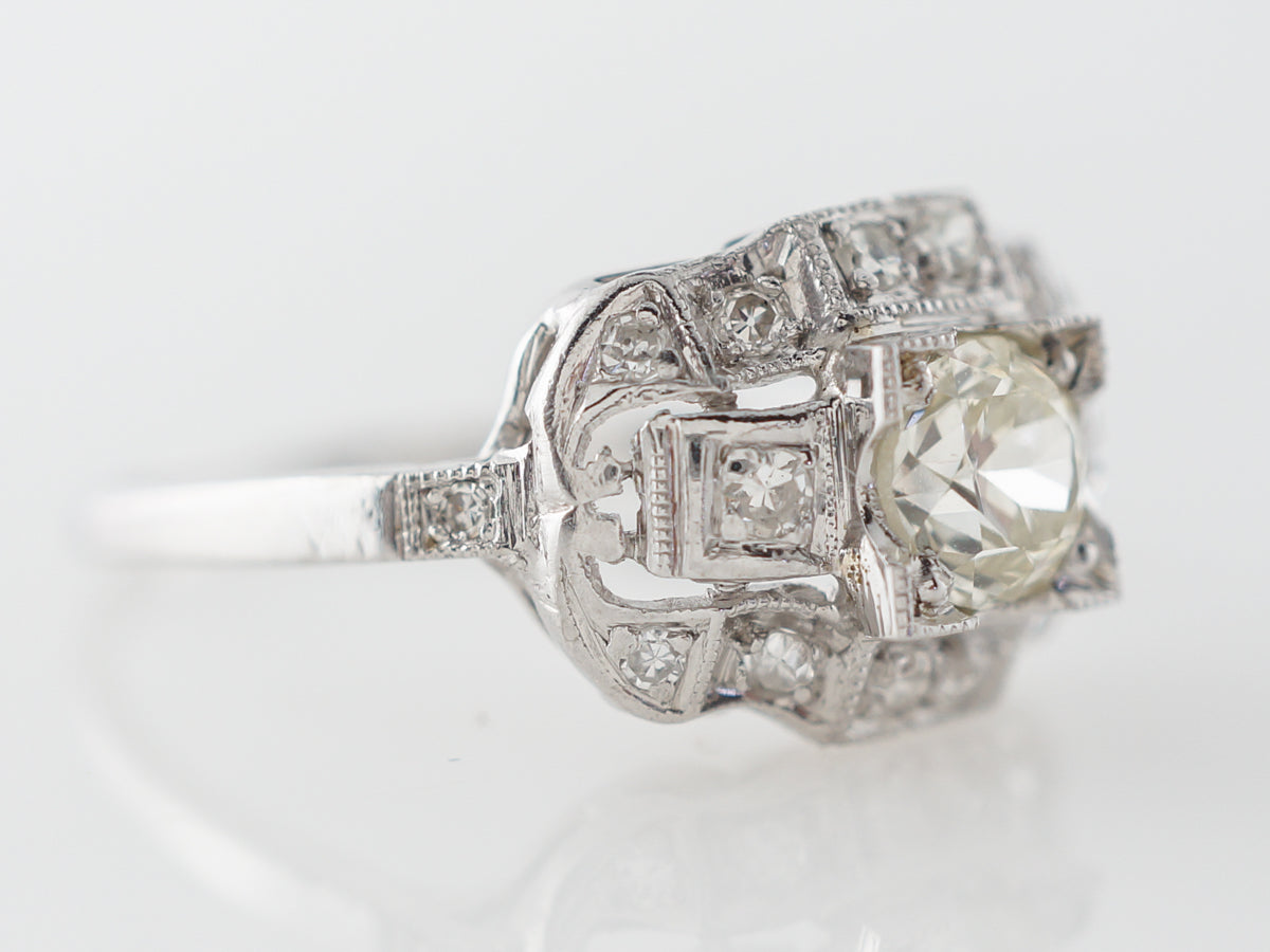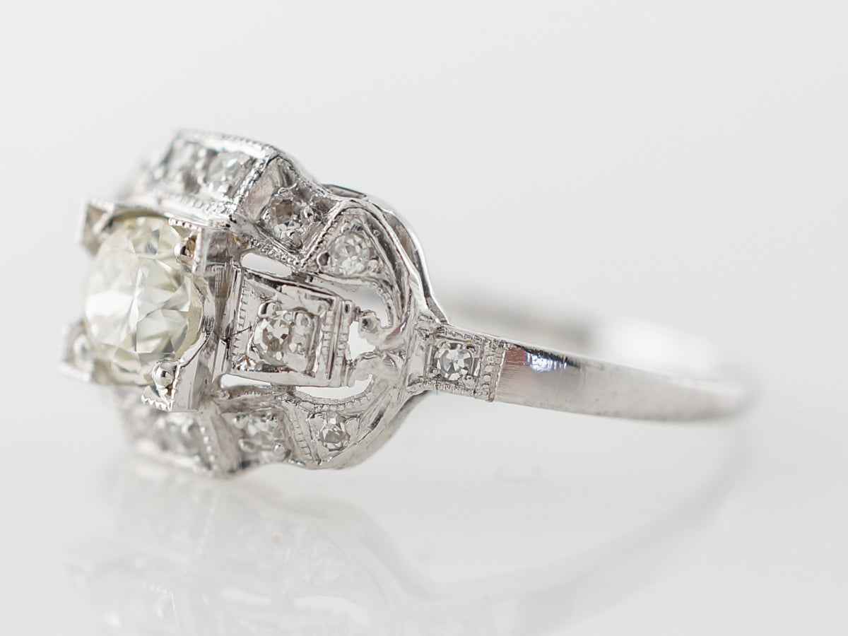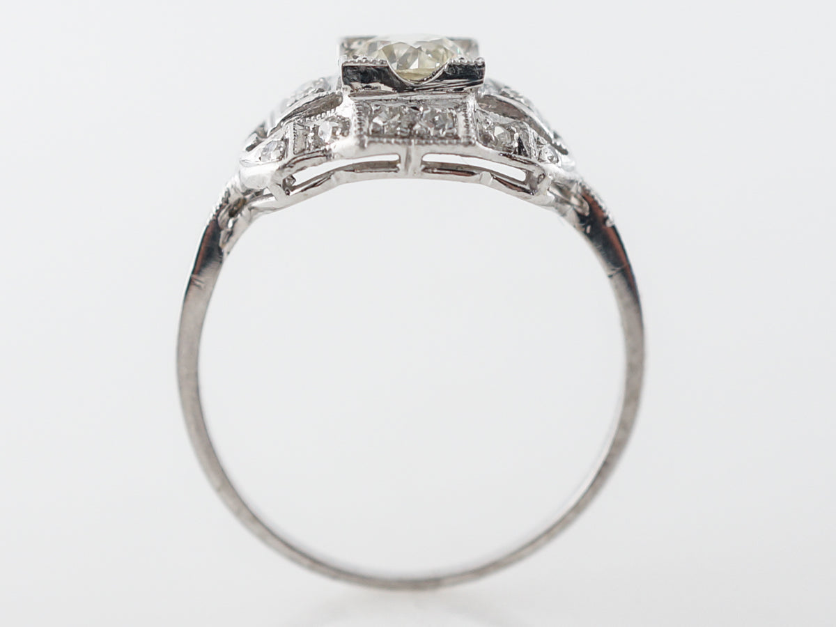 Half Carat Euro Diamond Engagement Ring in Platinum. This original antique Art Deco diamond ring is set with a .53 carat warm old European cut diamond surrounded by round single cut diamonds. The wide diamond ring has great presence with great impact.
