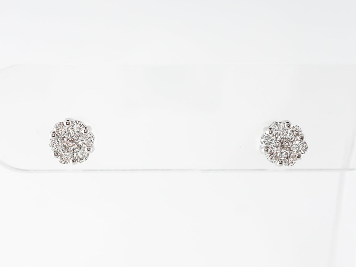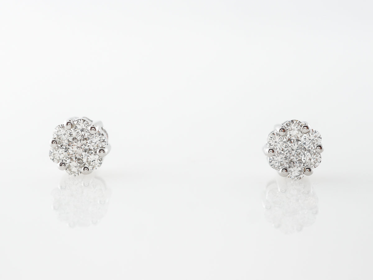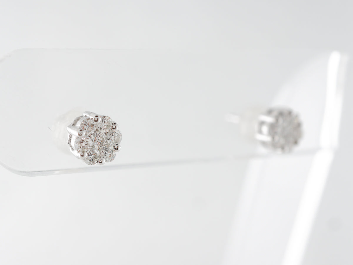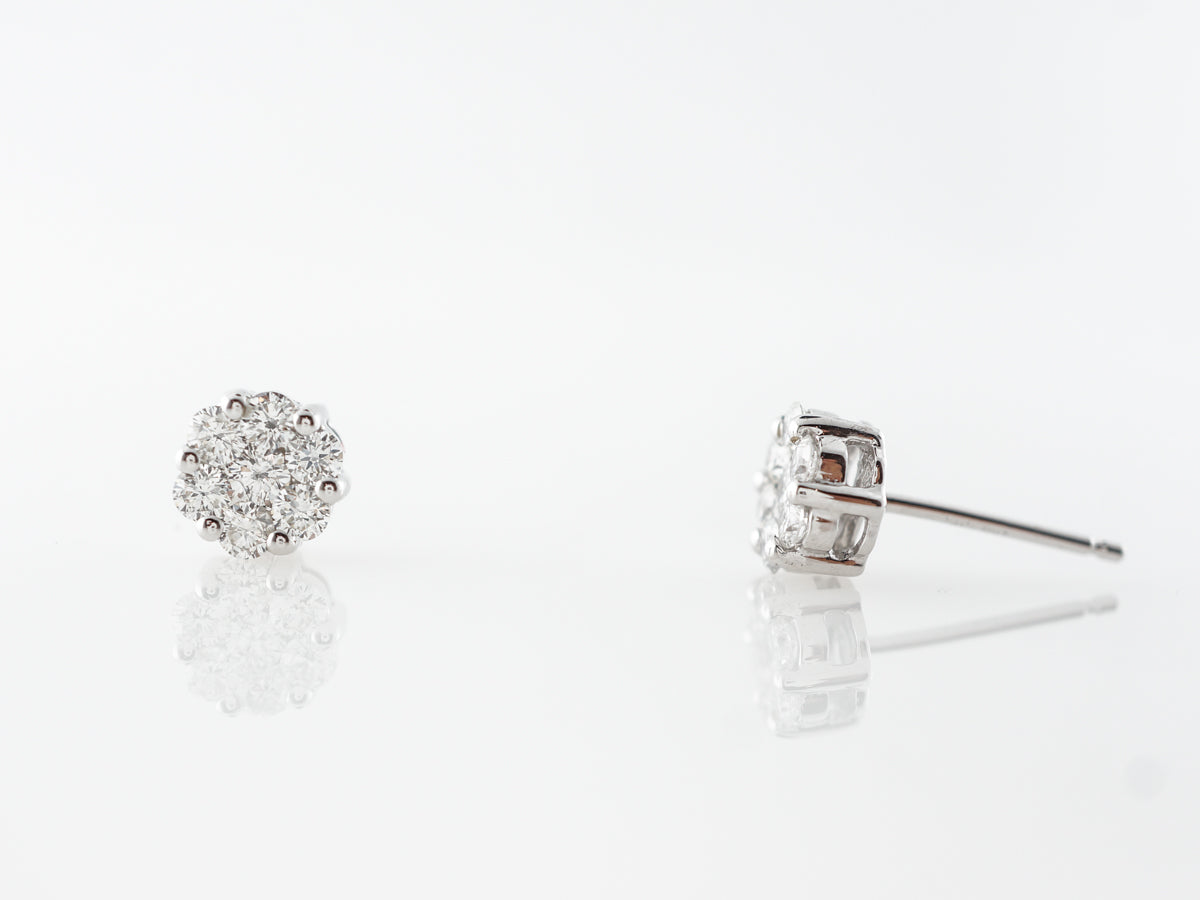 Half Carat Pave Diamond Earring Studs in White Gold. These pave stud earrings contain .58 carats of diamonds and are set in 14 karat white gold. Diamond studs are staple for every jewelry collection and these pave studs are perfect for everyday wear.
