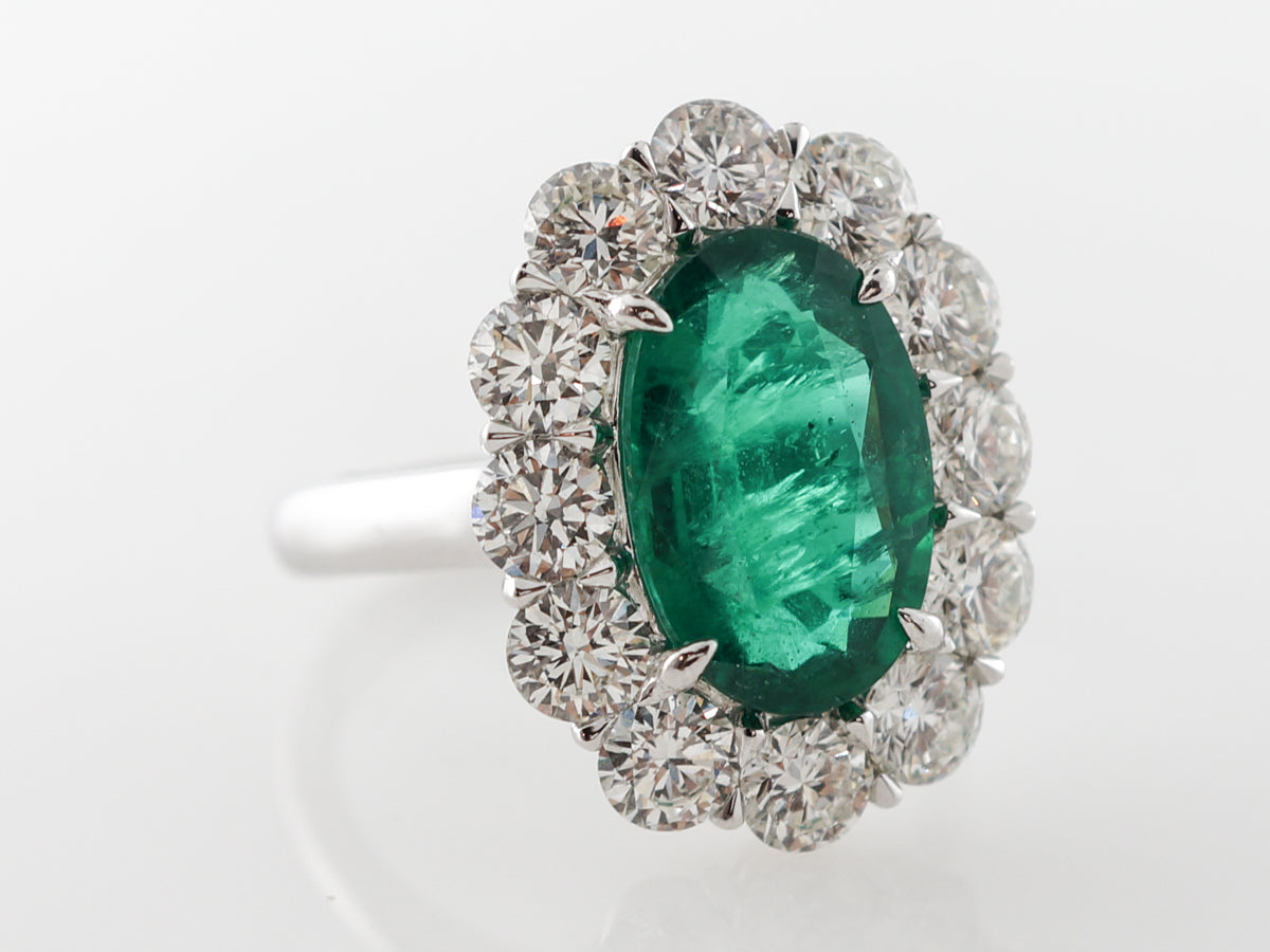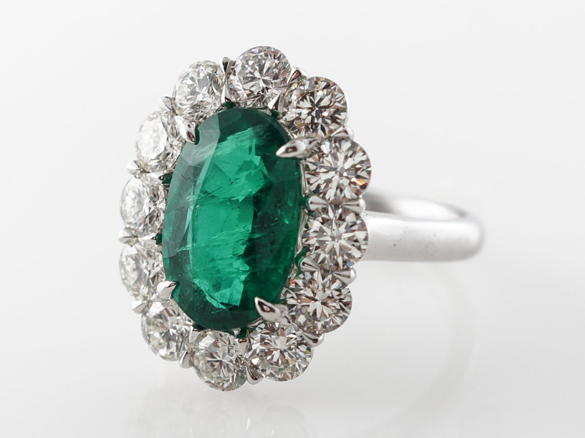 Halo Style Emerald Diamond Cocktail Ring Platinum. This stunning emerald and diamond cocktail ring features an amazing oval shaped emerald which is prong set and wreathed in a halo of 2.18 carats of Round Brilliant Cut diamonds. Set in platinum, this rings design is simple and elegant, emphasizing the beauty of the gemstones. This ring would be a fabulous gift and cherished in any collection.