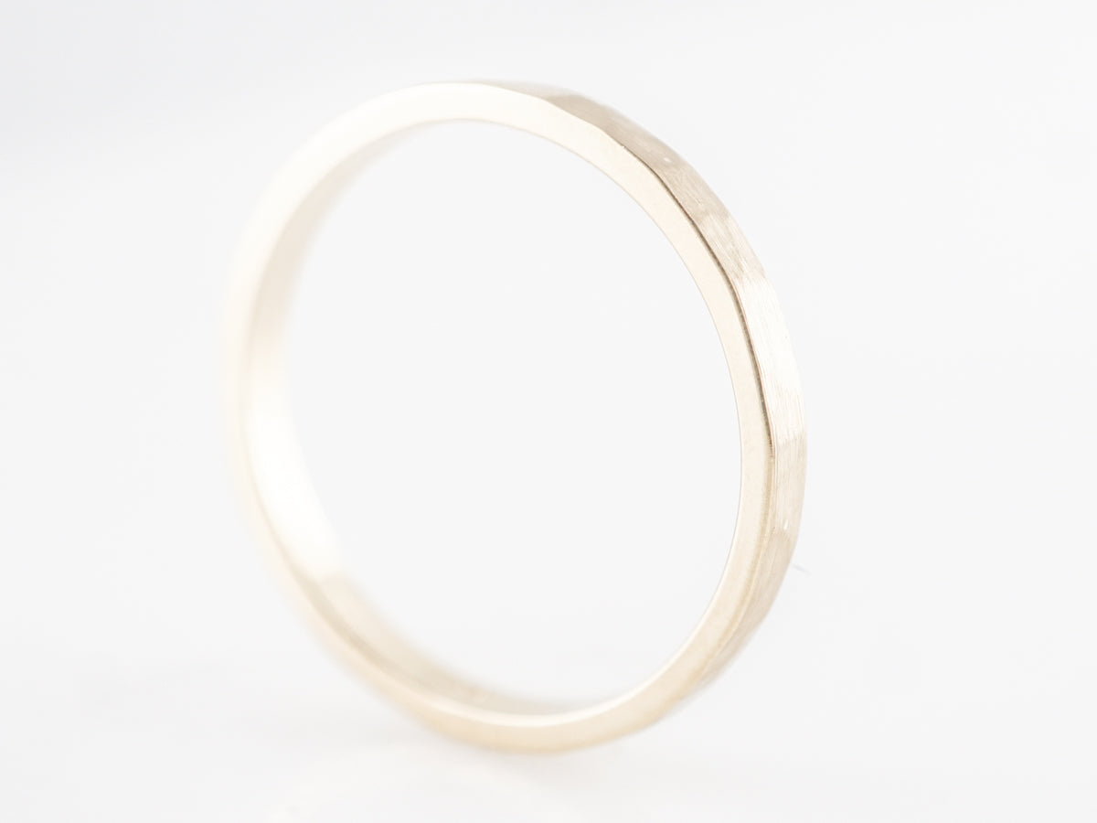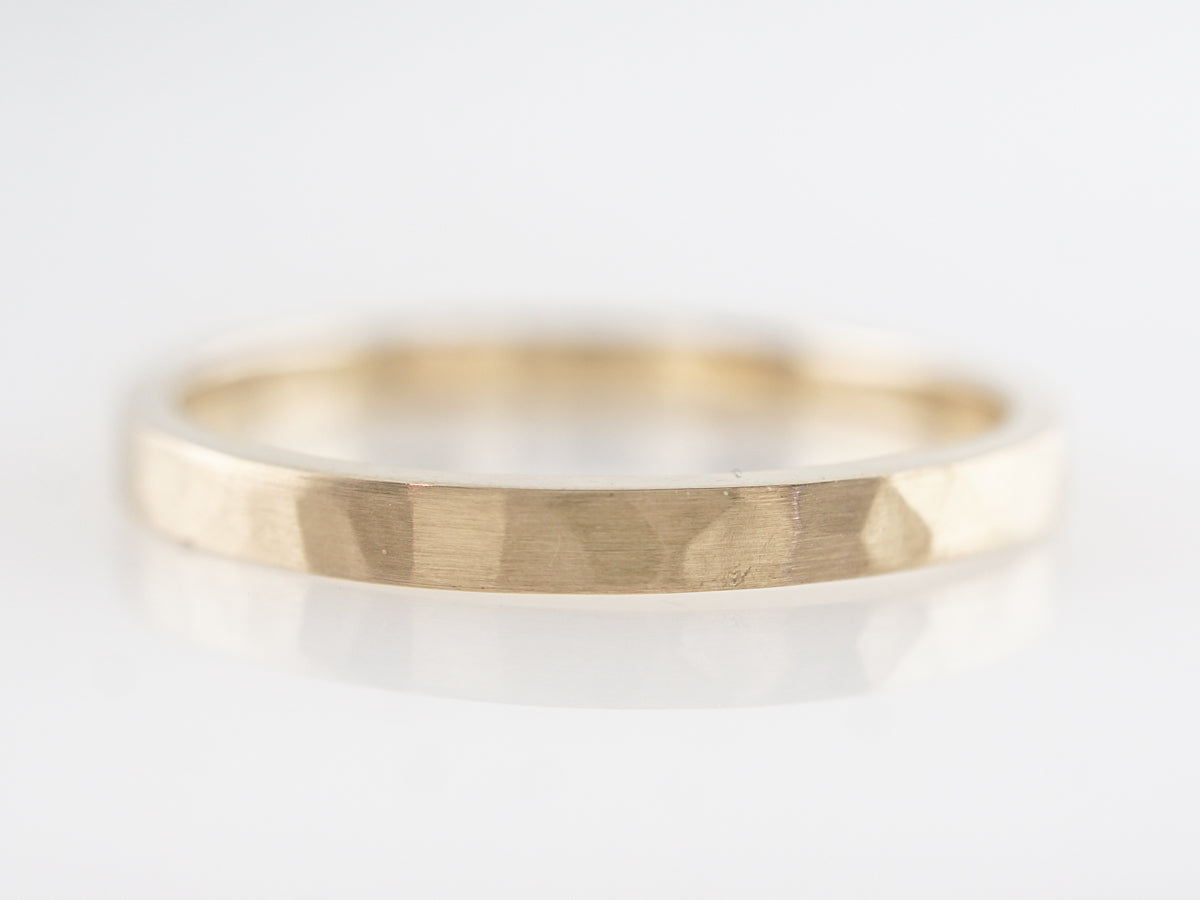 Hammered Finish Wedding Band in 14k Yellow Gold. This modern flat wedding band is finished in 14 karat yellow gold and has a lovely texture. Made with a nice hammered finished this band gives off a nice minimalist style that will add some charm to your stack.