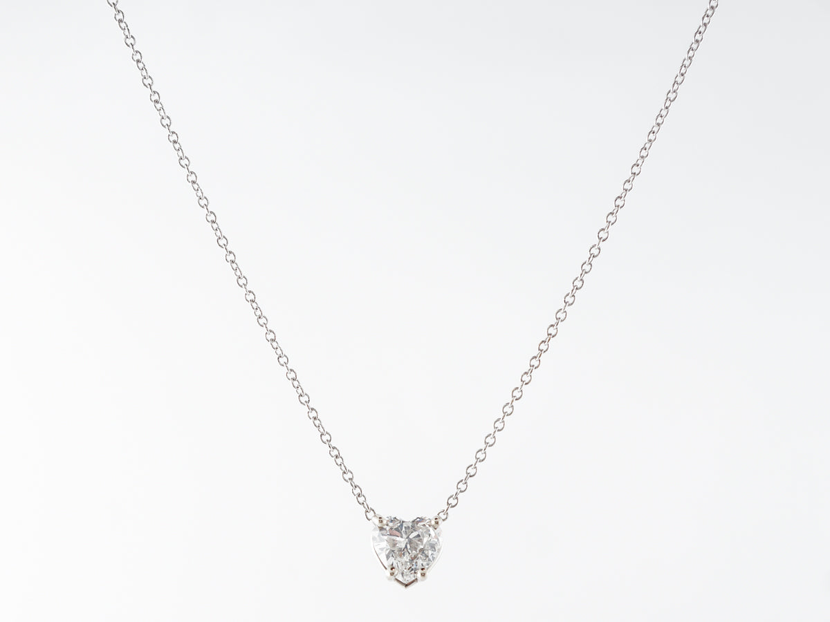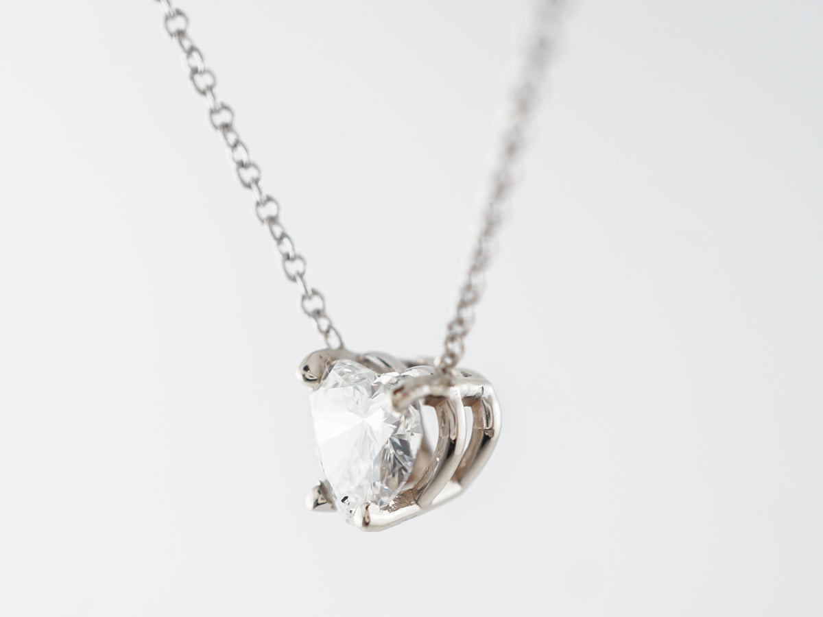 This modern necklace features a .79 carat heart shaped diamond in 14 karat white gold. The diamond is bead set and attached to an 8 inch chain. This would be a great gift and would be perfect for everyday wear.
