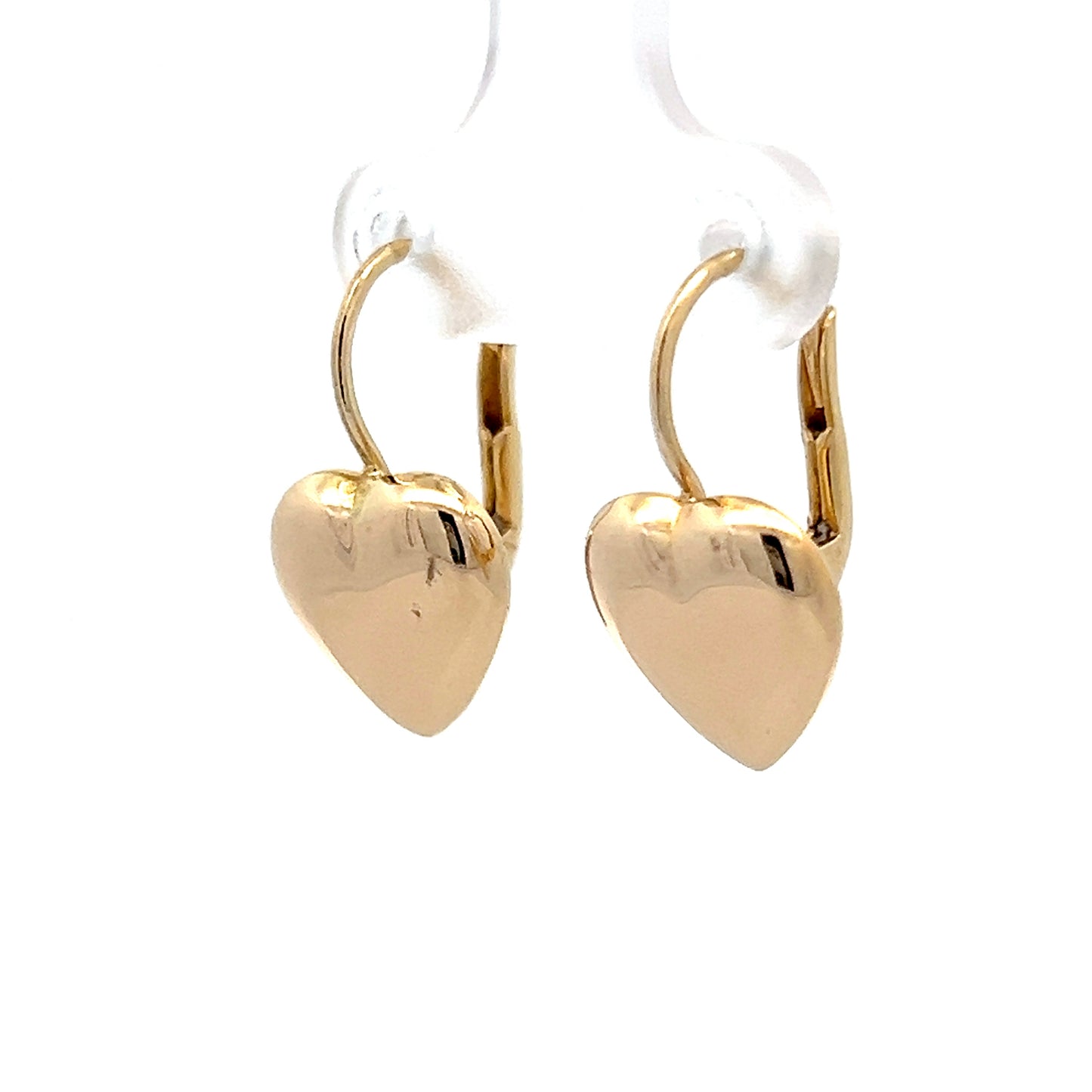 Check out our heart drop earrings that put a fun spin on love! They feature a puffy heart shape made from shiny 14 karat yellow gold and hang gracefully from secure lever backs. The design gives off a playful vibe while catching the light from every angle. These earrings work great as a gift or a little treat for yourself, adding a pop of fun to your style. With their lively charm and bold look, they bring extra joy to your day