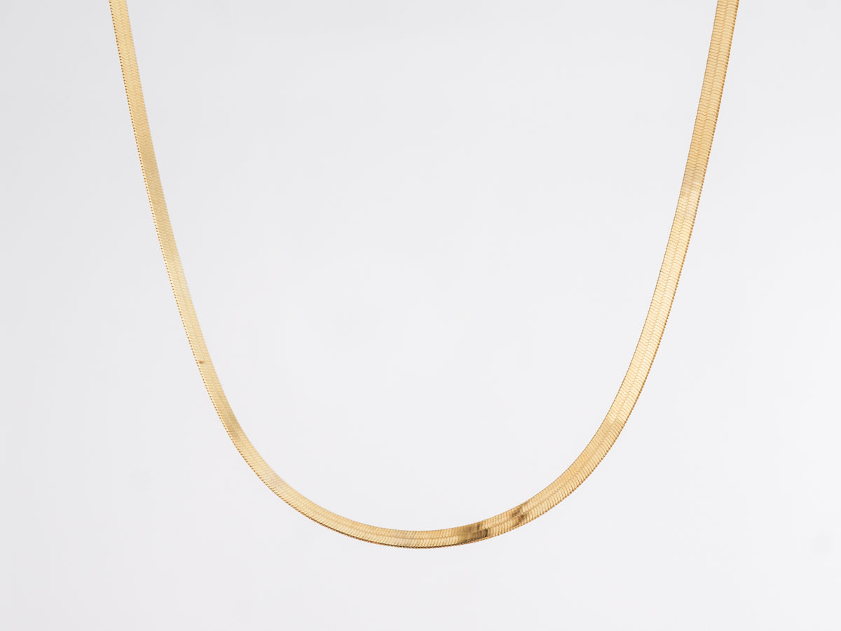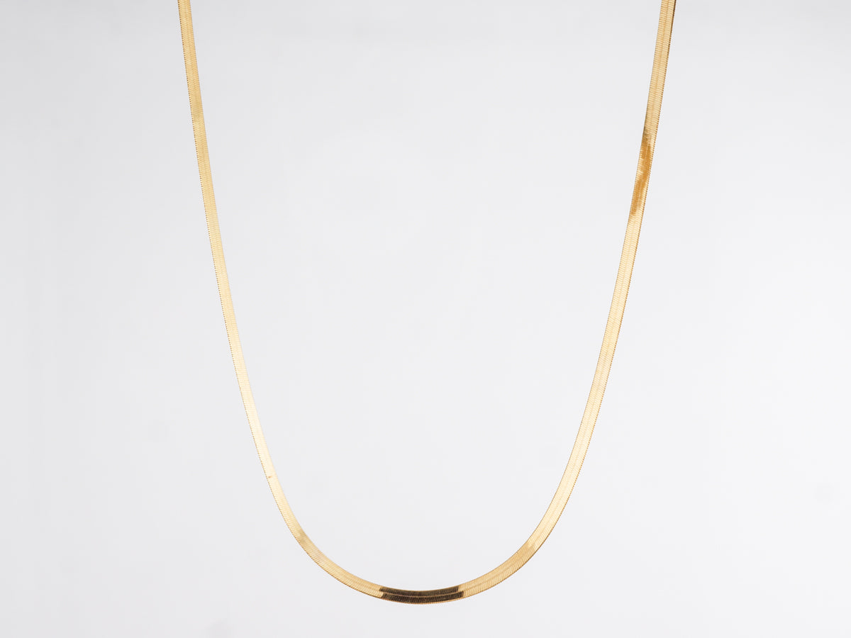 Herringbone Yellow Gold Necklace 18 inches Length in 10k. A sleek herringbone necklace that is finished in 10 karat yellow gold. Measuring 18 inches in length, you could wear this with a couple more chains for a very trendy look.