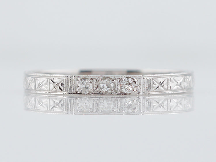 This original antique Art Deco diamond wedding band is set with three (3) old European cut diamonds. The band features crisp geometric engraving around the length of the band while the inside edges are engraved with a light, scrolling organic design.
