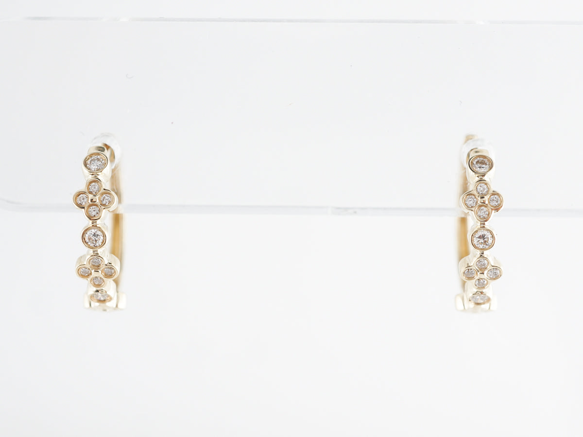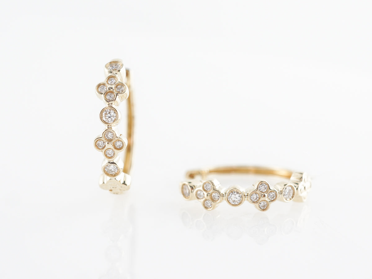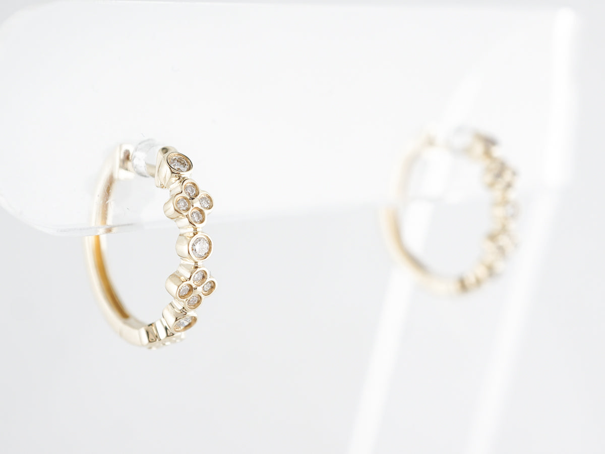 Hoop Diamond Cluster Earrings in 14k Yellow Gold. These cute little hoop earrings feature .095 carats of round brilliant cut diamonds set in 14 karat yellow gold. Small enough to wear while you’re active, everyone needs a cute pair of everyday earrings like this!