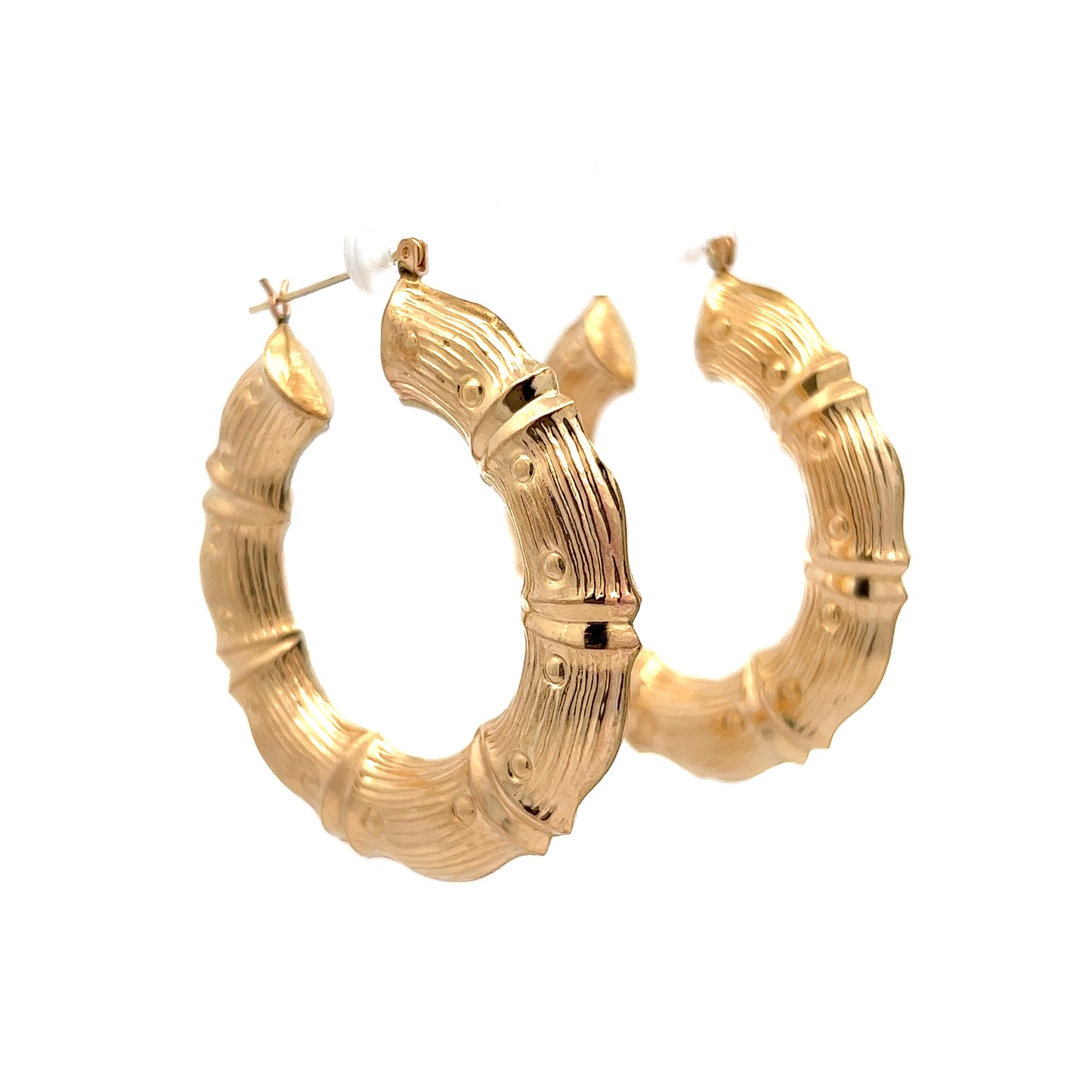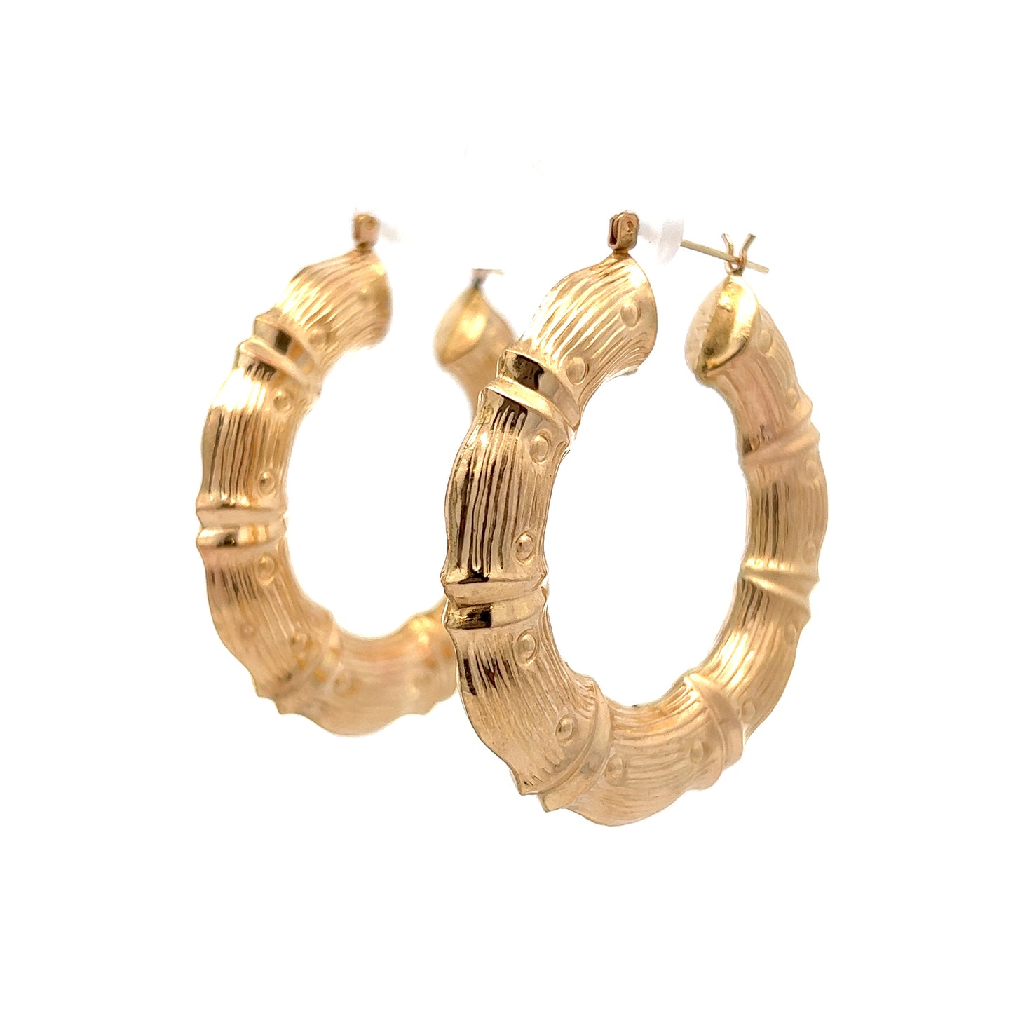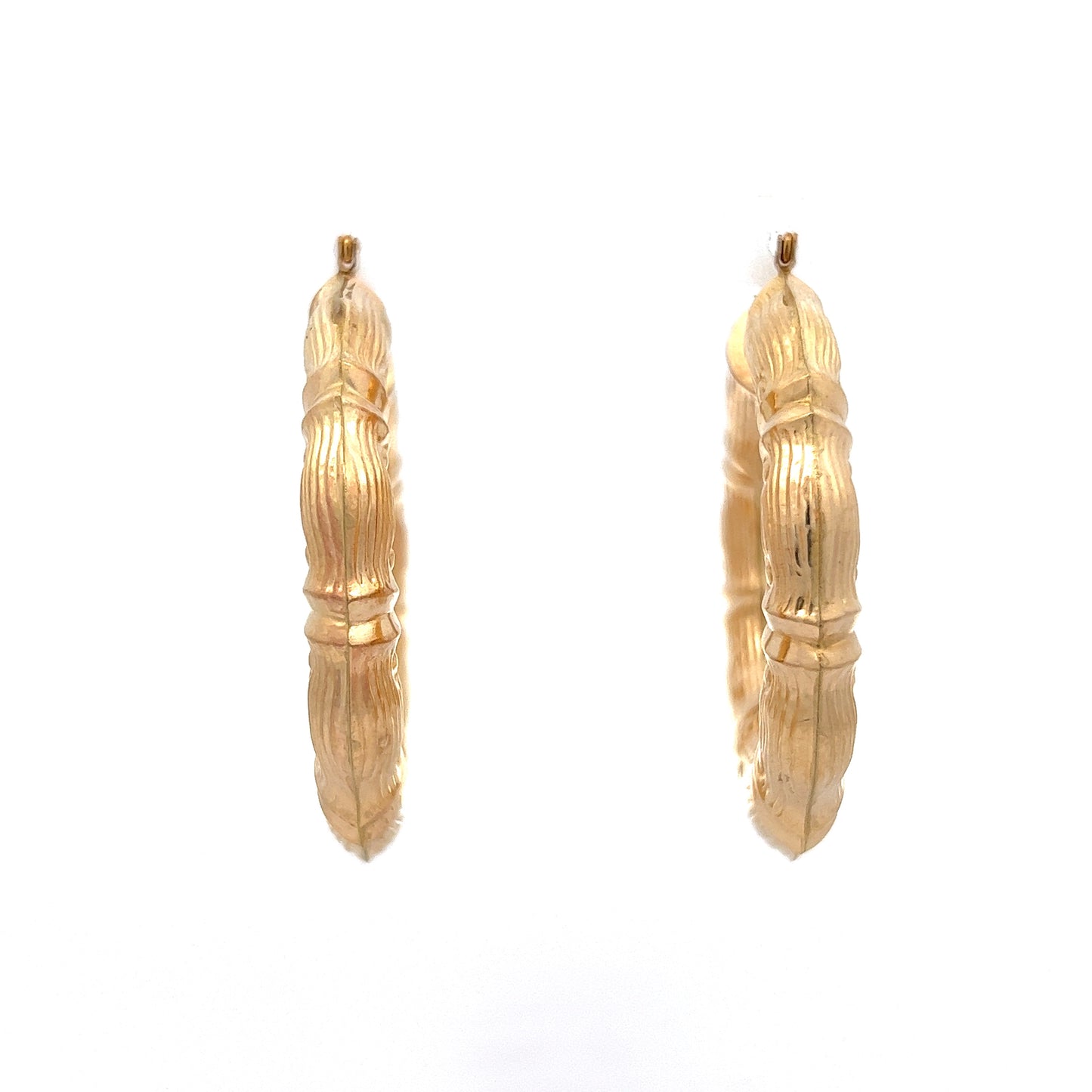 These modern statement earrings are sure to make a statement! Crafted from 10 karat yellow gold, these hoop earrings feature a polished gold finish and bamboo-textured design. These unique earrings measure 1.5 inches in length, creating an eye-catching look. Perfect for any day or night look, this classic-meets-modern design makes these earrings a must-have. Get ready to turn some heads with these beautiful and unique hoop earrings!