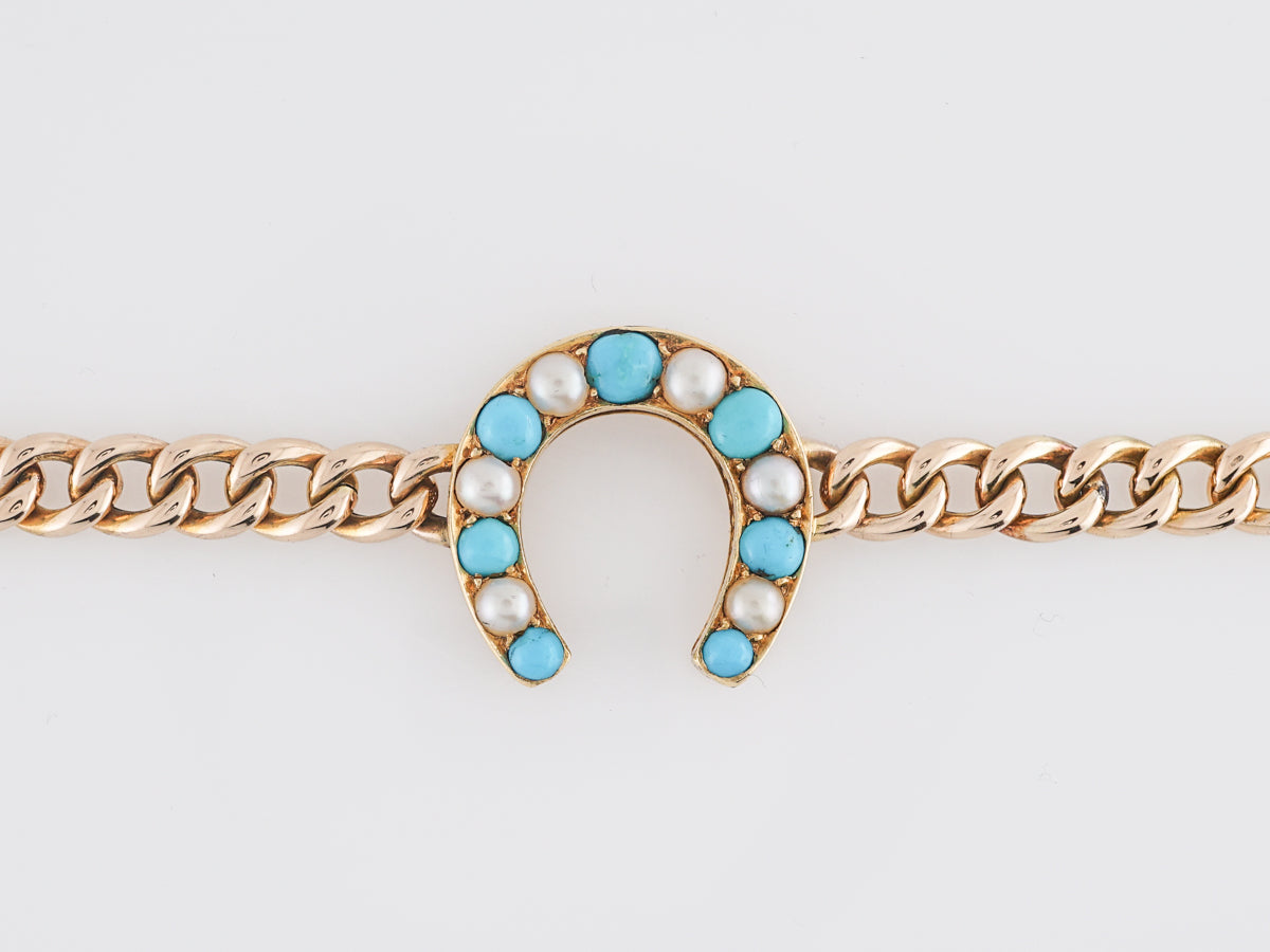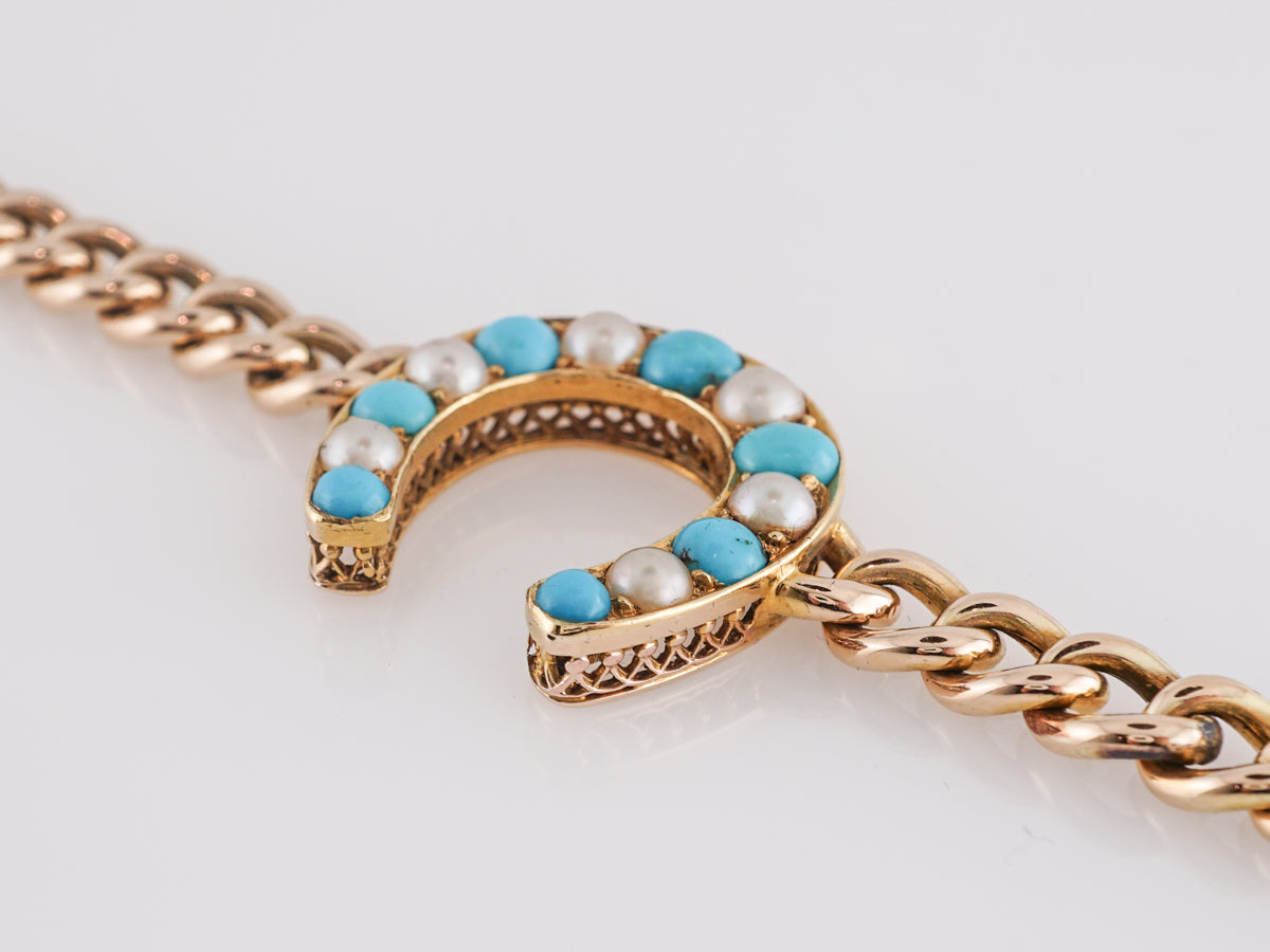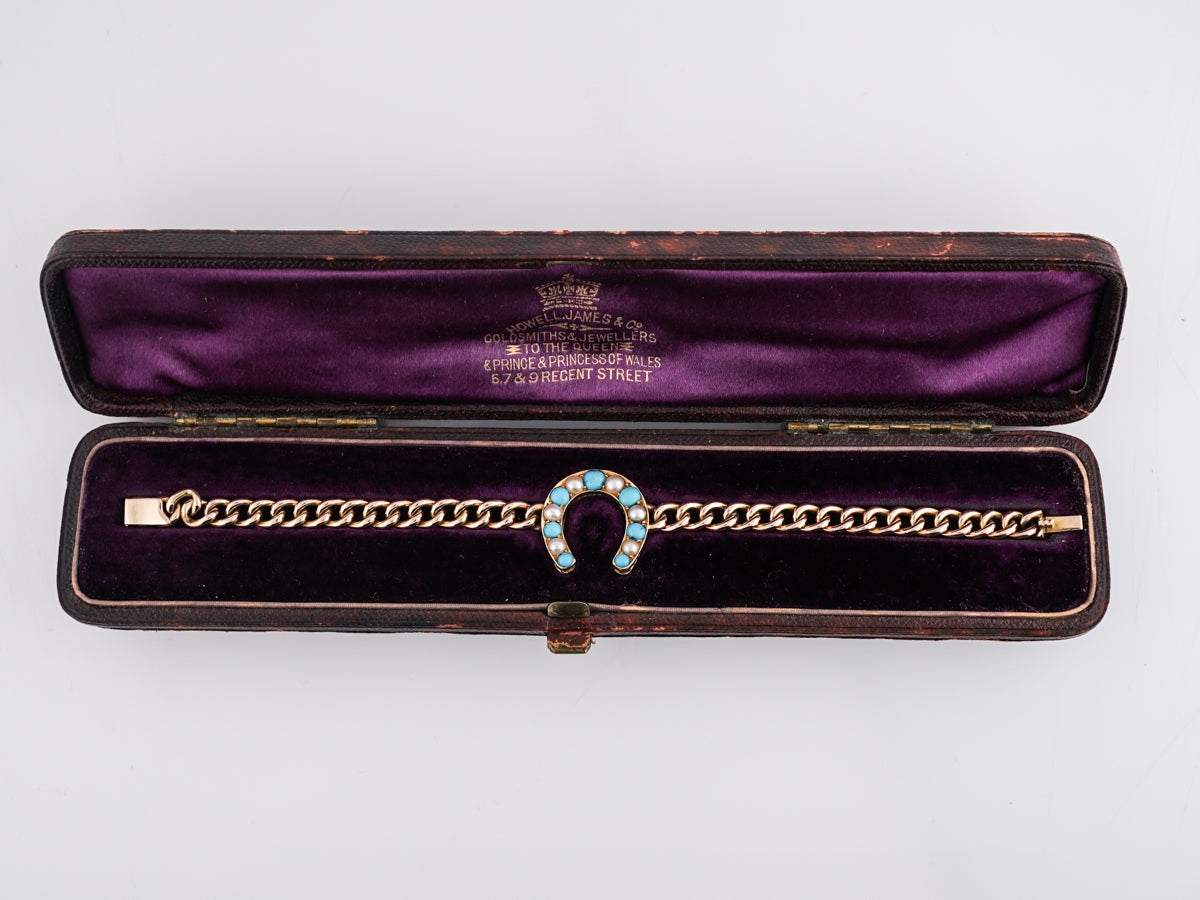 Howell James Co. Pearl and Turquoise Horseshoe Bracelet. This historic jewelry firm from London operated between 1819 1911, selling silk and well-crafted jewelry pieces. This particular piece made in 1865 is composed of Persian turquoise and natural pearl in a horseshoe-shaped pendant. The thicker, 15k gold link chain is in great condition. We are selling this piece in its original, velveteen box from maker Howell James Co. If you are a collector, do not sleep on this historic work of art!