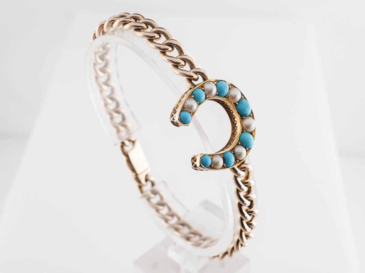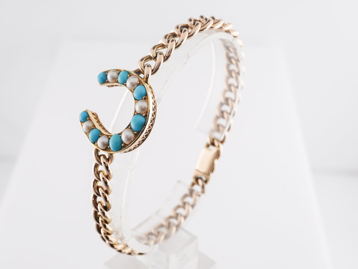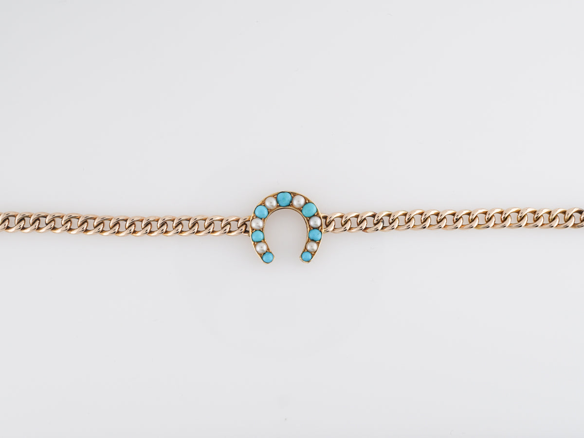 Howell James Co. Pearl and Turquoise Horseshoe Bracelet. This historic jewelry firm from London operated between 1819 1911, selling silk and well-crafted jewelry pieces. This particular piece made in 1865 is composed of Persian turquoise and natural pearl in a horseshoe-shaped pendant. The thicker, 15k gold link chain is in great condition. We are selling this piece in its original, velveteen box from maker Howell James Co. If you are a collector, do not sleep on this historic work of art!