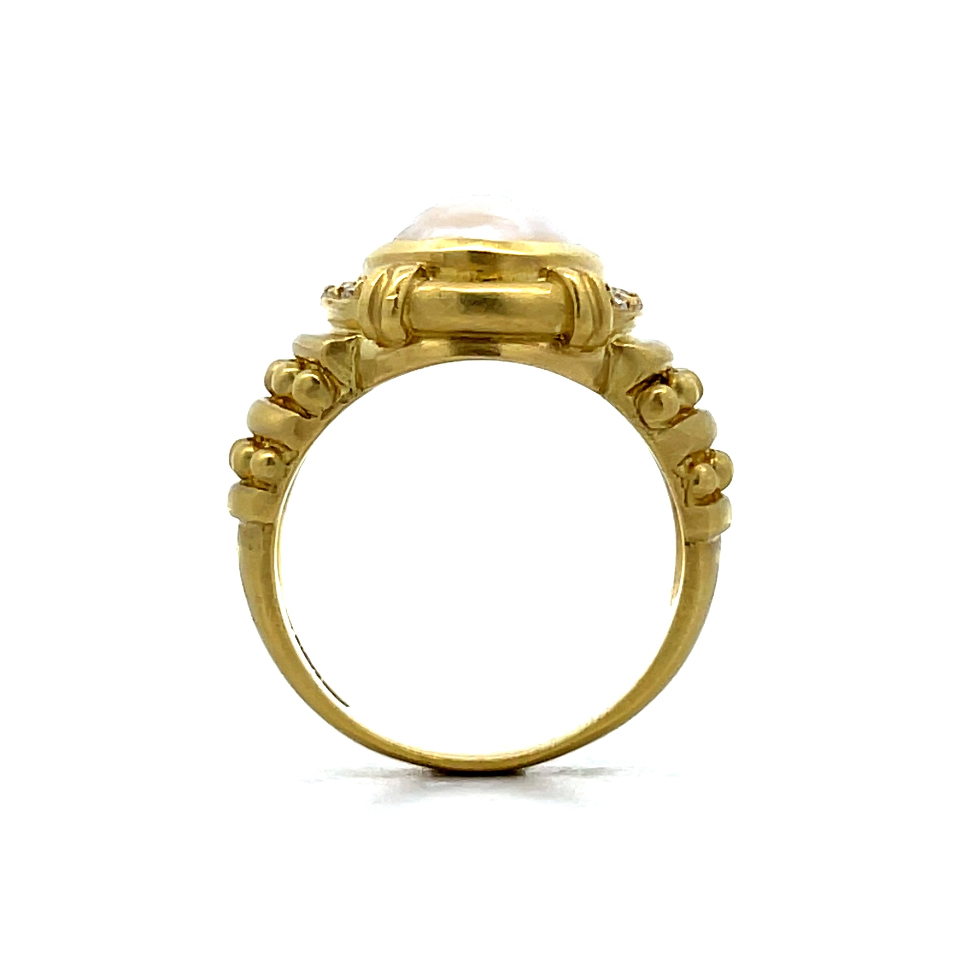 This Judith Ripka cocktail ring features an 18 karat yellow gold setting with a brushed finish and a 12.50 x 10.50 Mabe pearl as the centerpiece. Round brilliant diamonds totaling .20 carats (VS2 clarity, G color) are bezel set around the pearl, creating contrast against the gold's textured surface. The ring includes beaded texture accents that add depth to the overall design. This piece balances the organic quality of the Mabe pearl with the precision of the diamond accents in a substantial yellow gold mounting.