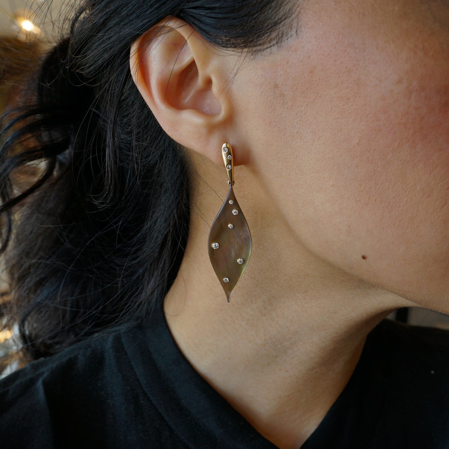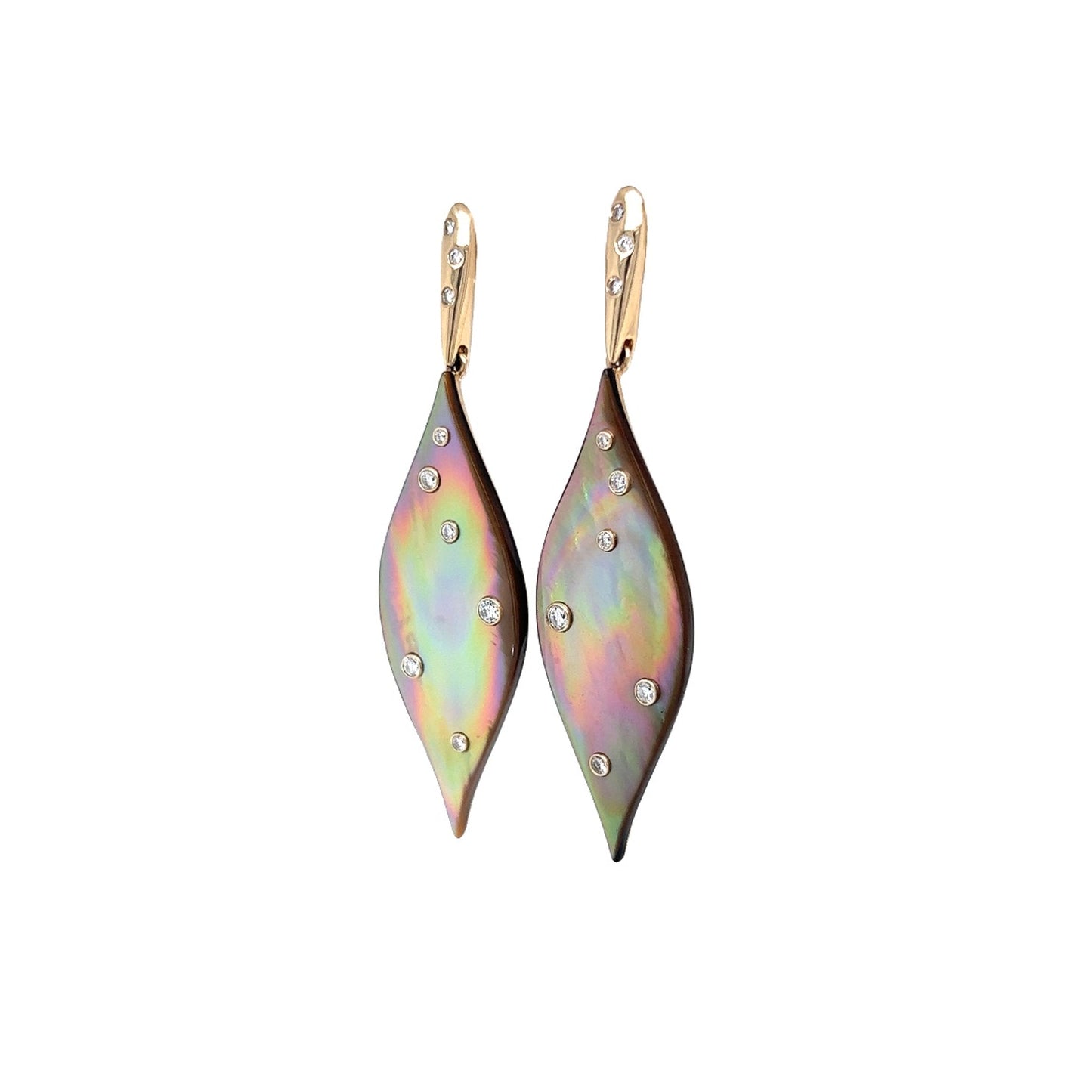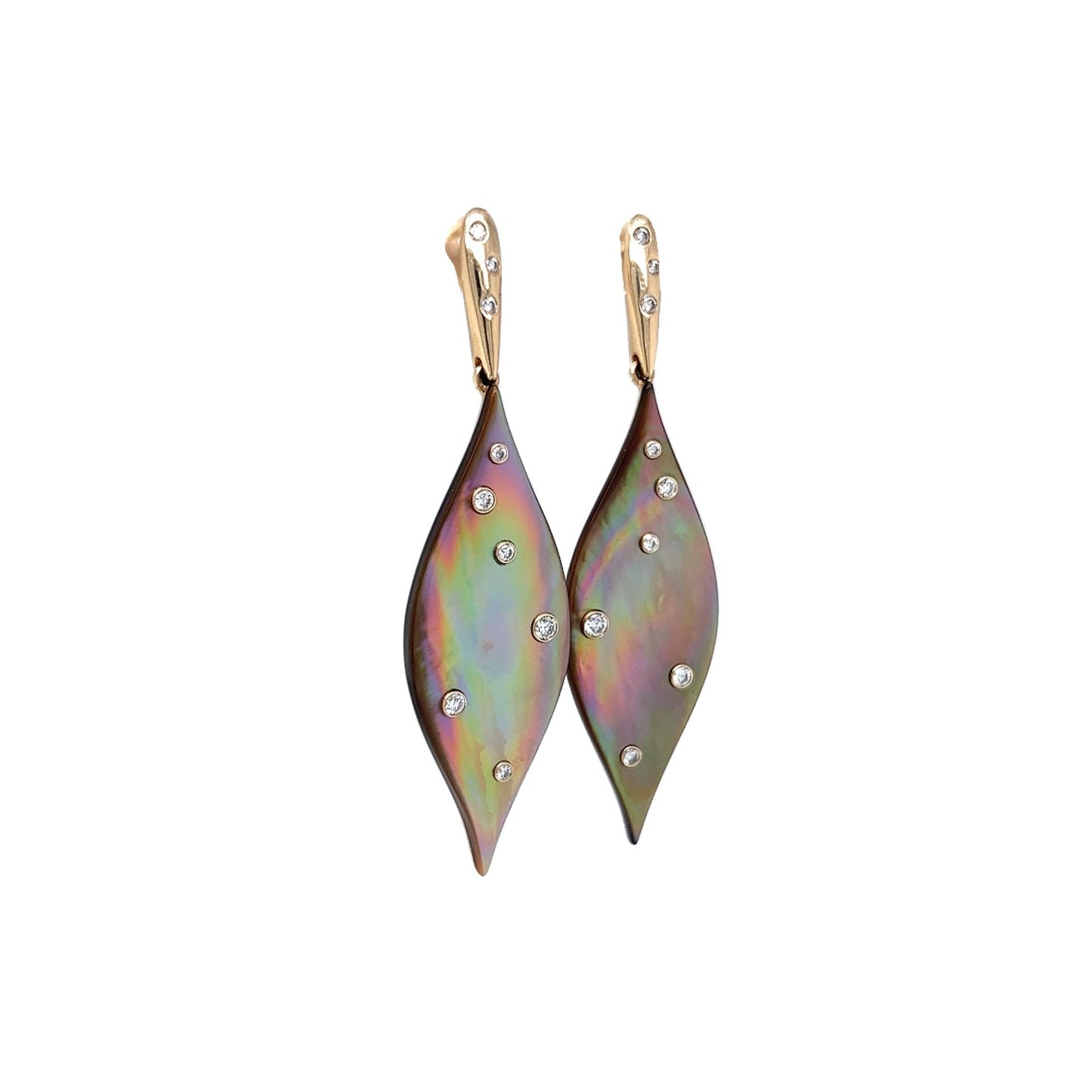 From the modern New Mexico jewelry designers at Kabana, these inspiring drop earrings feature mother of pearl inlays and .36 total carats of diamonds in 14 karat yellow gold. The dark color spectrum of the mother of pearl creates a night sky backdrop for the star-like bezel set diamonds. Additional accent diamonds are set flush on the 14 karat yellow gold stud backings. These breathtaking modern drops measure 2” long and are expertly crafted by Kabana. Shop More Drop Earrings.
