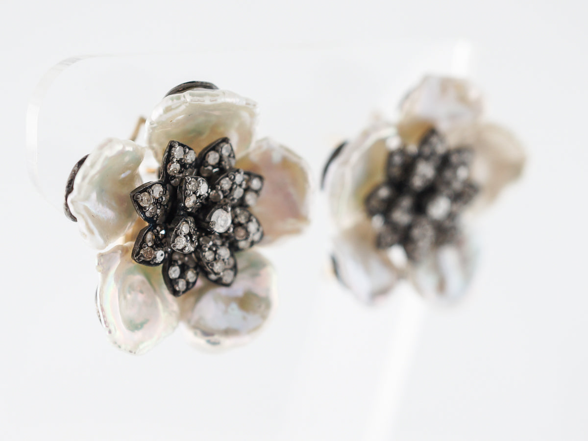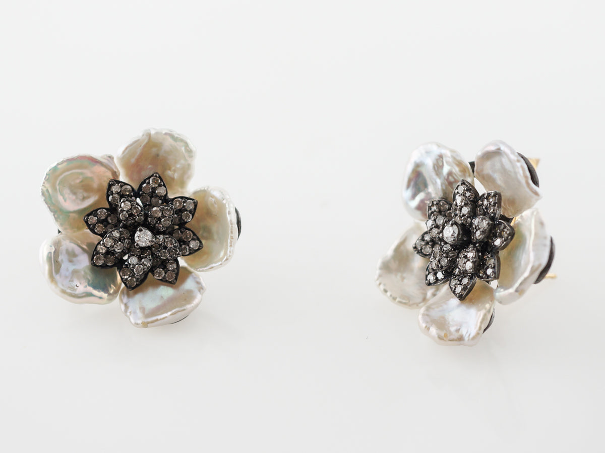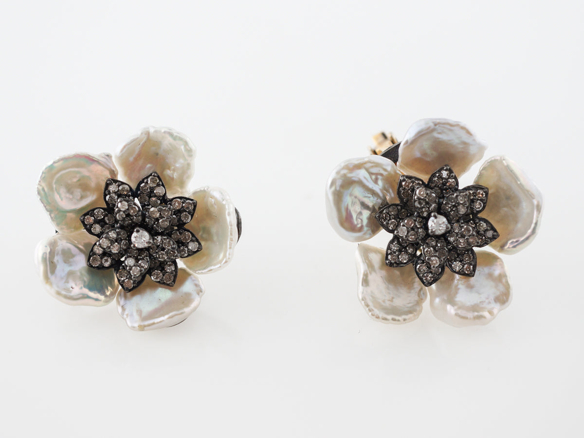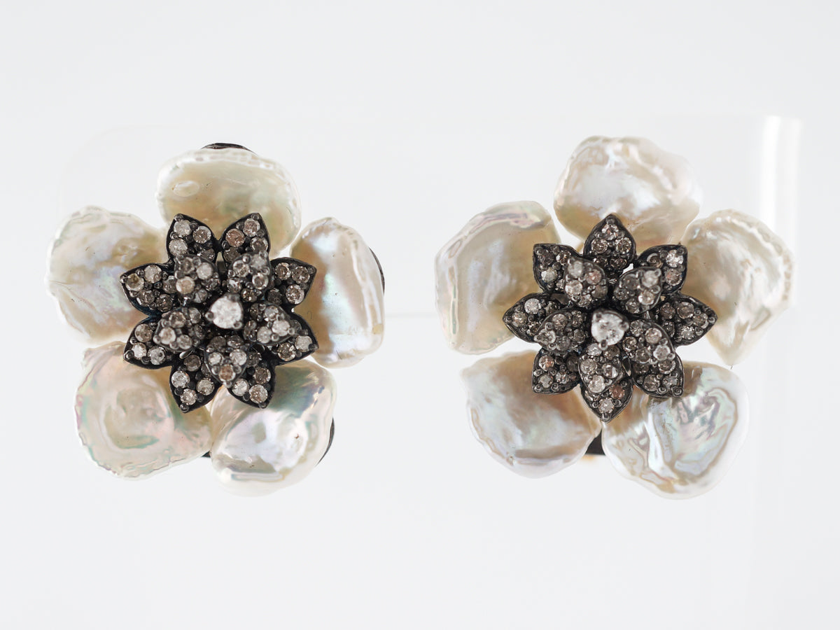 Keshi Pearl Diamond Earrings in Sterling Silver. These sterling silver Keshi and diamond floral motif earrings playful with an edgy twist. The high luster of the Keshi corn flake style pearl create a bright white flower with a pink hue. The center of the floral design features round brilliant champagne colored diamonds adding brilliance to this Modern design.