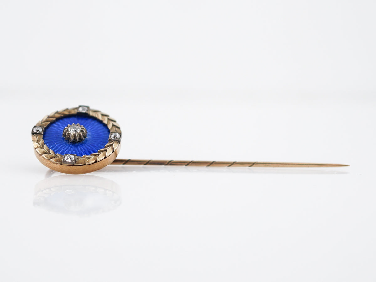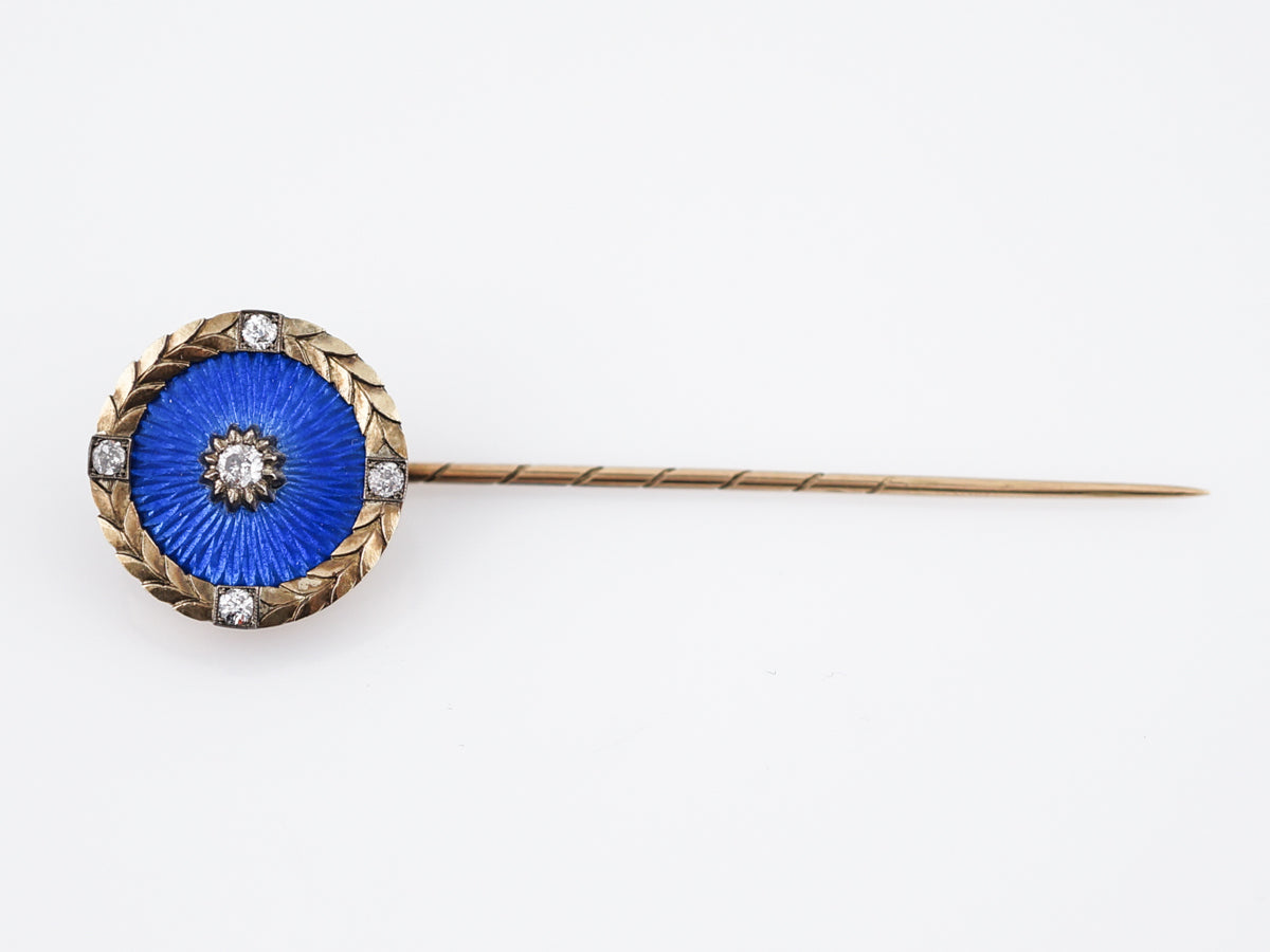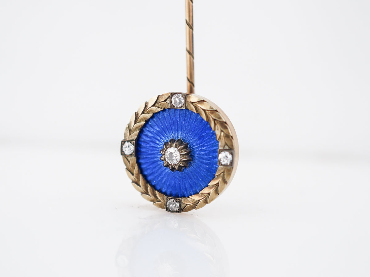 Make your suit stand out with this dazzling Modern Era Lapel pin. Made in 14 karat yellow gold, this circular pin catches the eye with a bright blue enamel which surrounds a decoratively set diamond. Around the edge four diamonds are set in a wreath of etched leaves, and a lovely patina gives this modern piece a vintage feel.