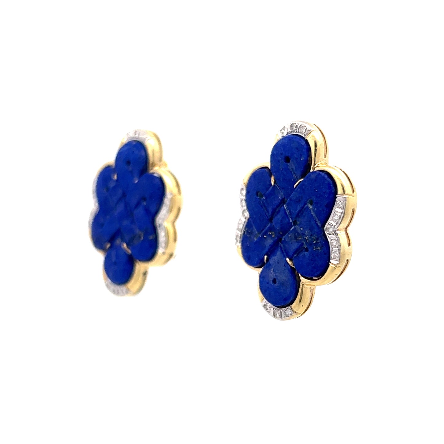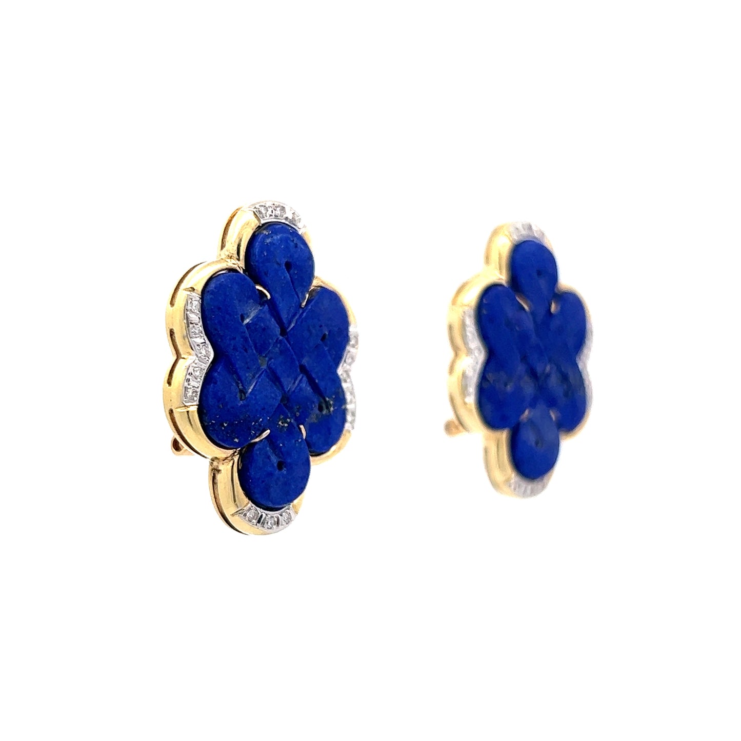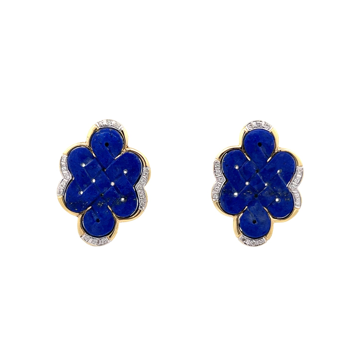 These contemporary stud earrings are an absolute showstopper! Crafted in 14 karat yellow gold, the earrings feature a Chinese knot design in a bezel setting with cabochon lapis lazuli. The lapis is surrounded by thirty-two (32) pave diamond accents, weighing a total of .24 carats. These earrings are perfect for adding a touch of luxury to any outfit.