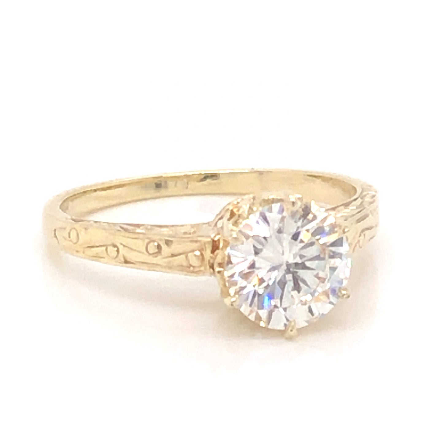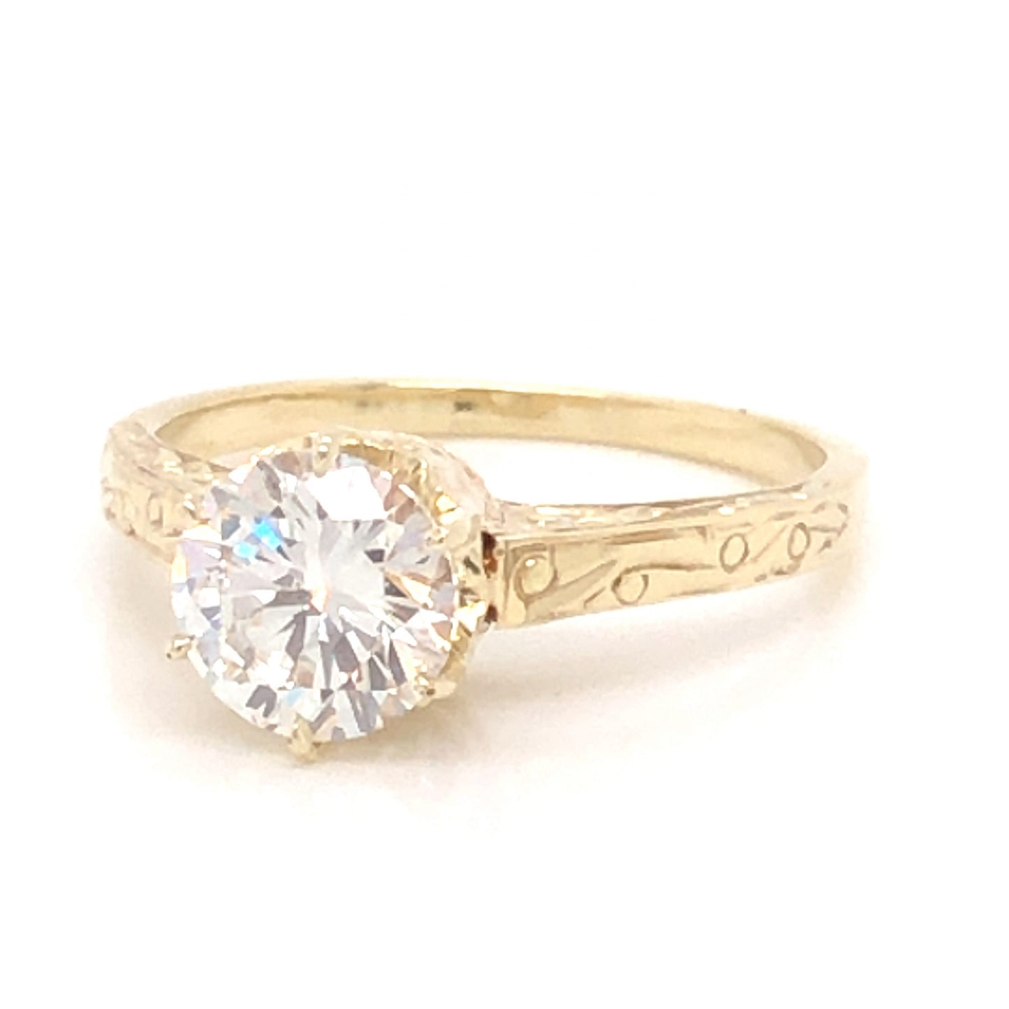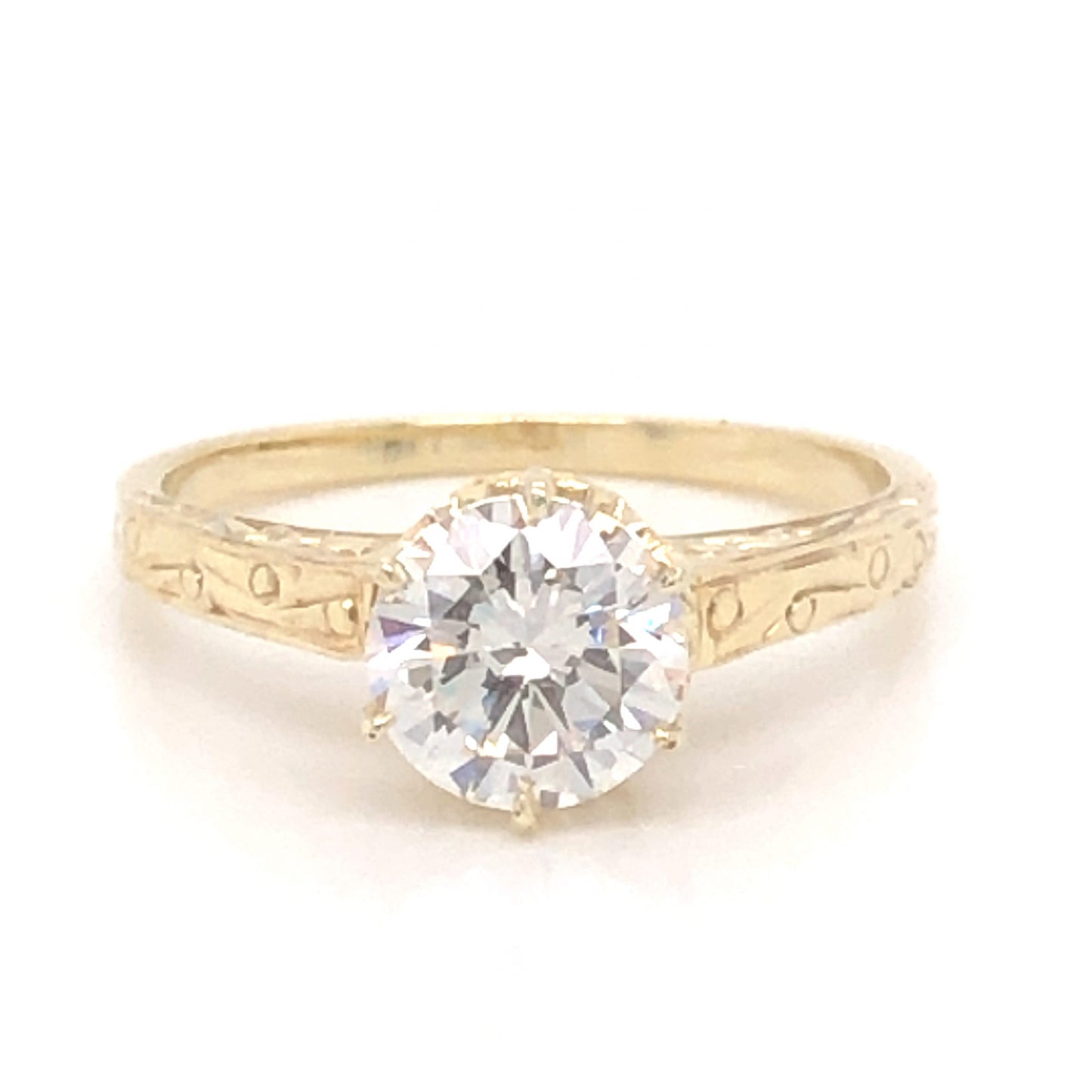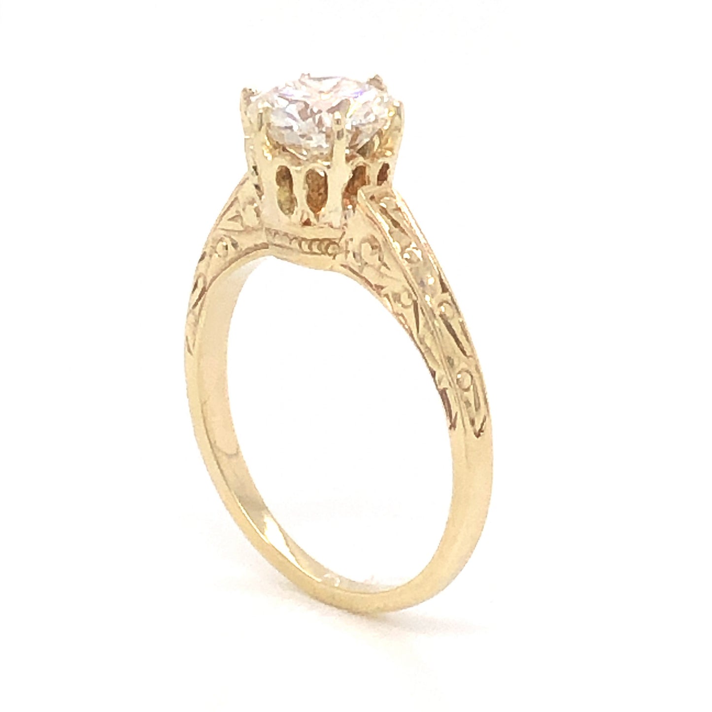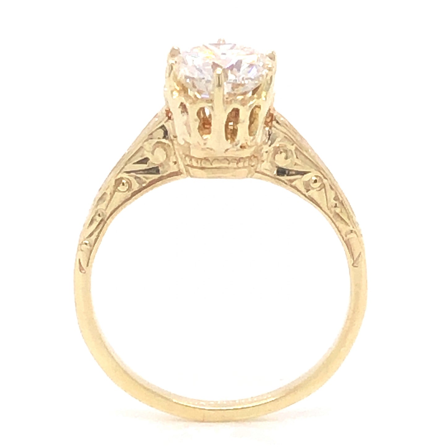Late Art Deco 1.23 Diamond Engagement Ring in 14k Yellow Gold. This stunning Art Deco engagement ring features a 1.23 carat Round Brilliant cut diamond finished in polished 14 karat yellow gold. The near colorless diamond has beautiful Round Brilliant facets that allow for ample fire and brilliance. The diamond is eye clean and prong set in yellow gold. From the profile, a decorative basket mounting shaped like a crown holds the solitaire diamond. The shoulders of the ring feature vintage engravings in polished 14 karat yellow gold.