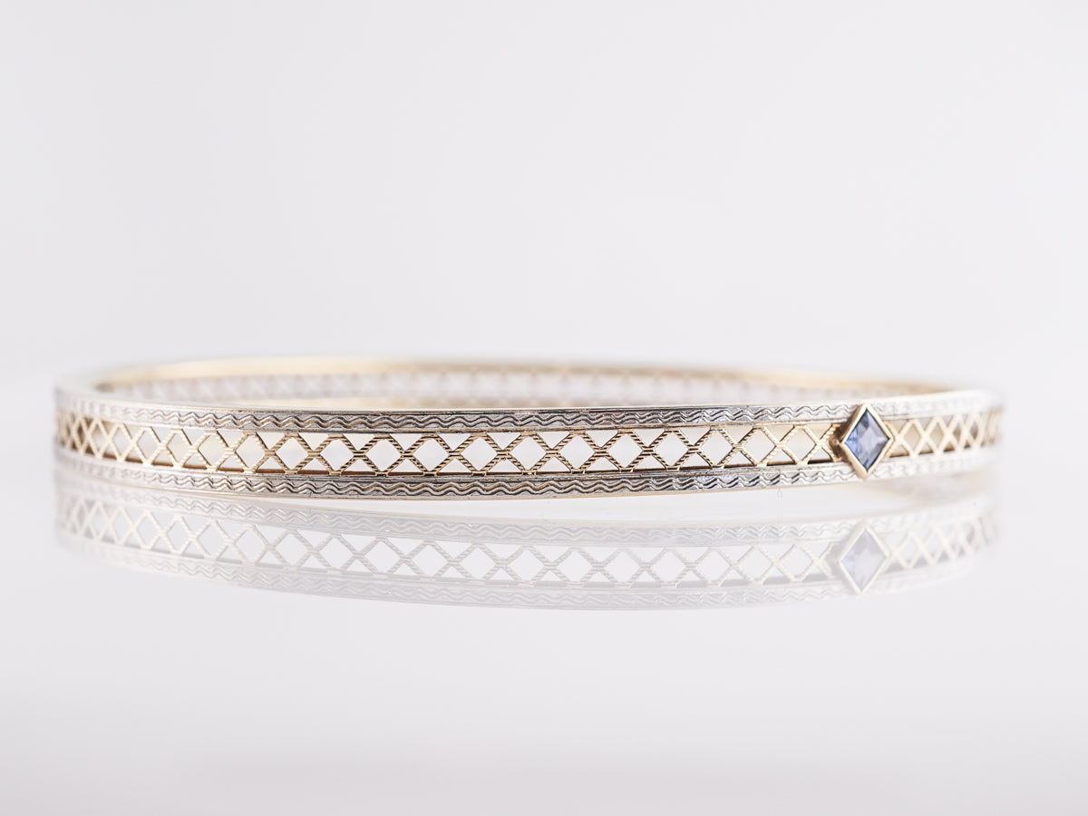 Late Art Deco Sapphire Bangle Bracelet in 14k White Yellow Gold. This vintage bracelet features two Montana sapphires on a graphic, diamond-patterned bangle made of 14k yellow gold. The trim of the bangle is finely detailed with 14k white gold and was made in the Late Deco period (circa 1930s). Bangles can be incorporated into both day and evening attire and make wonderful family heirlooms. Invest in this vintage bangle and you won’t want to leave home without it!