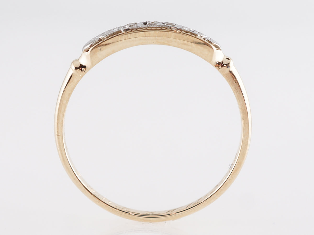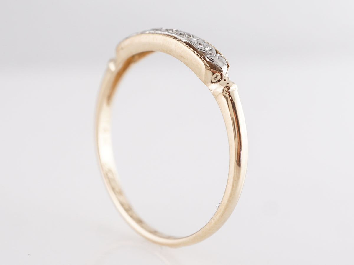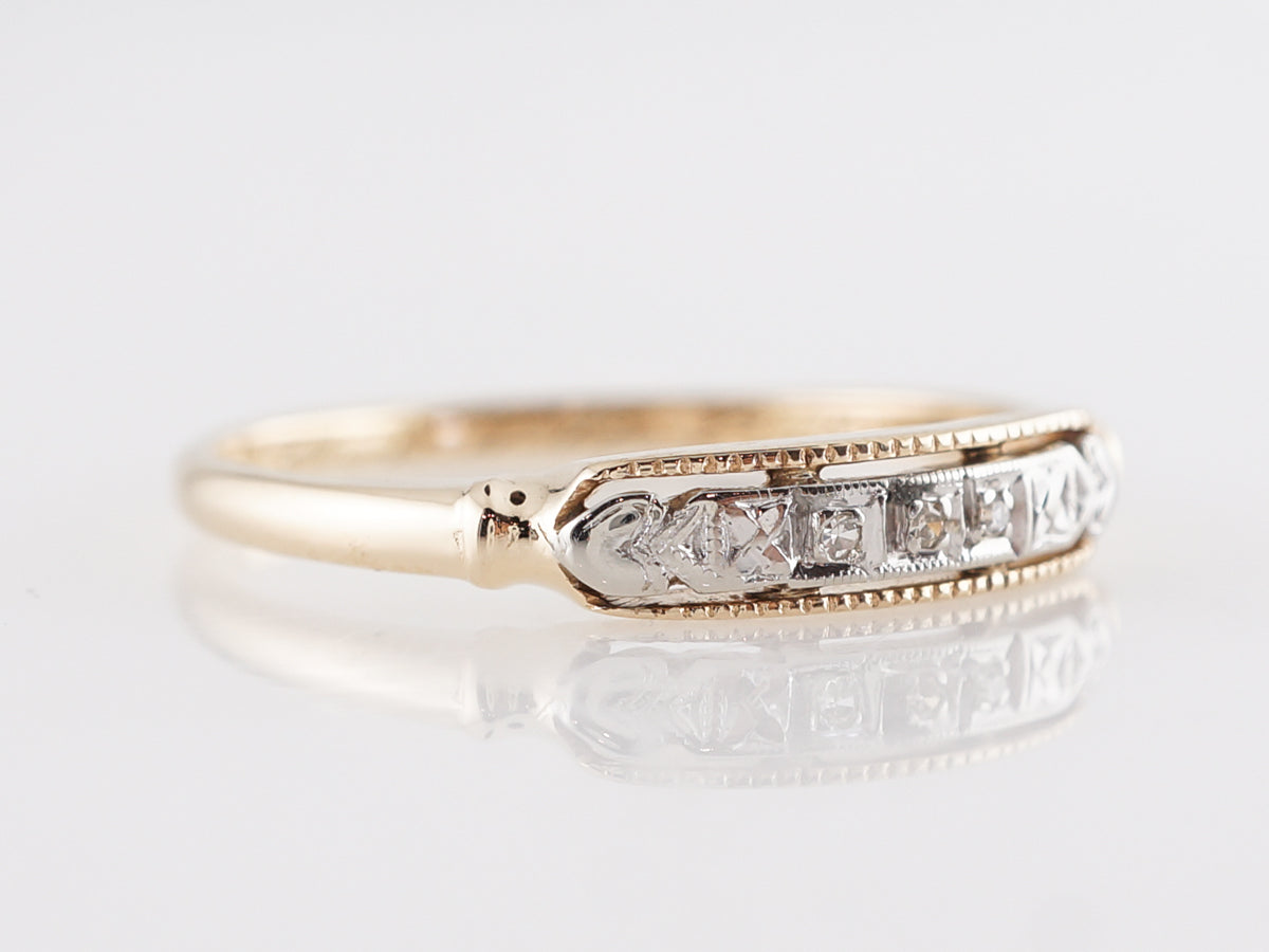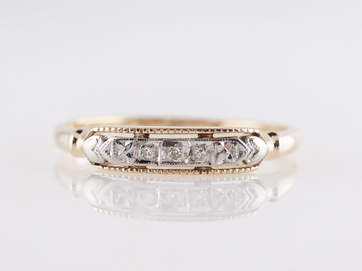 Late Art Deco Wedding Band w/ Diamonds in Yellow Gold. This Art Deco wedding band features .015 carats of single cut diamonds set in 14 karat white and yellow gold. The three diamonds are neatly set in a line of white gold atop the yellow gold shank. This vintage band will look amazing next to your engagement ring, whether it is vintage or modern!