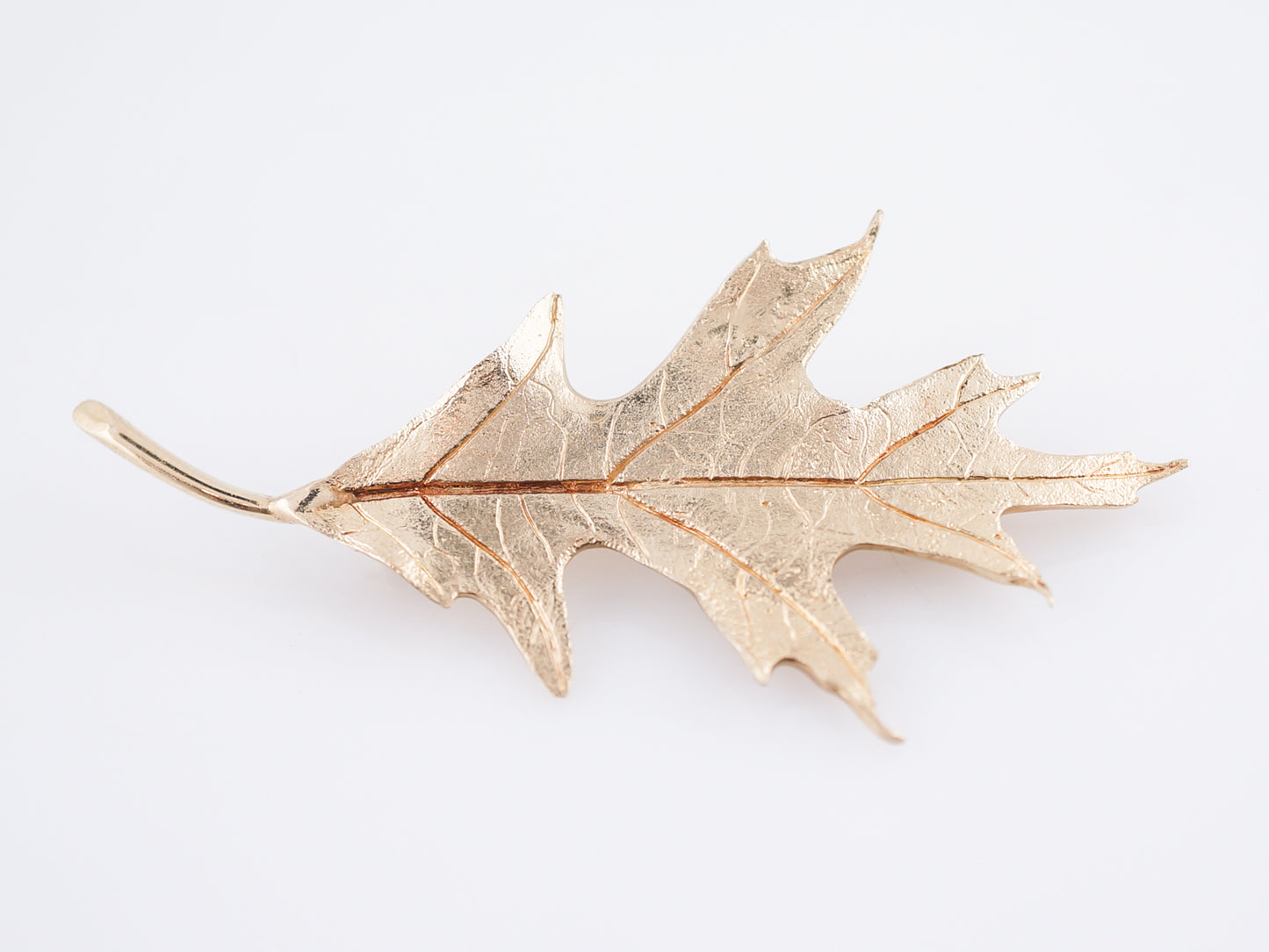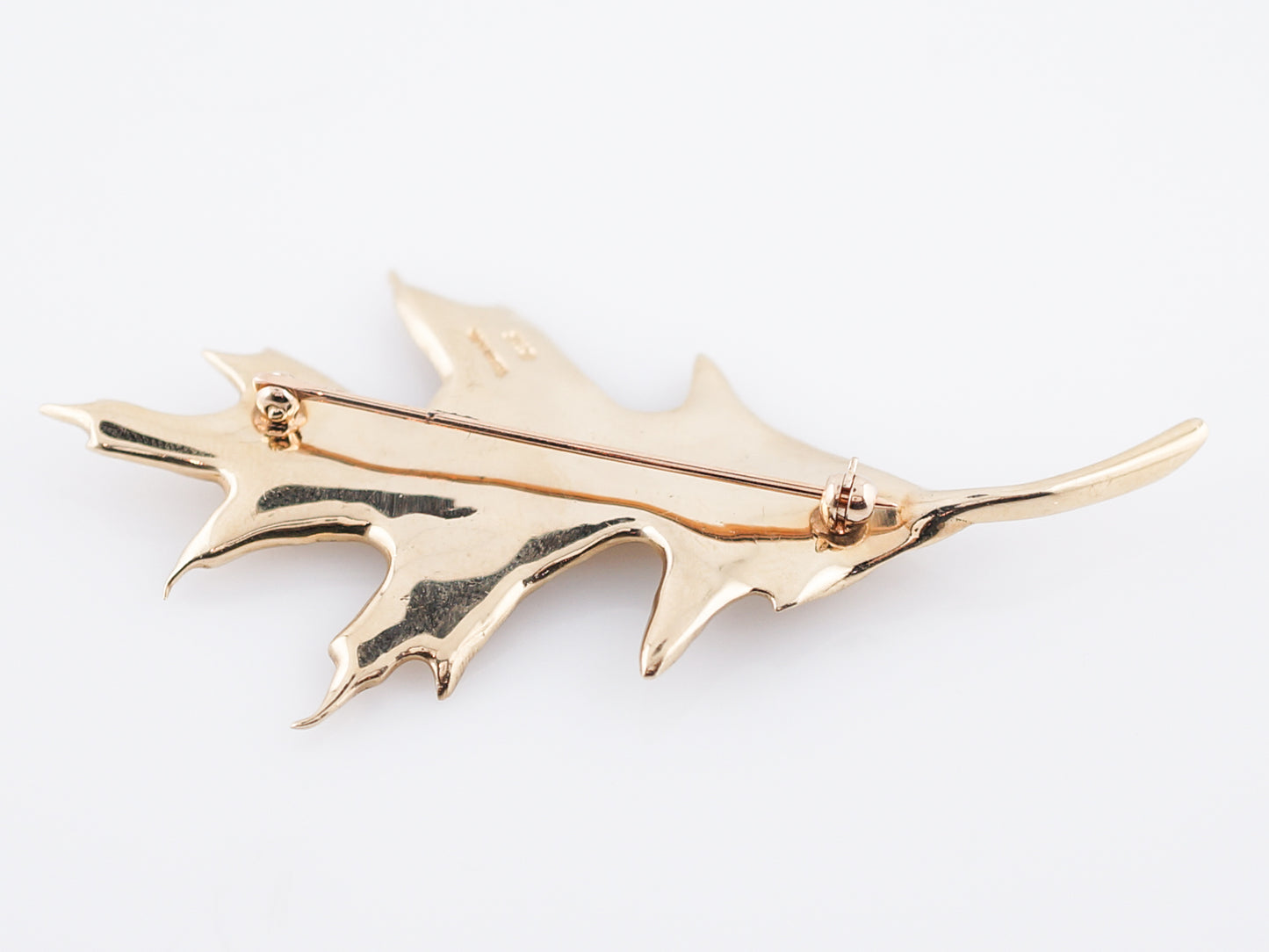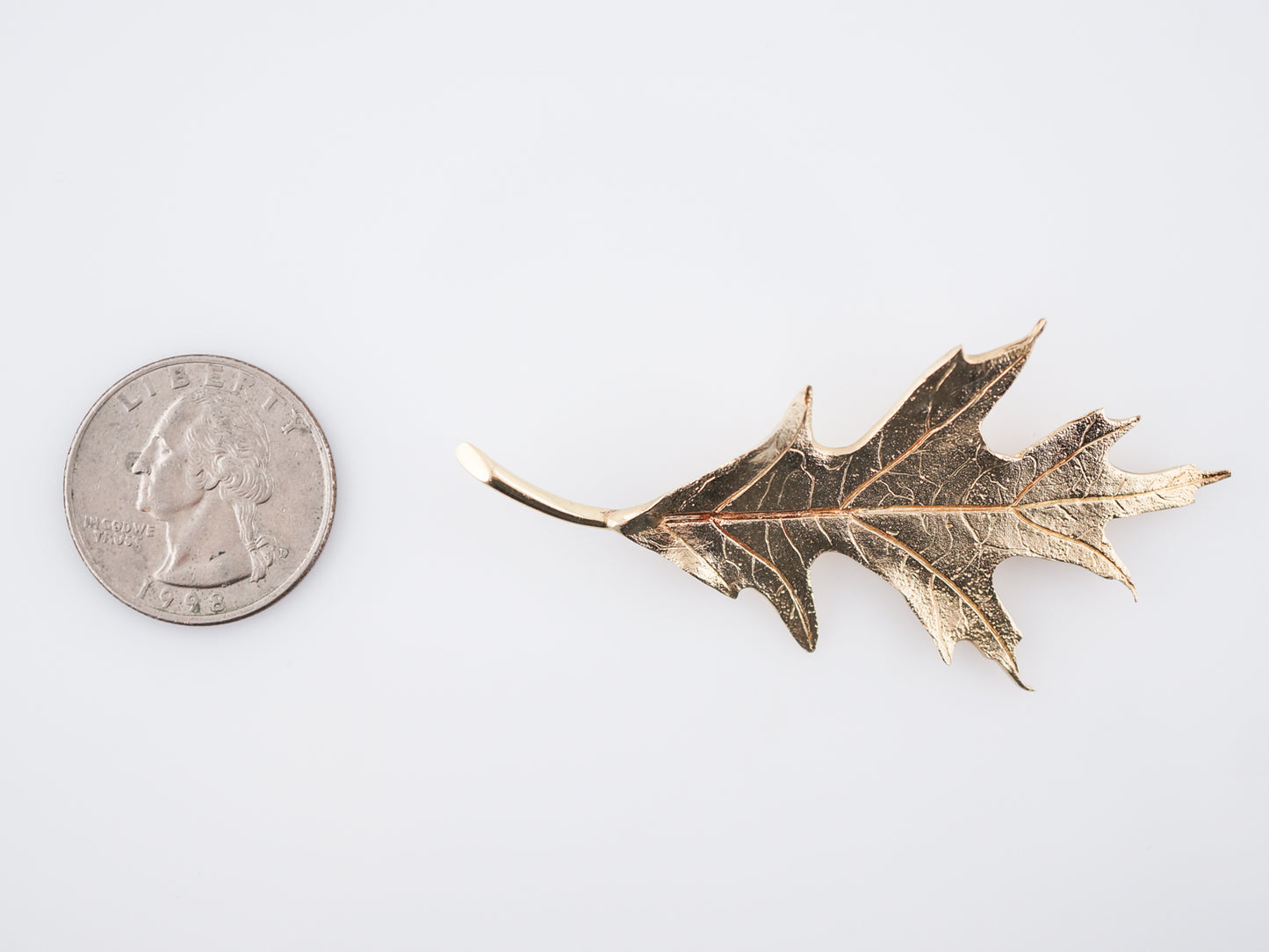 This Modern Era brooch is an original Tiff Co piece. Made in 14 karat yellow gold, this leaf brooch is beautifully textured and an impressive size at 2 3/4 inches by 1 1/4 inches. It would be a lovely seasonal piece worn on a jacket or a scarf.