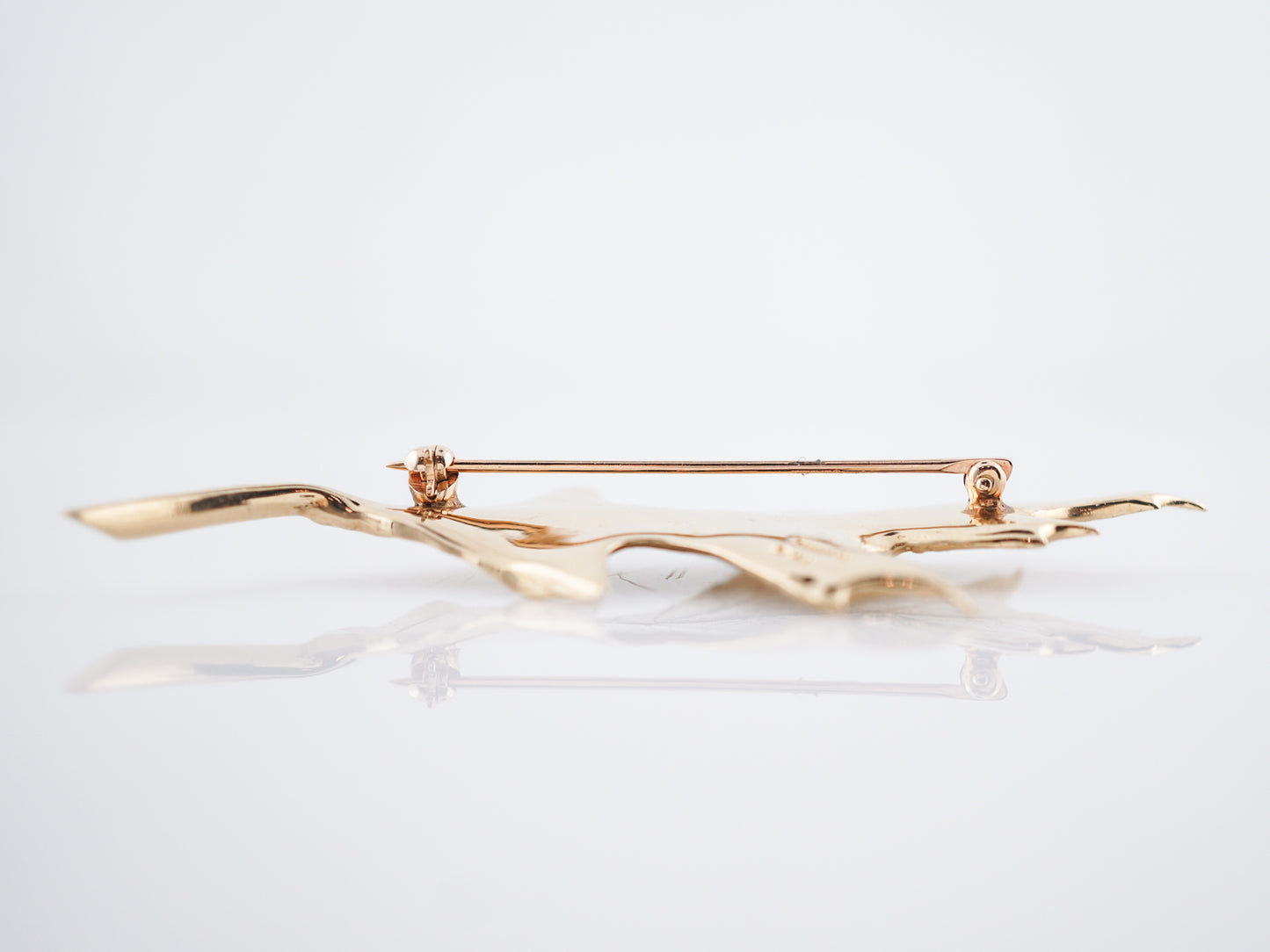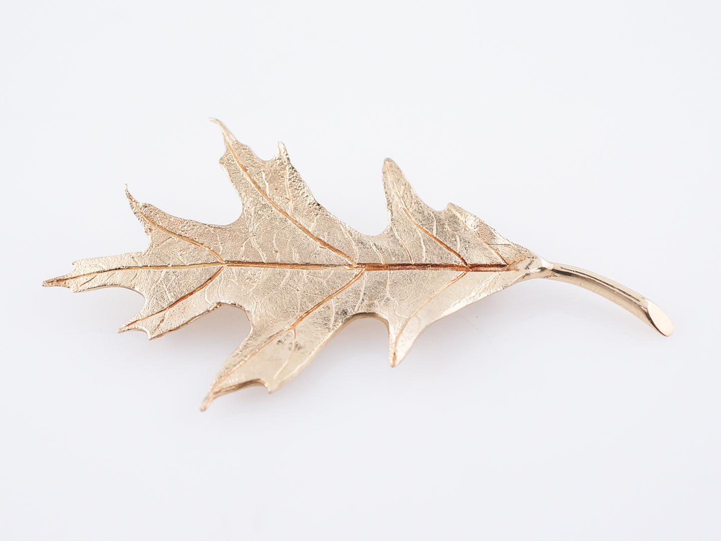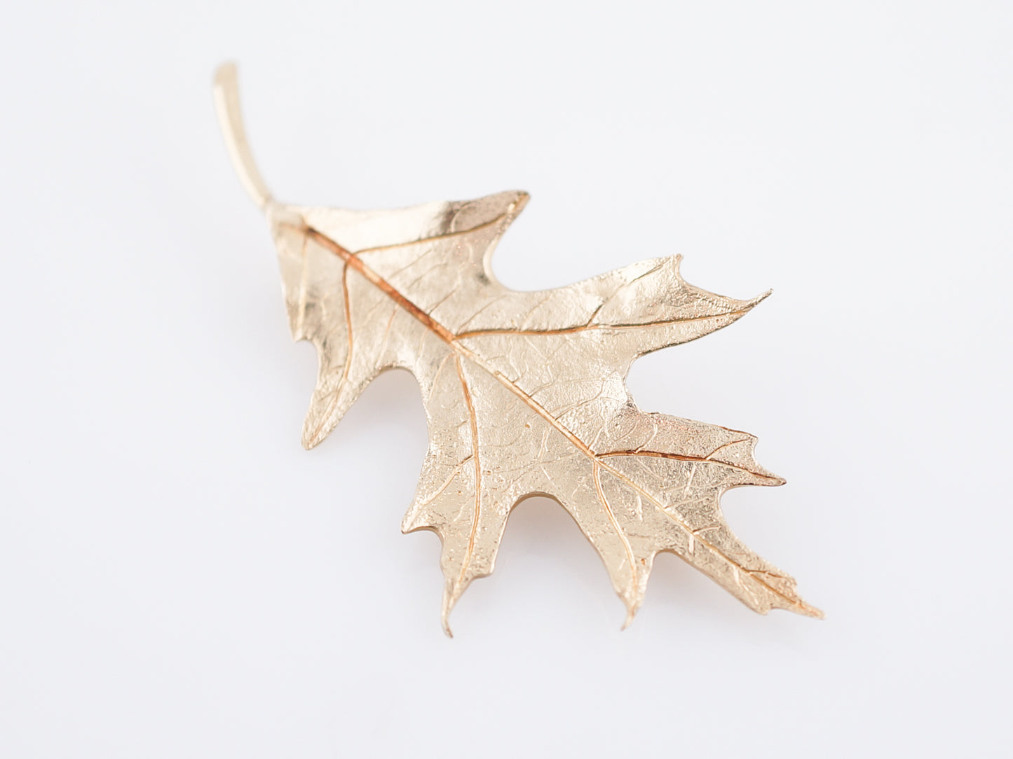 This Modern Era brooch is an original Tiff Co piece. Made in 14 karat yellow gold, this leaf brooch is beautifully textured and an impressive size at 2 3/4 inches by 1 1/4 inches. It would be a lovely seasonal piece worn on a jacket or a scarf.
