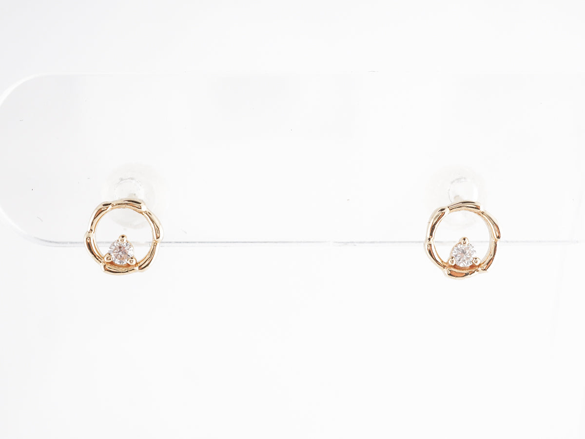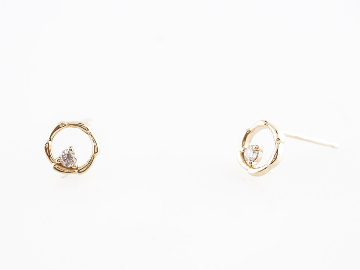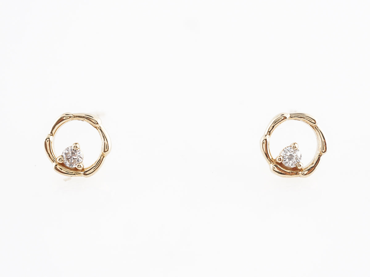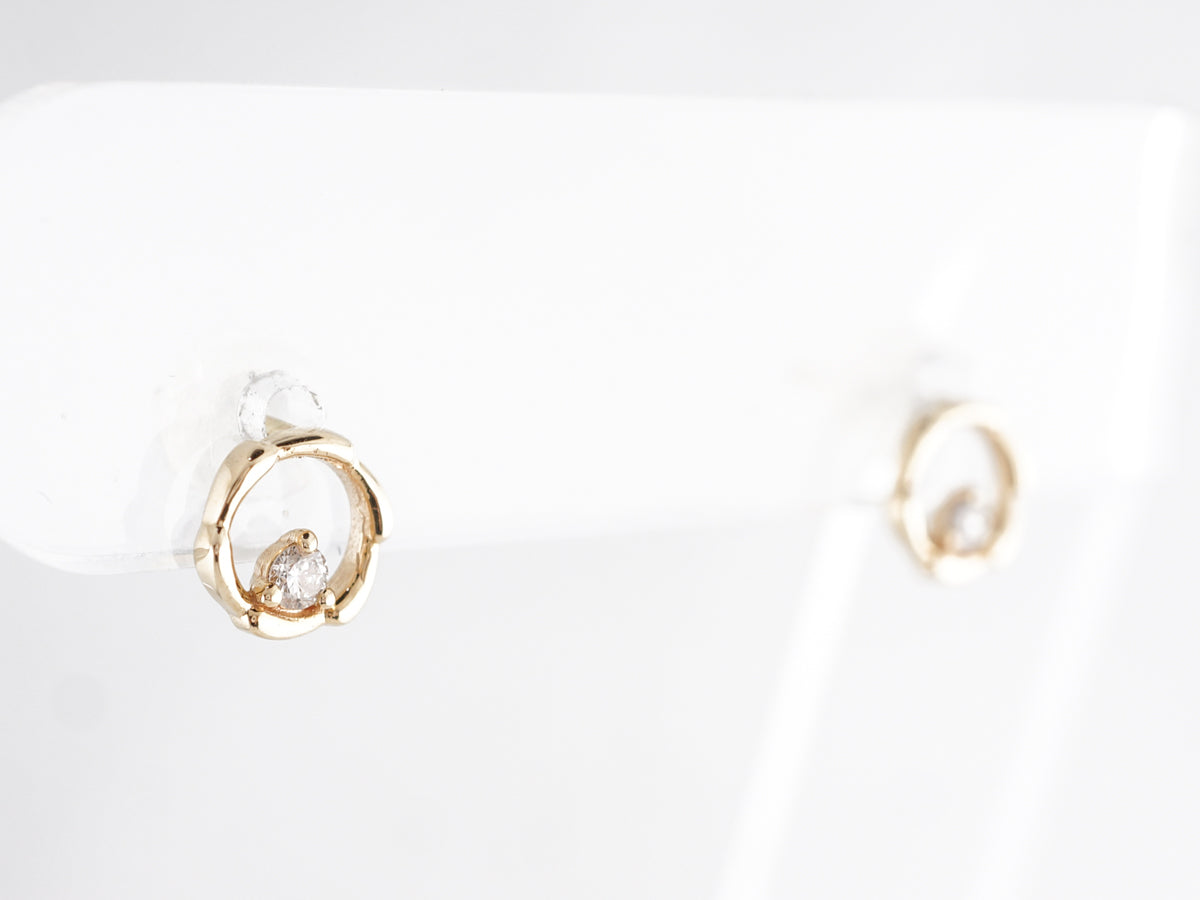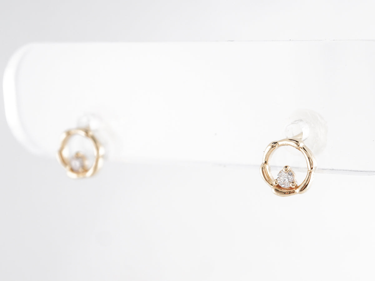 Light Diamond Hoop Earrings in 14k Yellow Gold. These dainty little hoop studs feature .045 carat round brilliant cut diamonds inside the 14 karat yellow gold hoops. The diamonds are set with three (3) prongs at the bottom of the hoops. The hoops features gently curving bumps which give some nice texture to these earrings.
