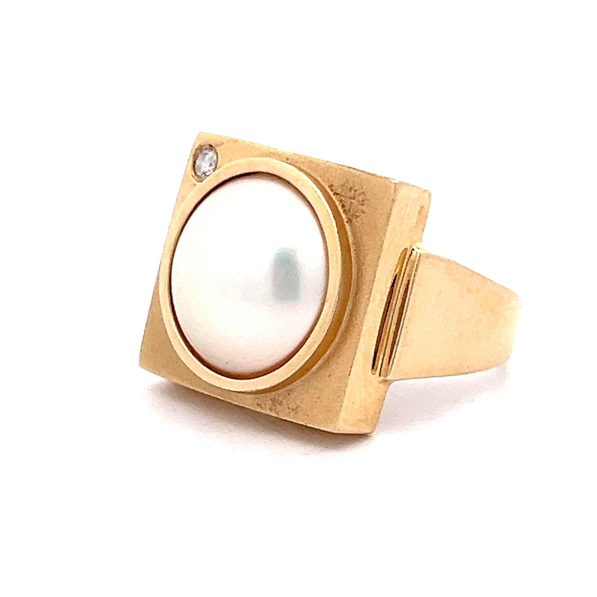 This cocktail ring combines a Mabe pearl in a bezel setting with a small round diamond (.03 carats) placed in the corner of its square mounting. Made of 14 karat yellow gold, the ring has a warm color that highlights both the pearl and diamond. The square shape gives the ring a different look, while the pearl adds a classic element. The small diamond brings a hint of sparkle to the design without taking away from the pearl.