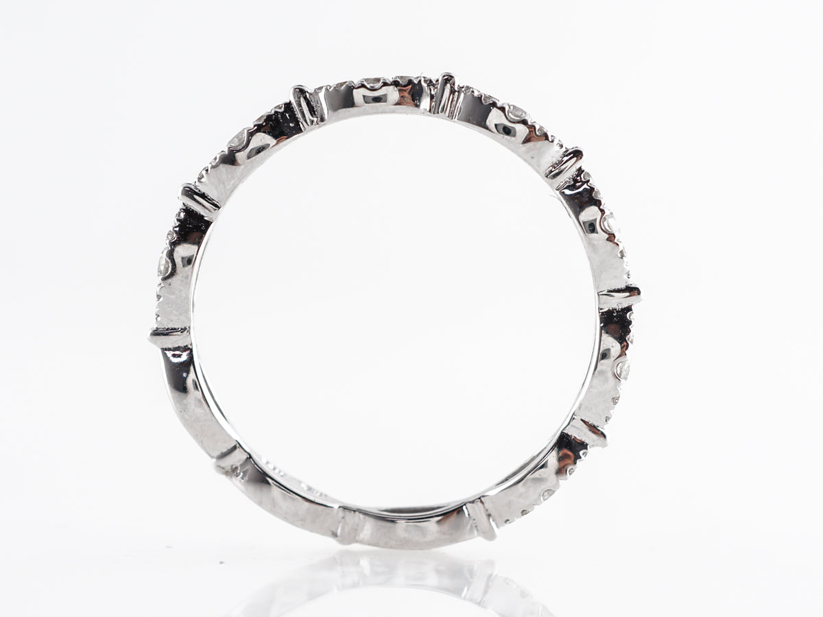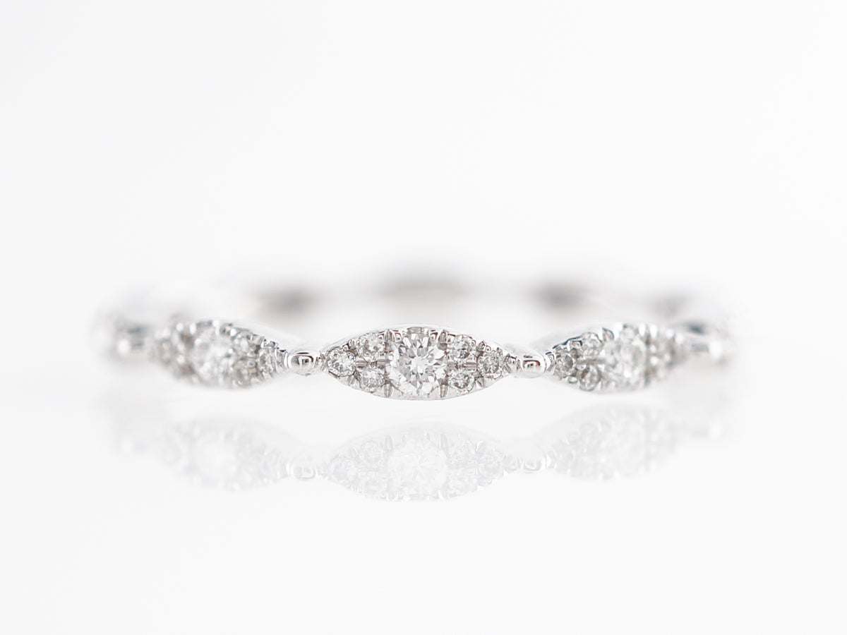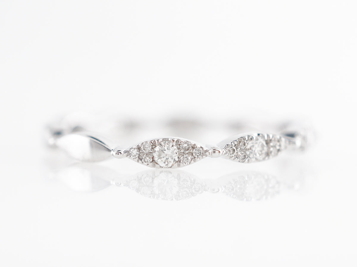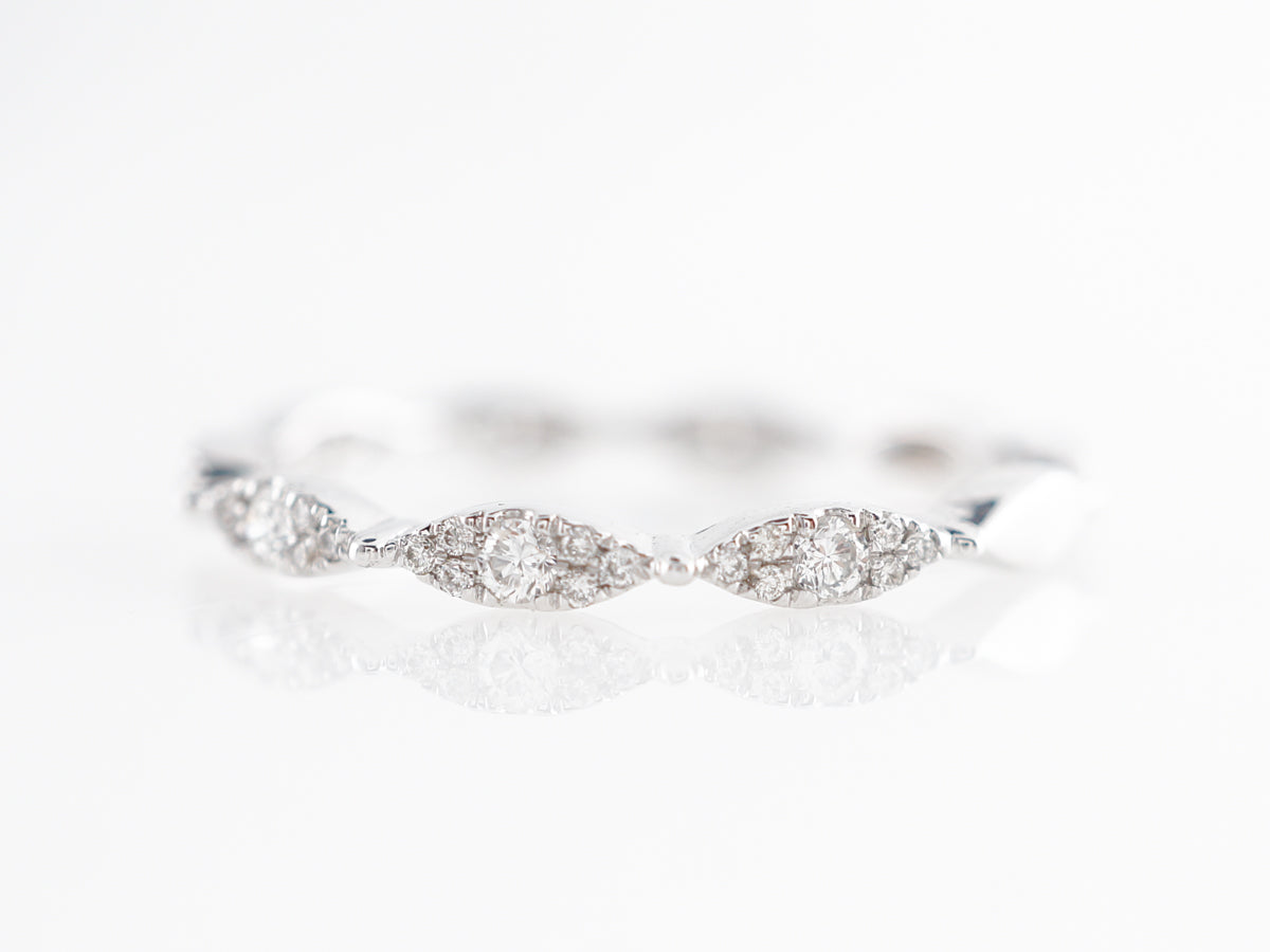 Marquis Shaped Diamond Wedding Band in 14k Gold. This modern wedding band features .25 carats of round brilliant cut diamonds and is finished in 14 karat white gold. Each marquise shaped station contains a pave cluster of diamonds in various sizes, giving this ring an excellent sparkle. A versatile band that could easily be worn on either hand!