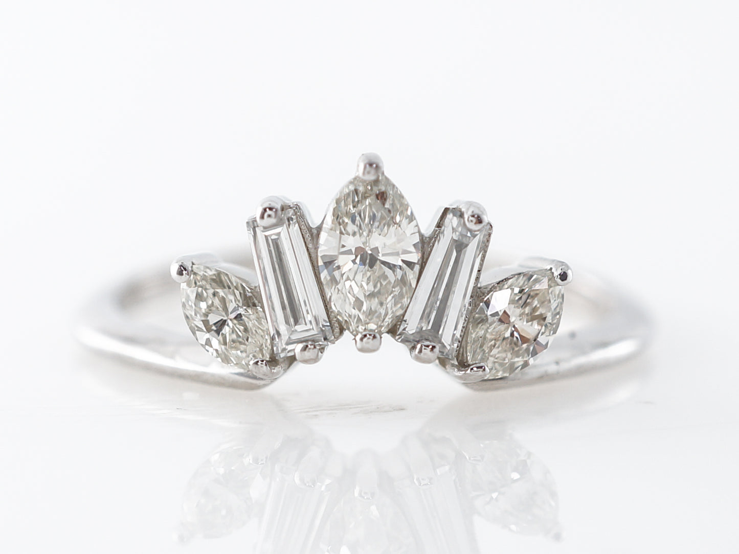Marquise Baguette Diamond Wedding Band in White Gold. This modern wedding band features .55 carats of baguette and marquise cut diamonds and is finished in 14 karat white gold. The diamonds are bead set and neatly curved to allow an engagement ring to snuggle up for a nice pair. This could also be worn on the end of a stack of bands for a nice shape to cap it off.