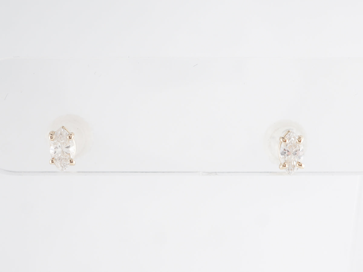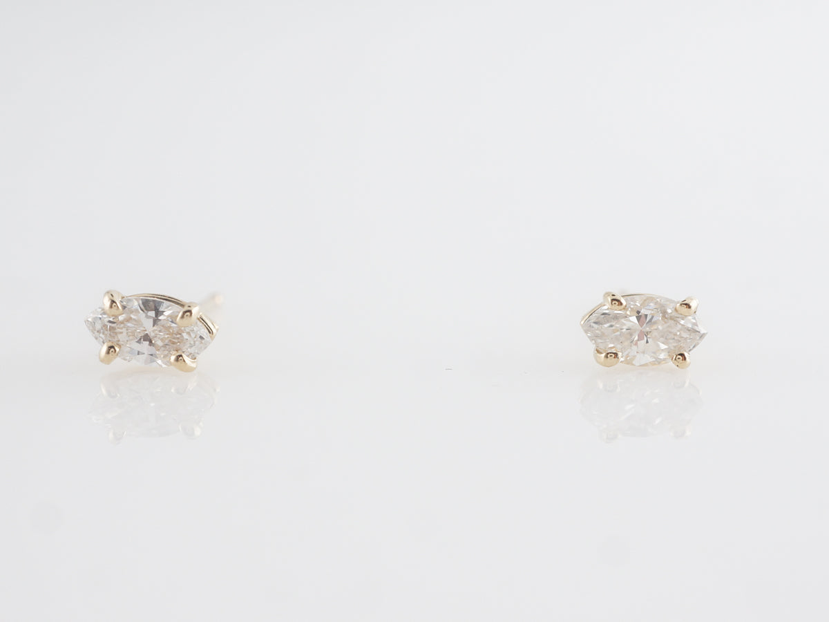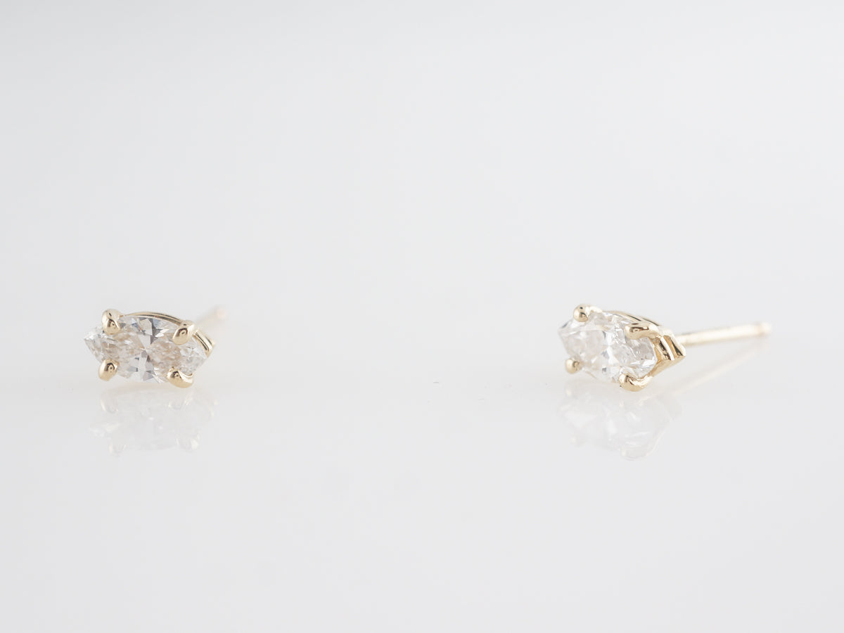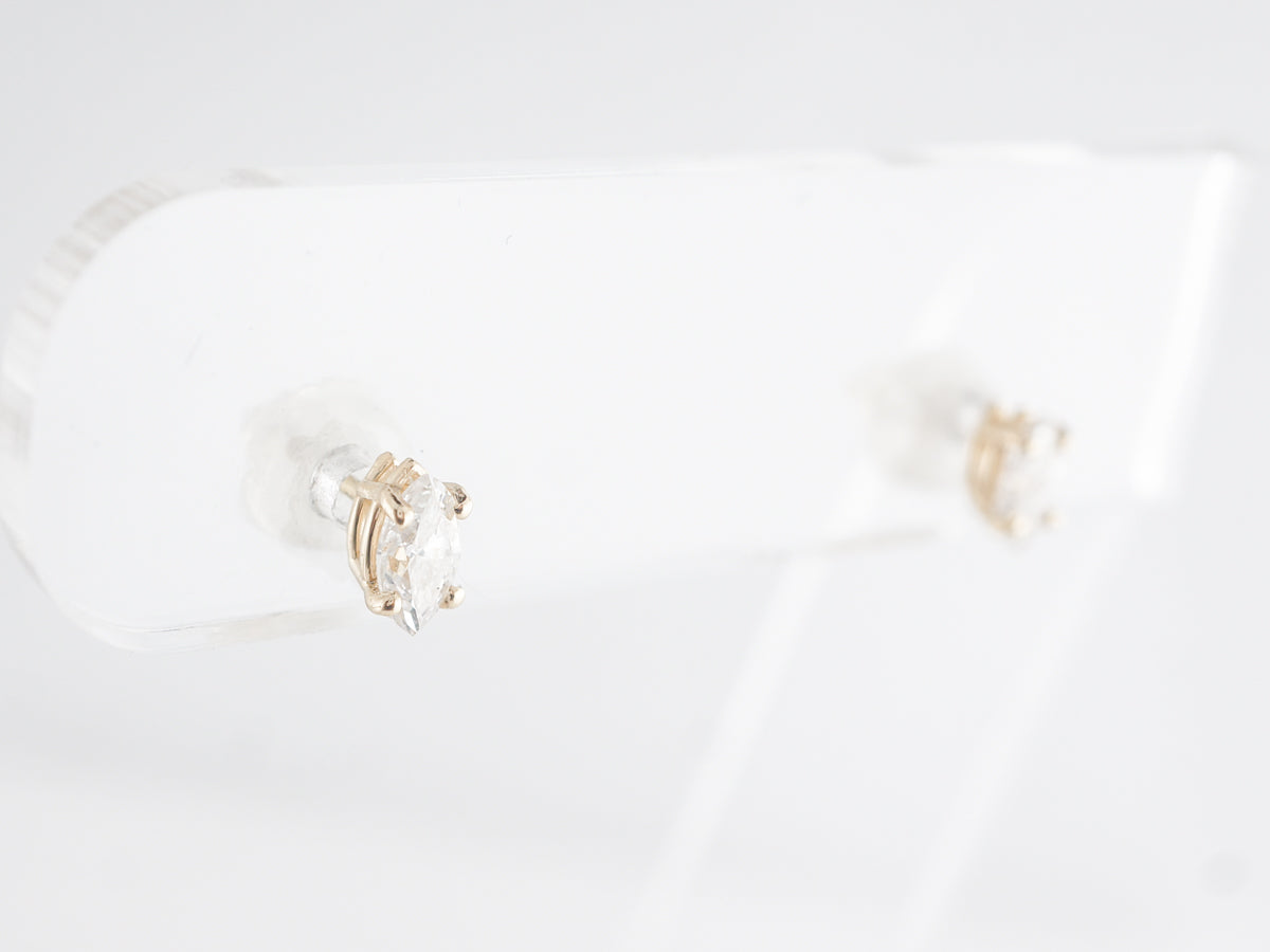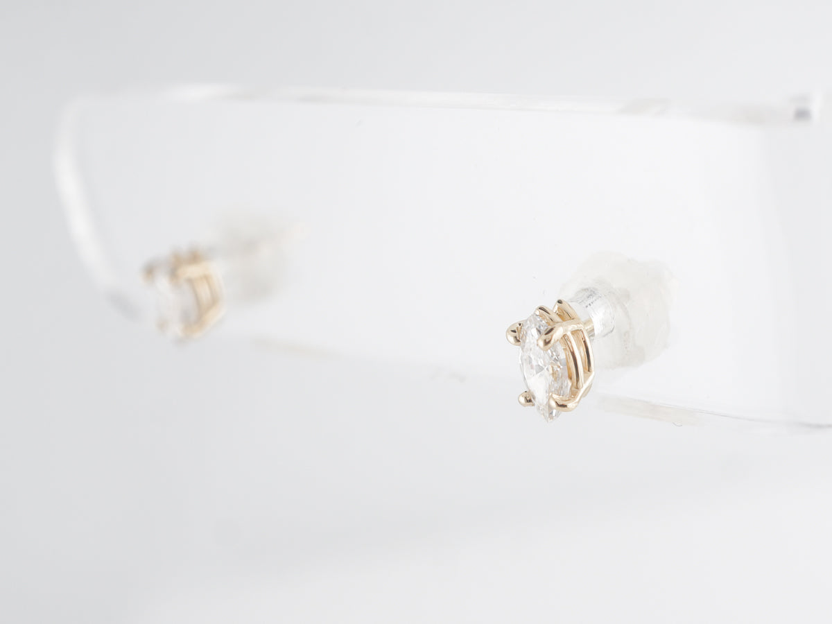Marquise Cut Diamond Earrings in Yellow Gold. These modern earrings feature .47 carats of marquise cut diamonds set with four (4) prongs in 14 karat yellow gold. These have a lovely white brilliance and are great for an active day out or fancy evening wear. A fancy cut like the marquise is a great way to add some spice to a classic diamond stud!
