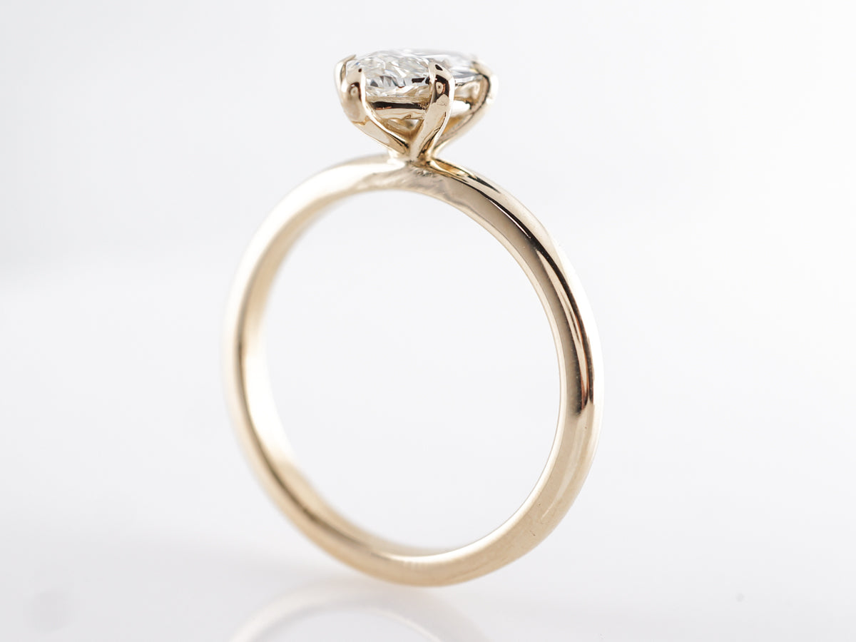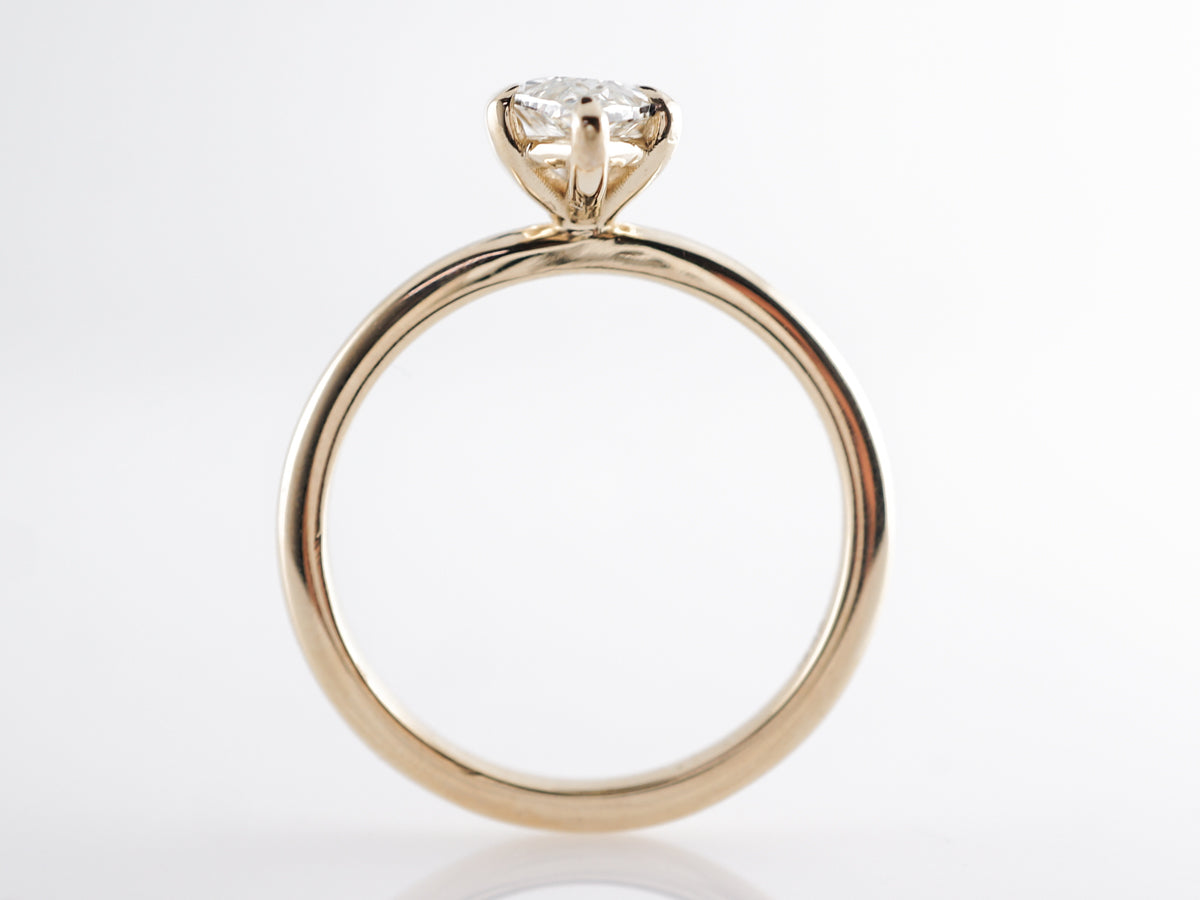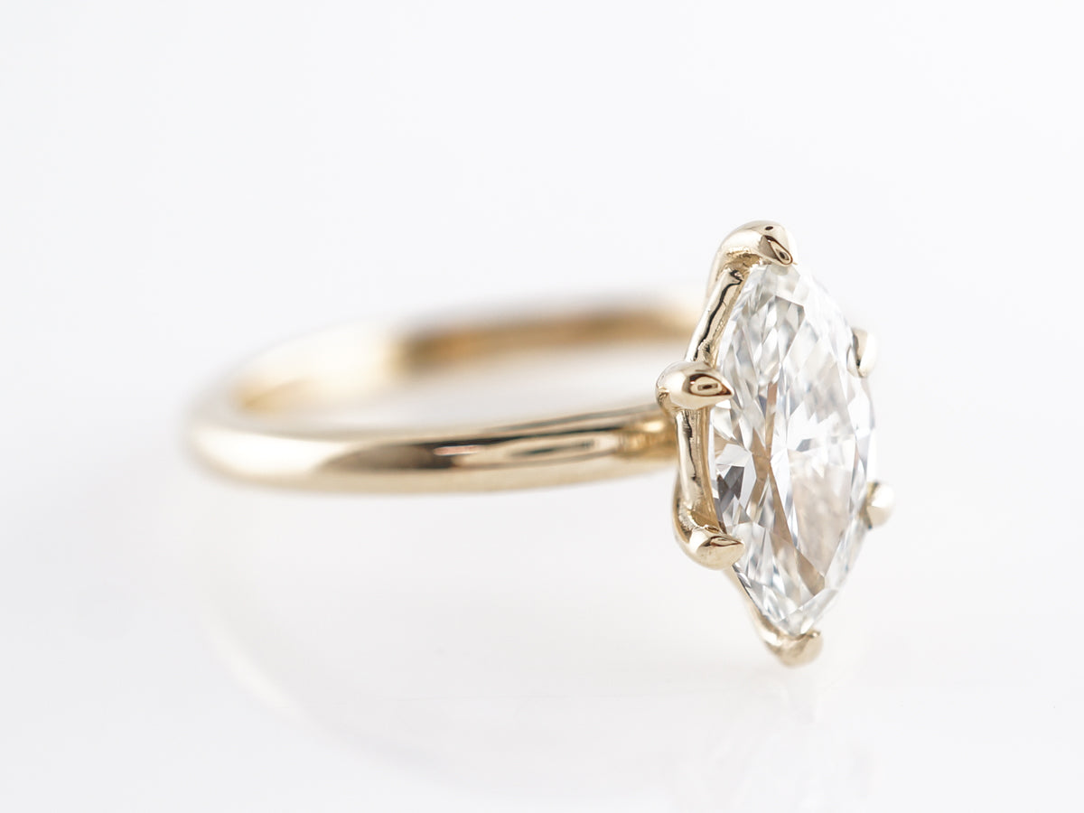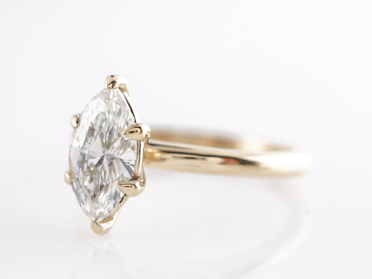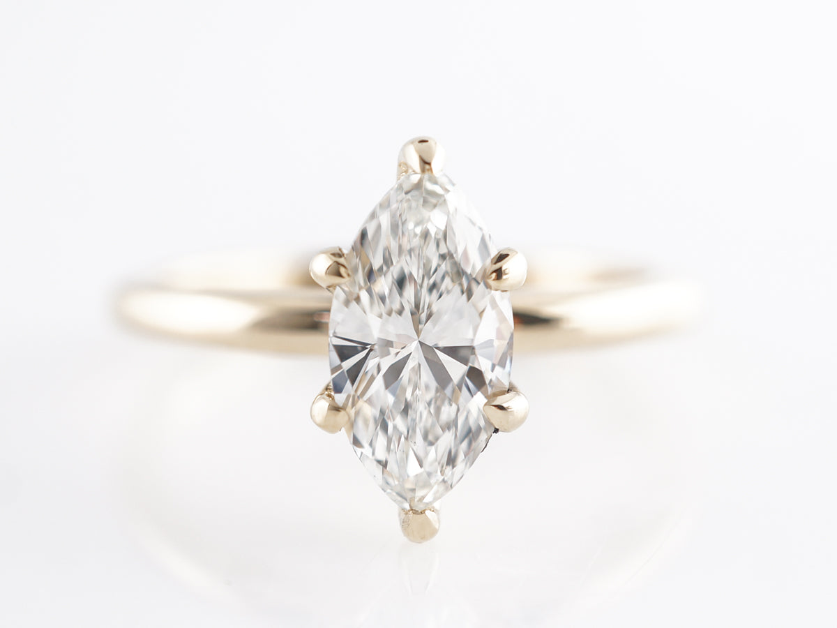 Marquise Diamond Engagement Ring 14k Yellow Gold. This modern engagement ring features a solitaire 1.06 carat marquis cut diamond. The GIA certified center stone is prong set, allowing for maximum brilliance. Finished in yellow gold, this simple engagement ring is elegant and beautiful from every angle!