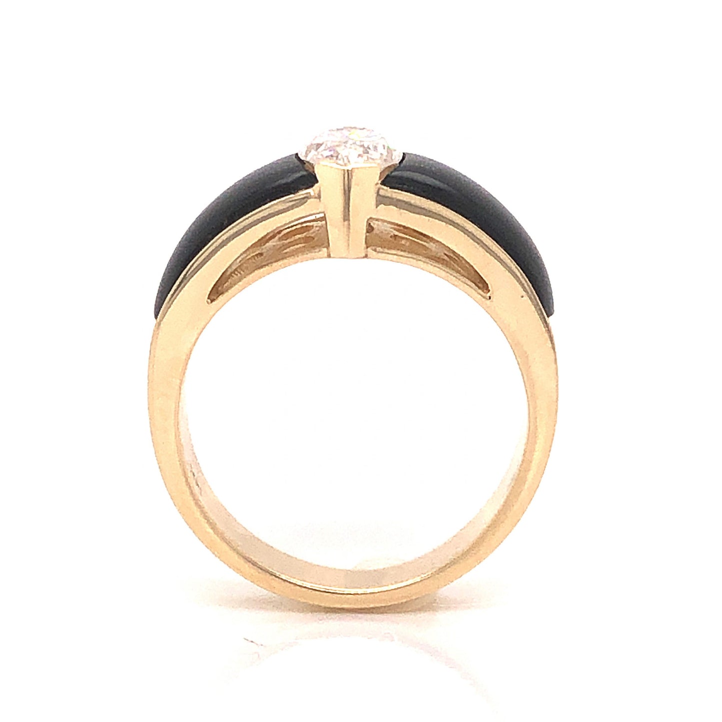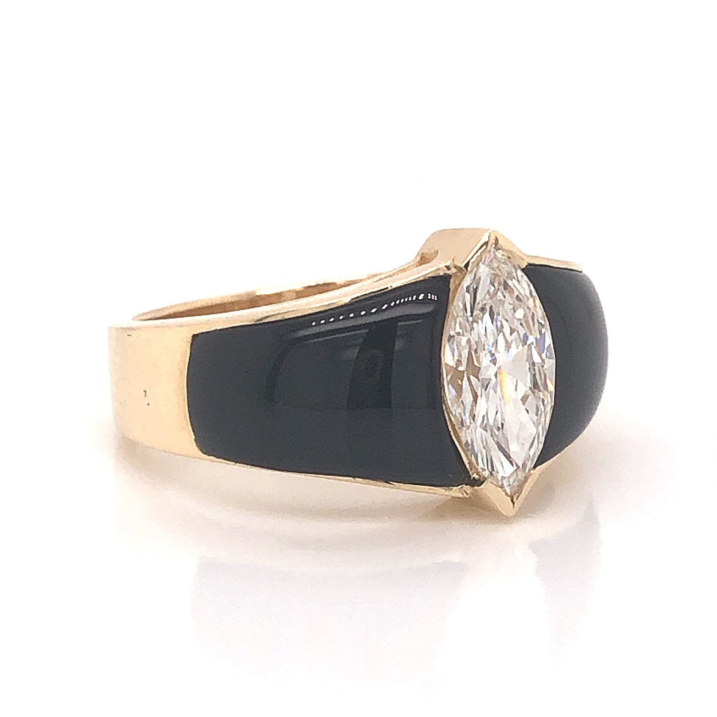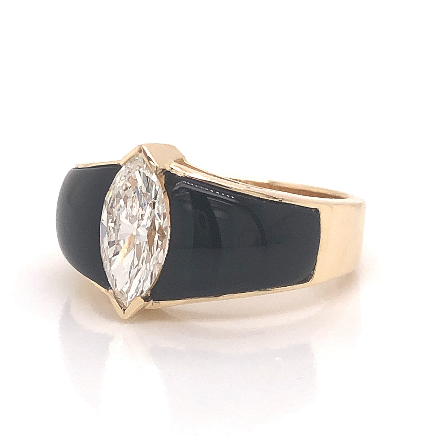 Diamond black onyx are the perfect pair! This fabulous modern cocktail ring features a 1.03 carat marquise cut diamond in 14 karat yellow gold. Set in protective prongs, the dazzling center diamond has a soft white hue and is accented by black onyx on the tapered band. The diamond color and sparkle pops against the black gemstones. A timeless, modern treasure. Shop More Onyx Diamond Jewelry.