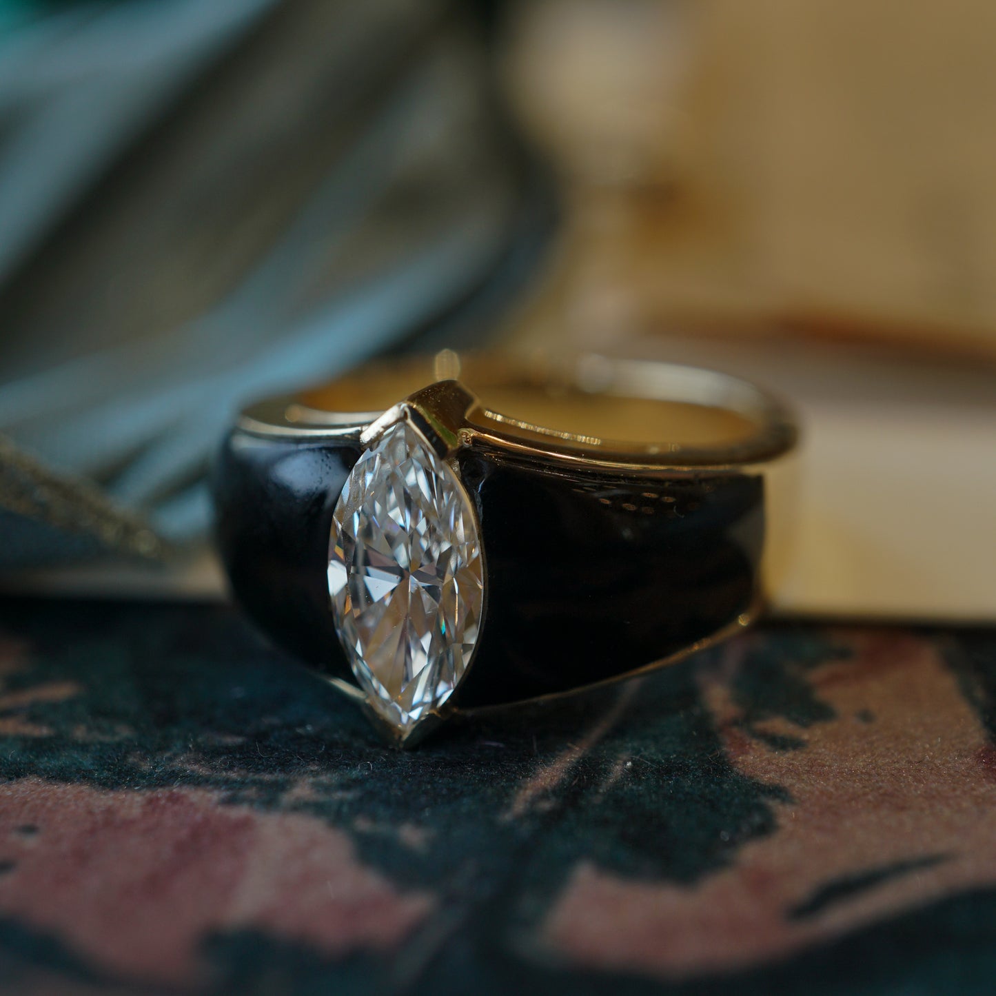 Marquise Diamond & Onyx Cocktail Ring in 14k Yellow Gold