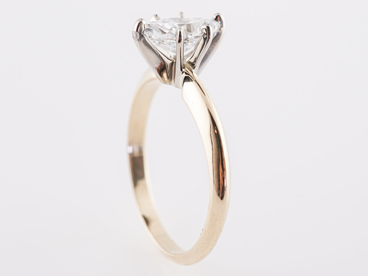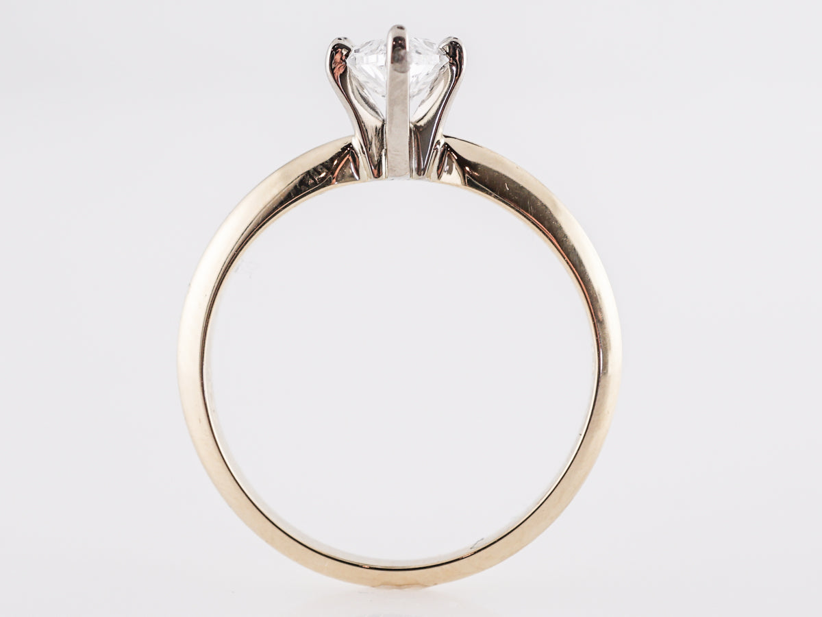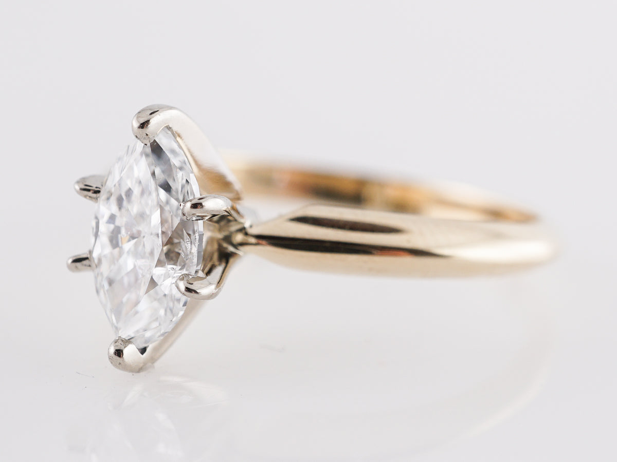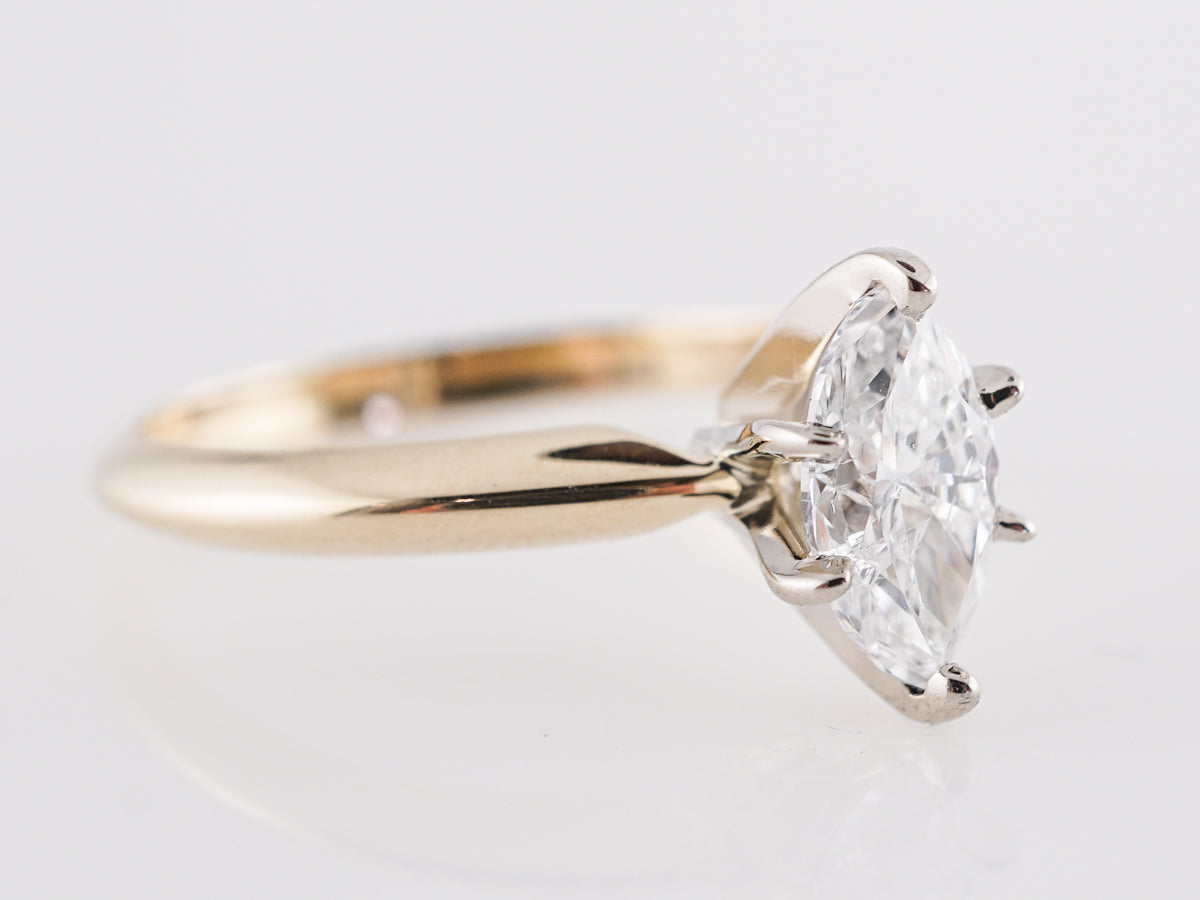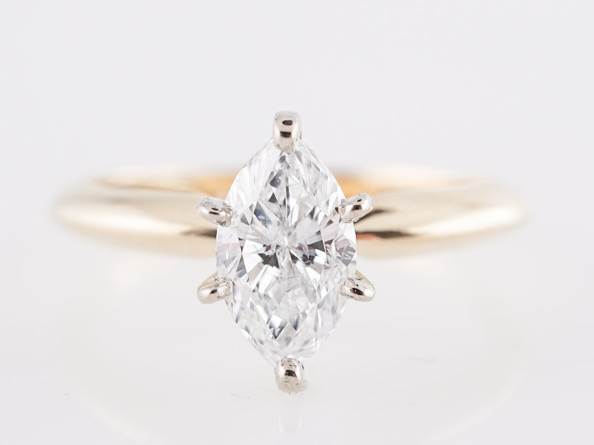 Marquise Diamond Solitaire Engagement Ring in 14K. This engagement ring features a .76 carat diamond on a six (6) prong 14k yellow gold band. The marquise cut diamond offers sharp, kite-shaped facets that are effective in creating texture and sparkle to this modern piece of jewelry. The sparkling diamond has a generous amount of light dispersion, creating soft rainbows of light that dance when the ring sees a bit of light and movement on the finger. The slender and durable 14k yellow gold band supporting the primary stone is polished and shined to perfection. Contact one of our jewelry experts for more details on this engagement ring!