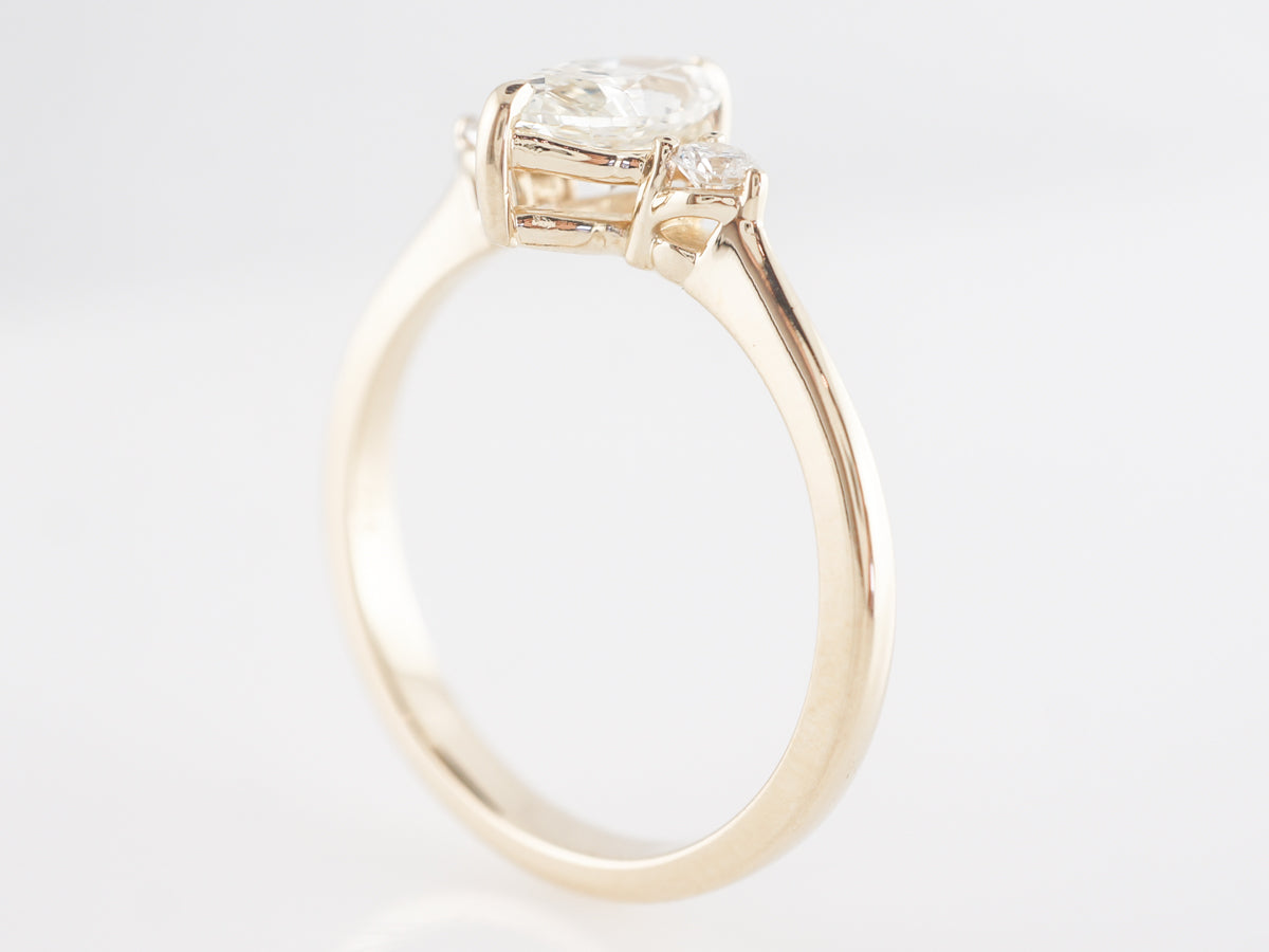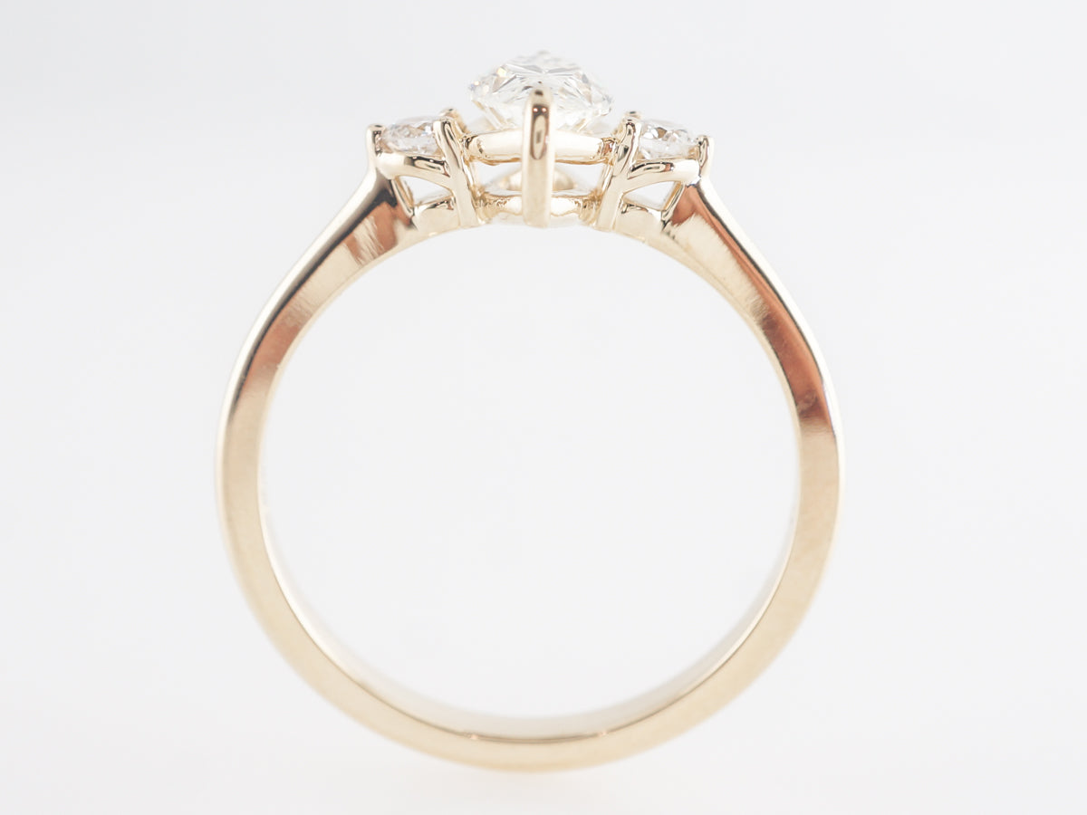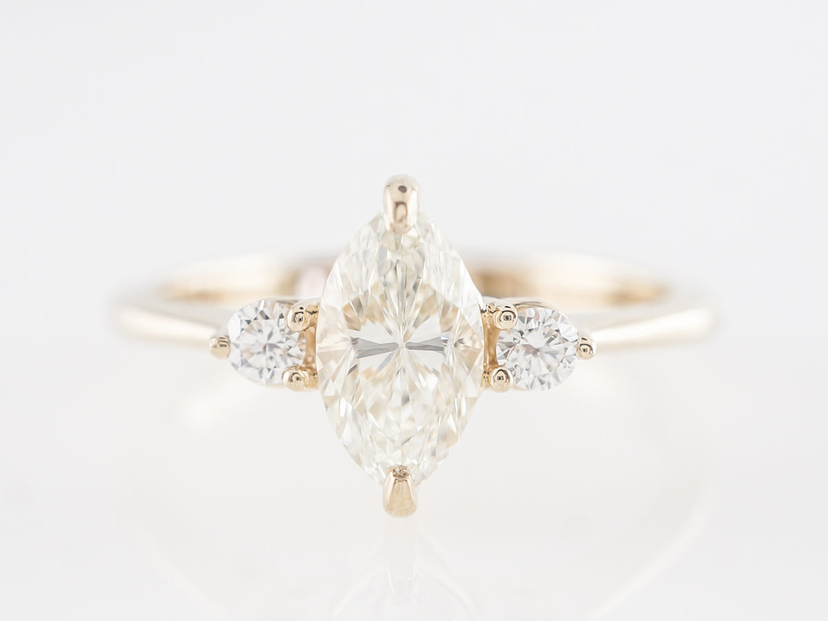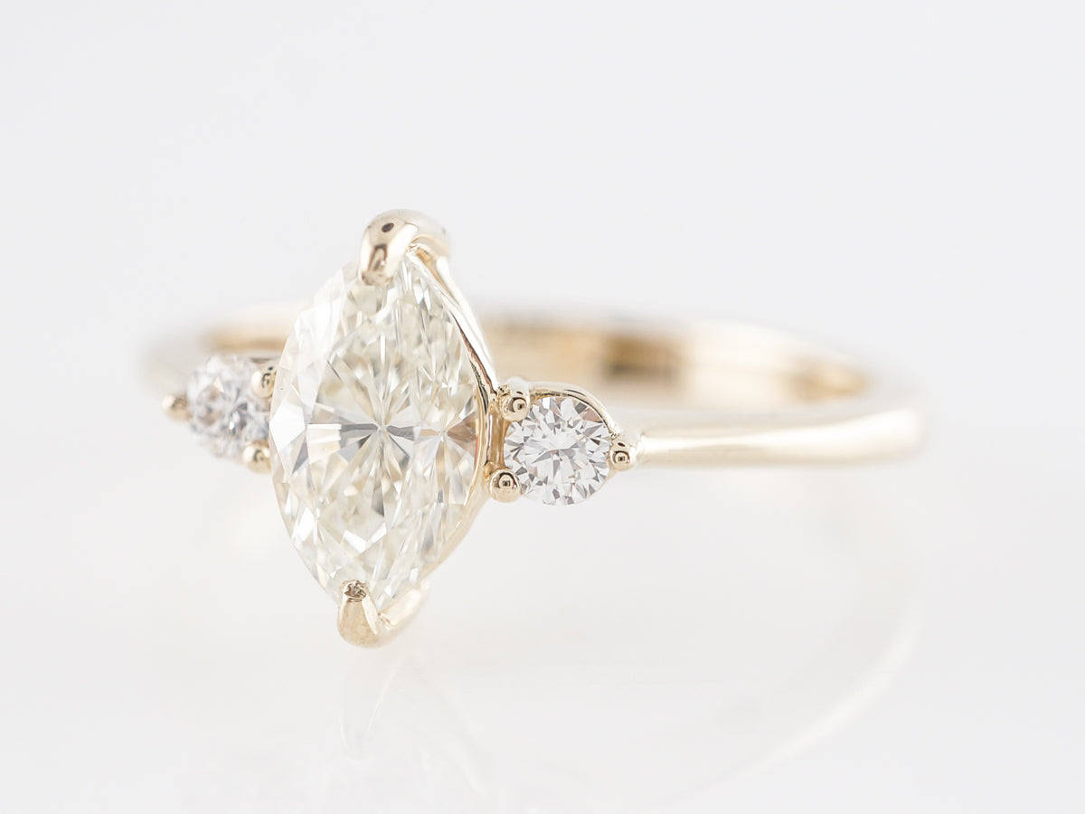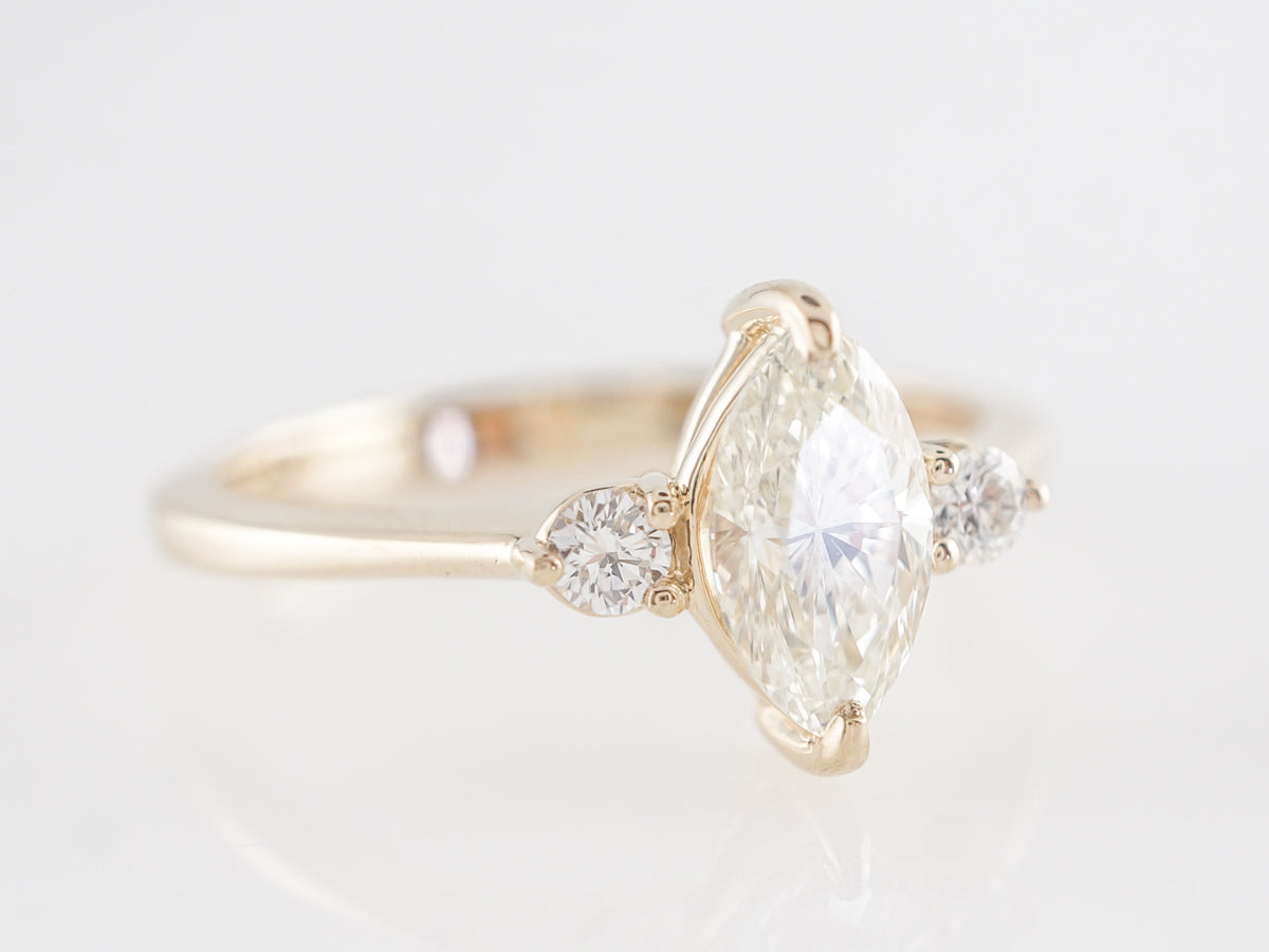 Marquise Diamond Three Stone Engagement Ring in 14K Yellow Gold. This modern engagement ring features a .79 carat marquise cut diamond set in 14 karat yellow gold. The marquise cut has recently seen a surge in popularity. A rather shallow cut, marquise diamonds often appear larger than comparable weights of more traditional cuts. We refer to this design as the little black dress because it looks so great on everyone!