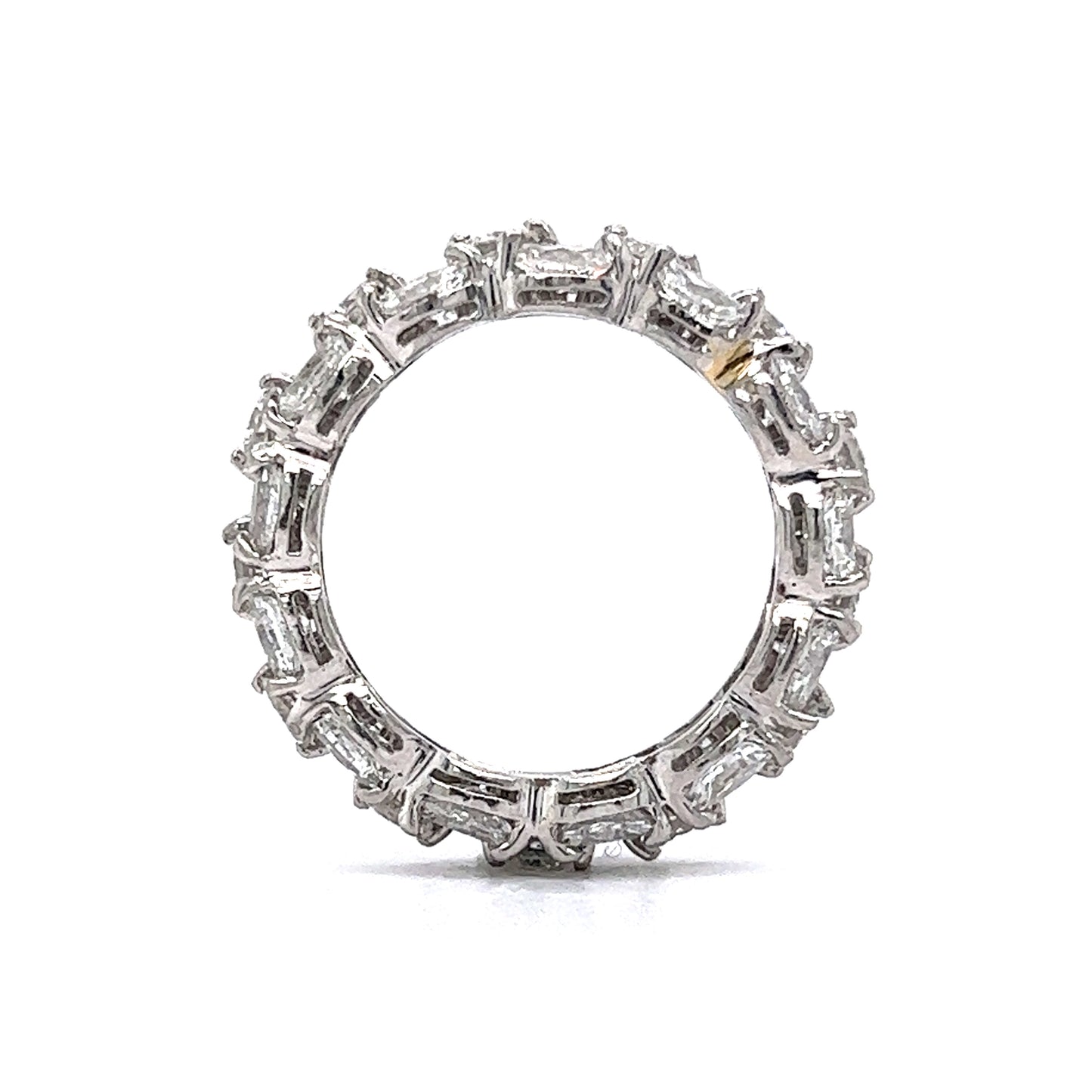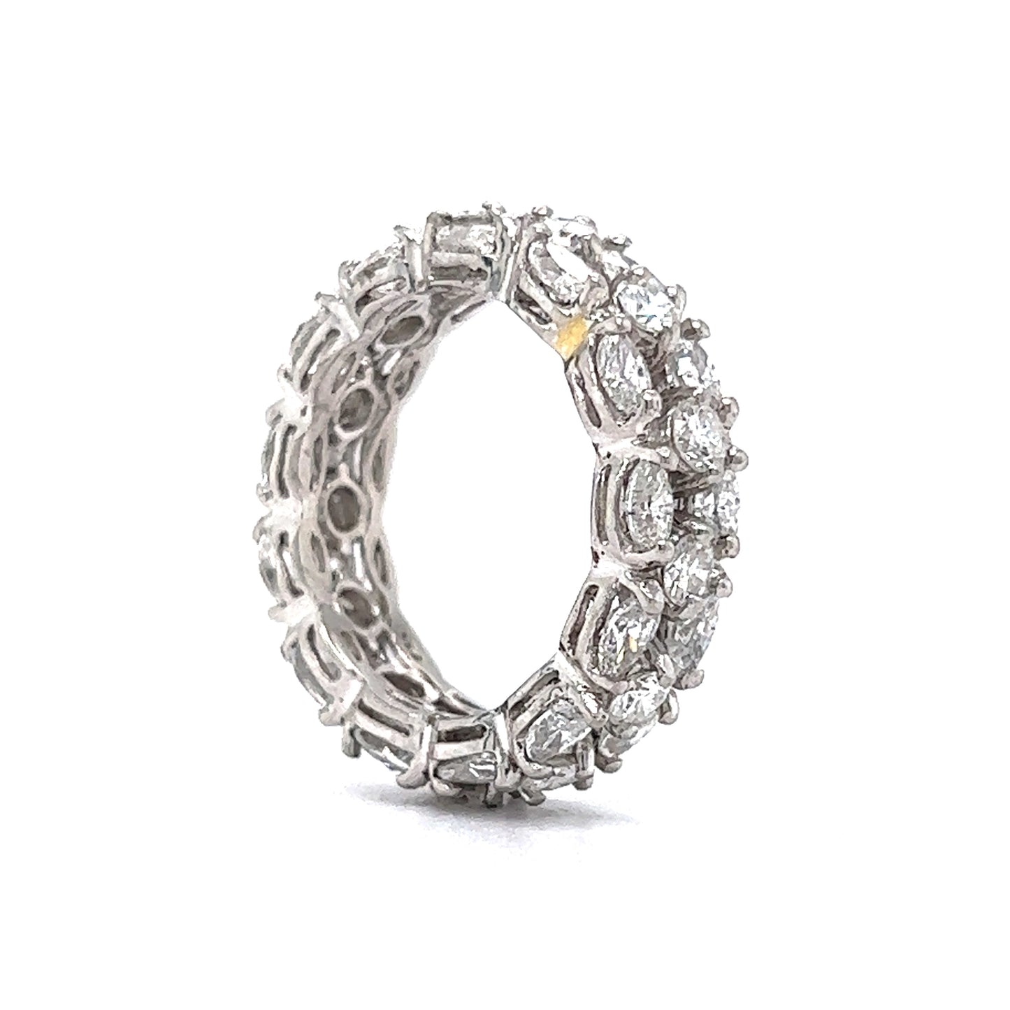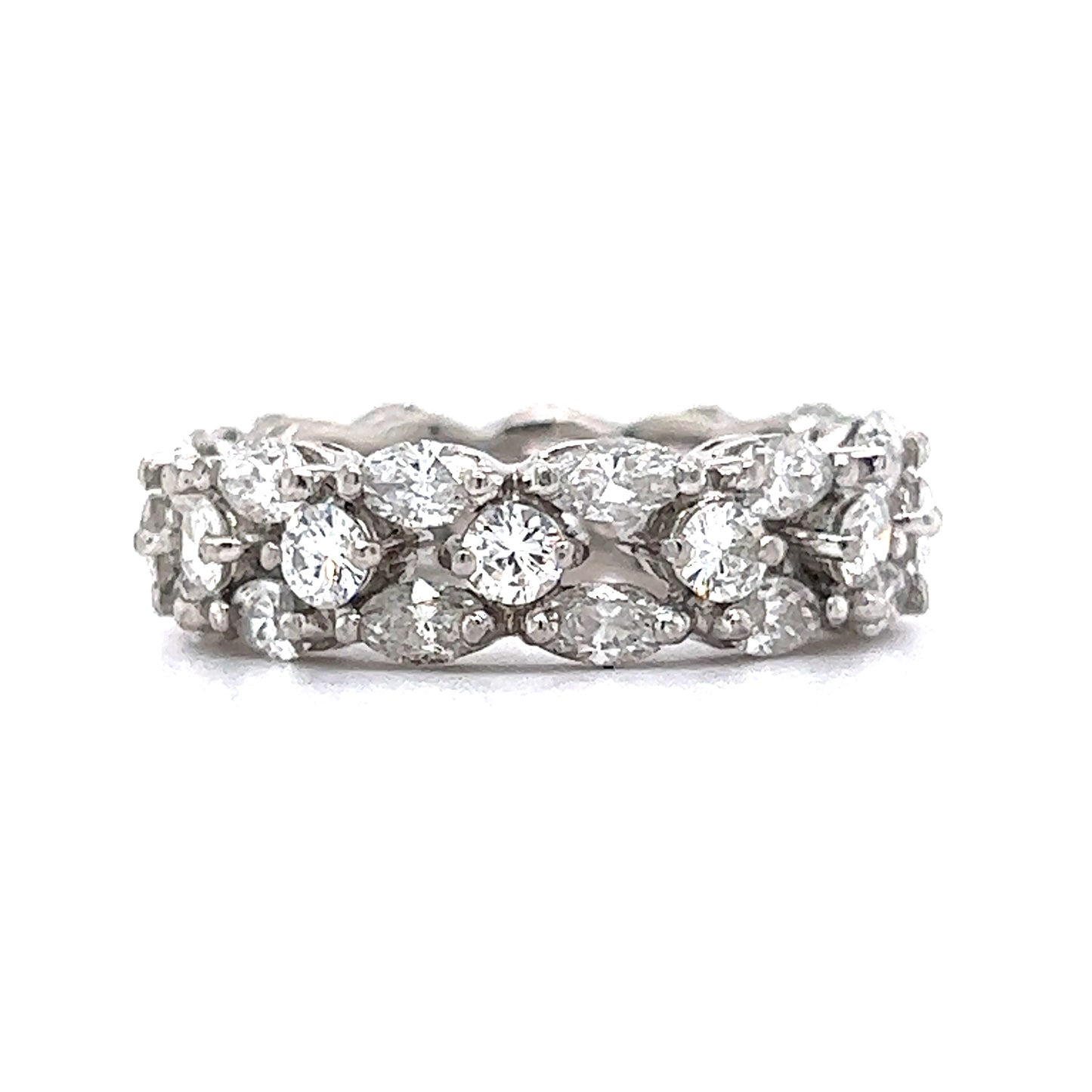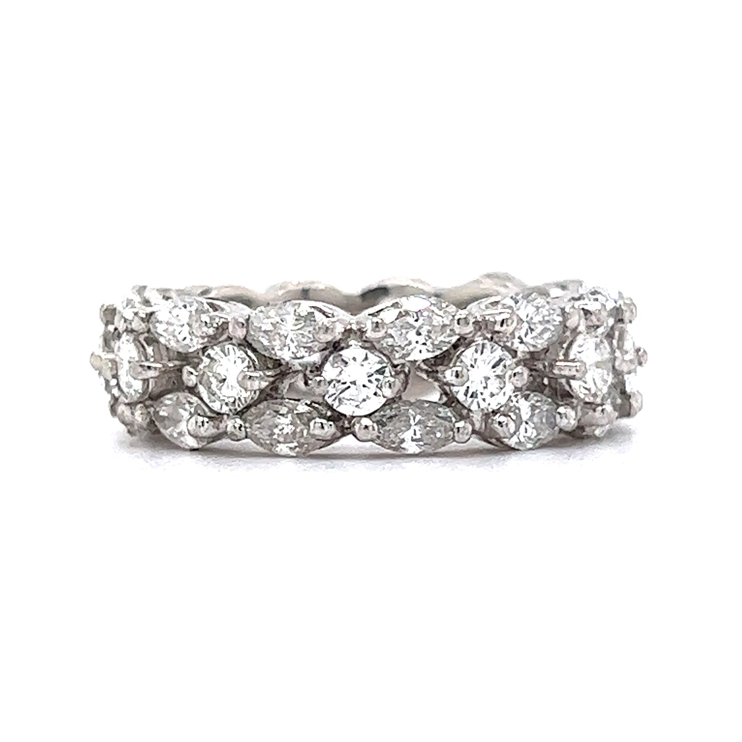 A diamond ring with style! This marquise round cut diamond eternity ring features 3.70 total carats of diamonds in platinum. The center row of diamonds feature thirteen (13) round cut gems. Above and below, twenty-six (26) near colorless marquise cut diamonds form the dancing structure of the ring. This statement diamond eternity band is stylish and futuristic. A lovely addition to our cocktail ring collection!