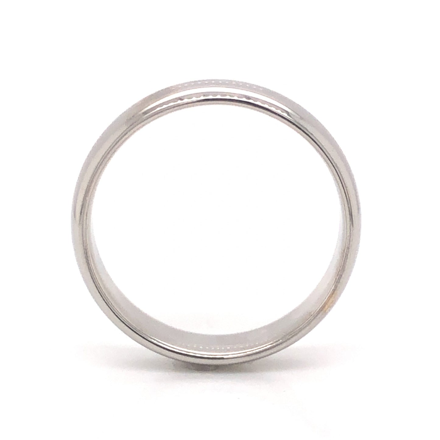 This men’s wedding band features a bold, minimal design in polished 14 karat white gold. The thick band measures 5.5mm wide and has an overall stunning appearance. A trusted choice for a comfortable, everyday wedding band.