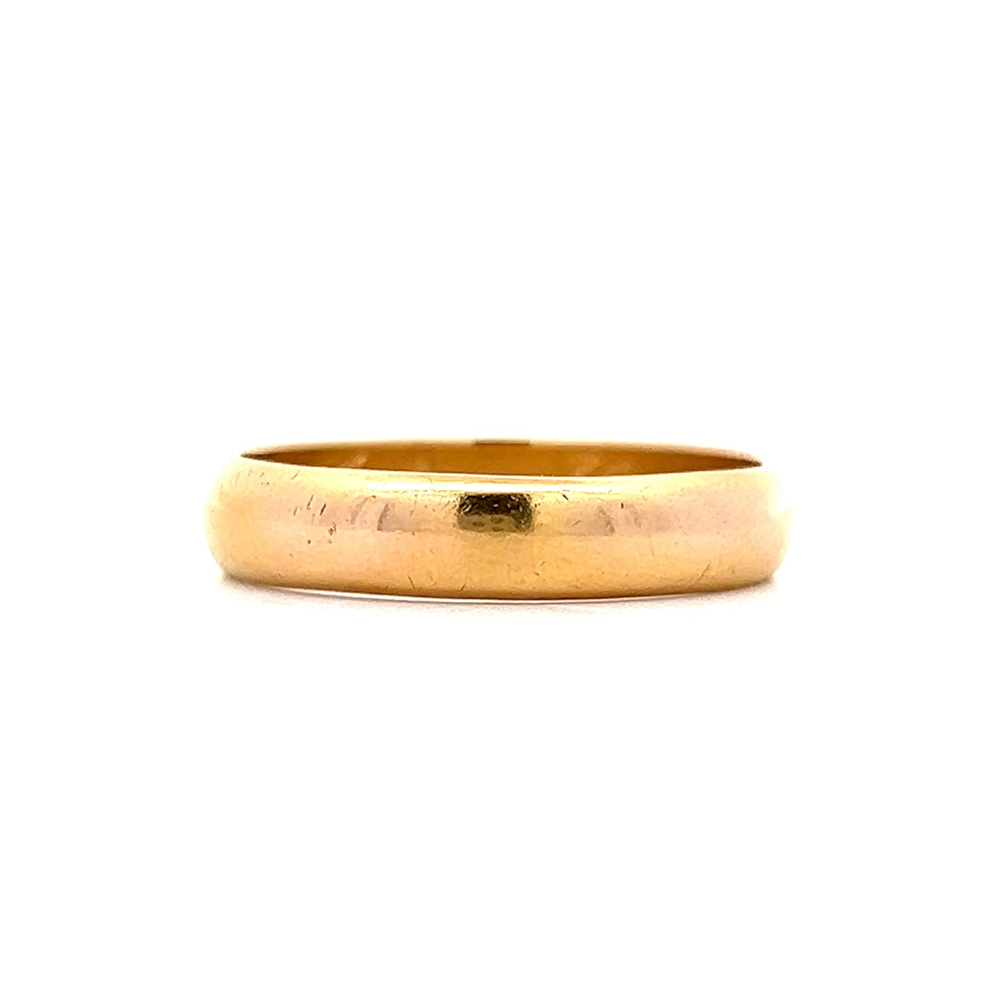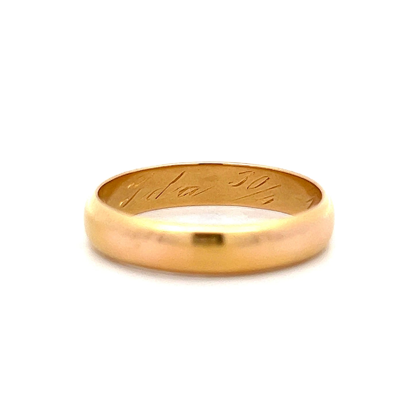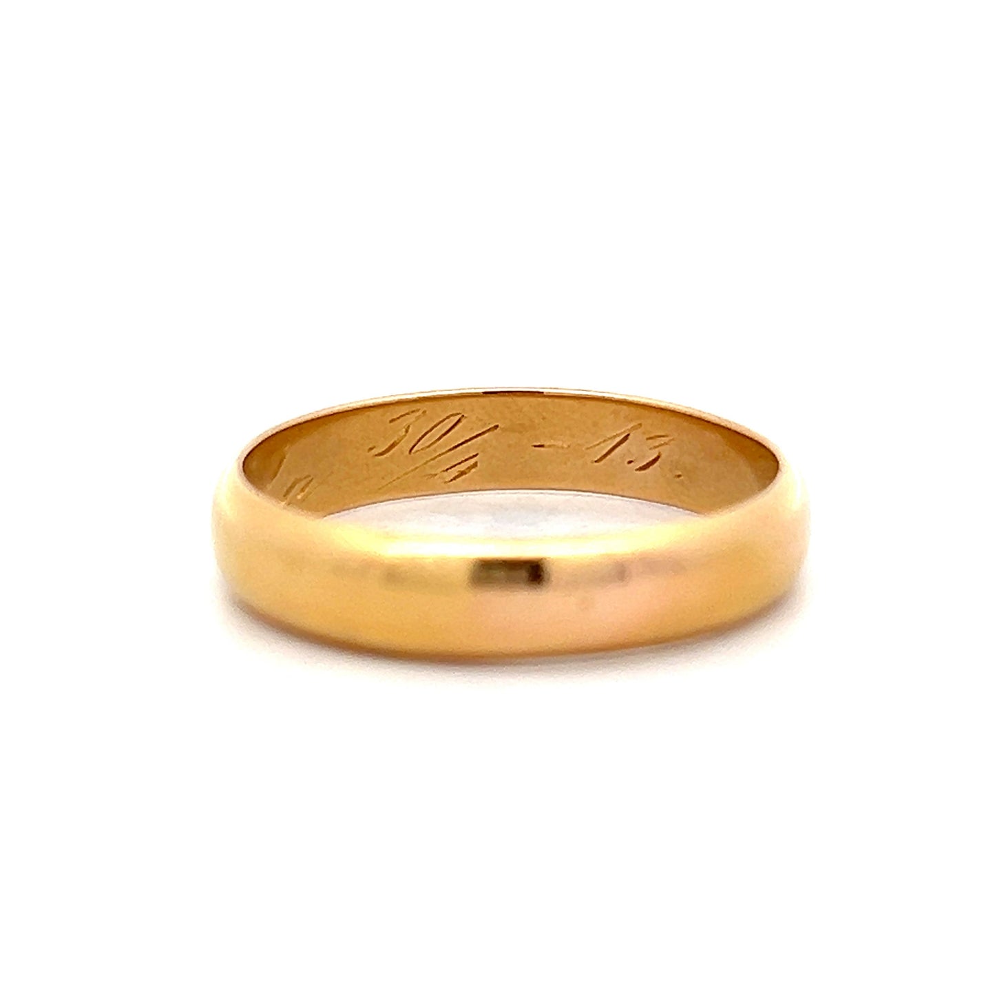 This 18-karat yellow gold men’s wedding band measures 5 mm in width and features a classic half-round profile. The band includes an original engraving dated 4-30-13, highlighting its antique origin in the late Edwardian, early Art Deco period.