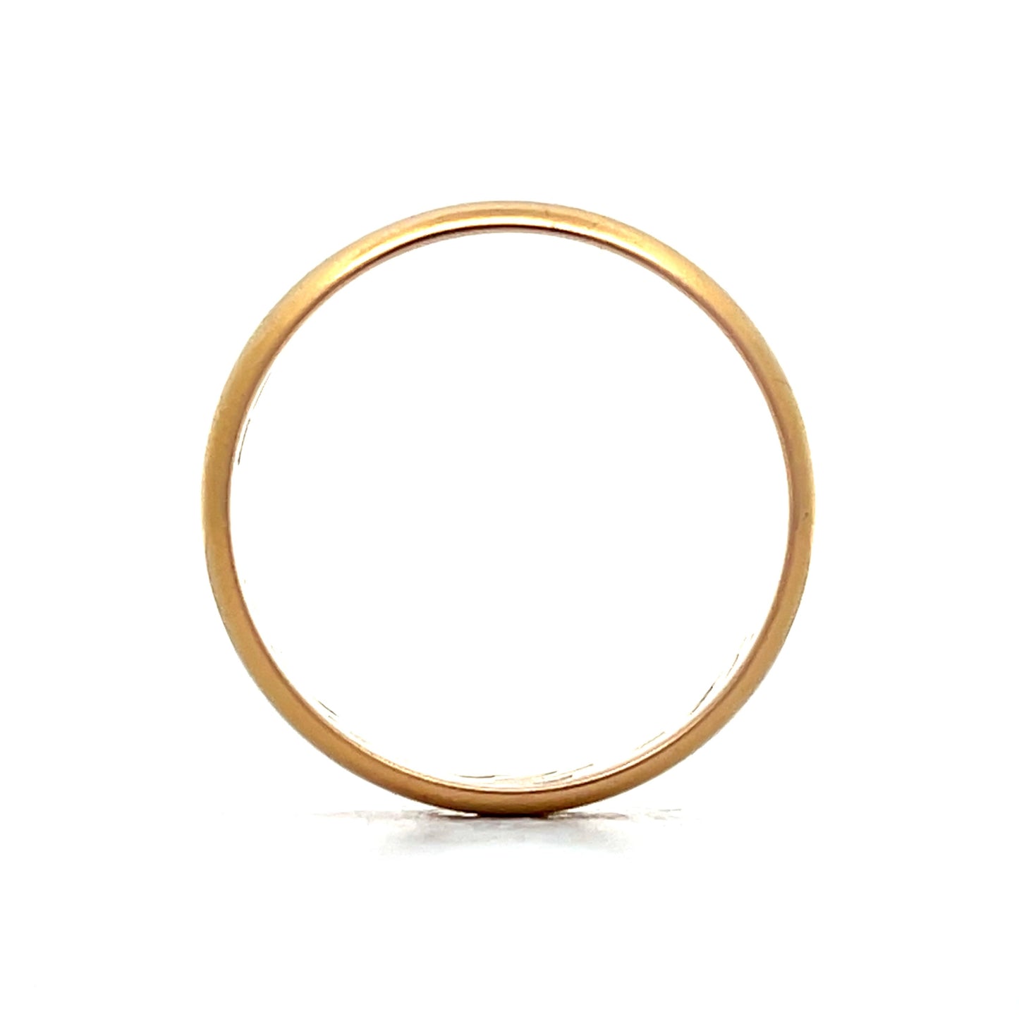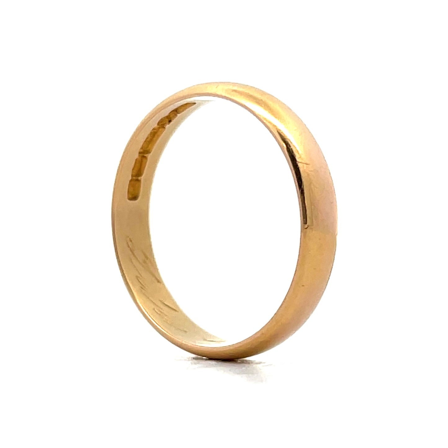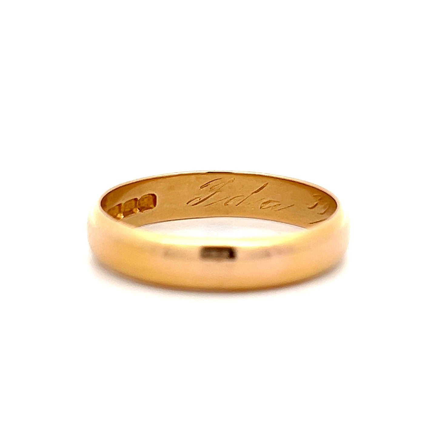 This 18-karat yellow gold men’s wedding band measures 5 mm in width and features a classic half-round profile. The band includes an original engraving dated 4-30-13, highlighting its antique origin in the late Edwardian, early Art Deco period.