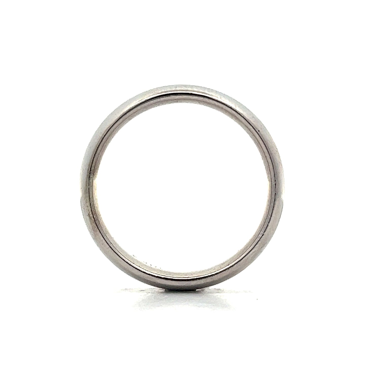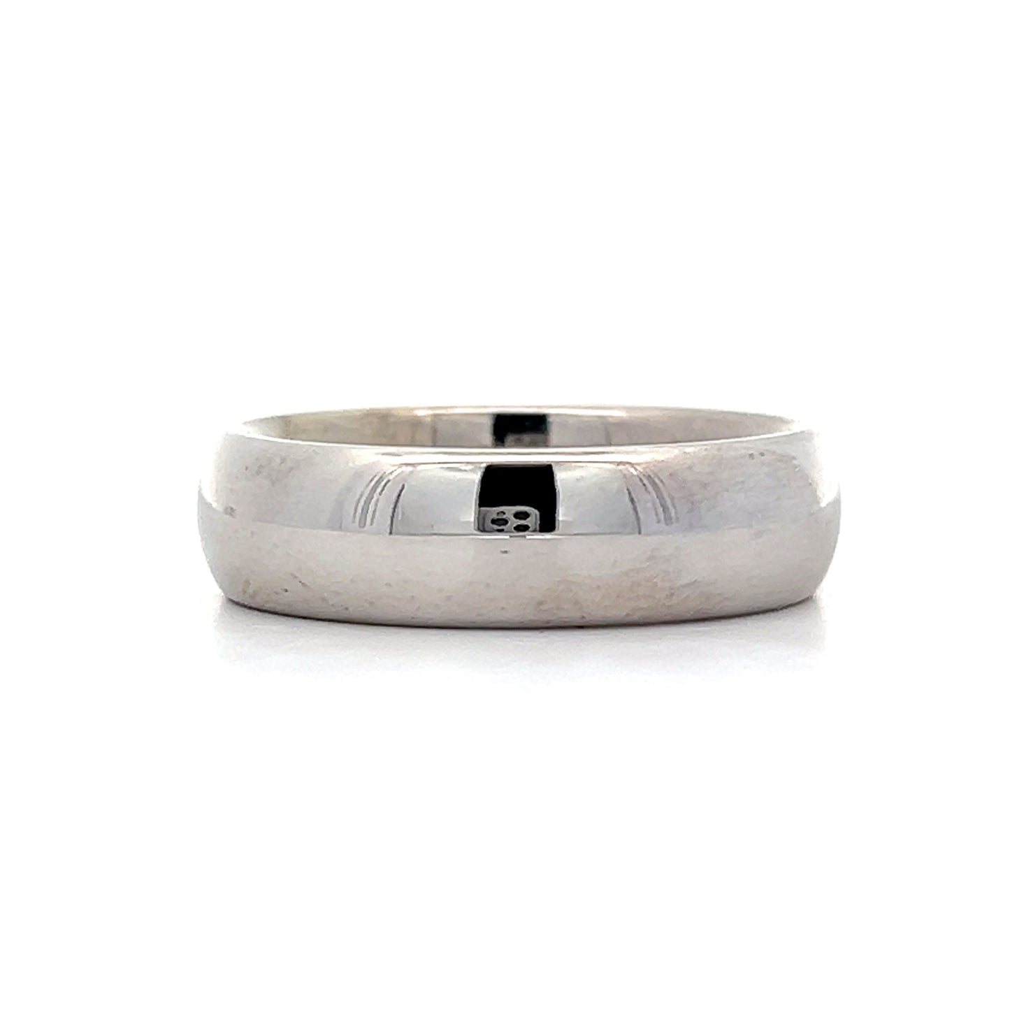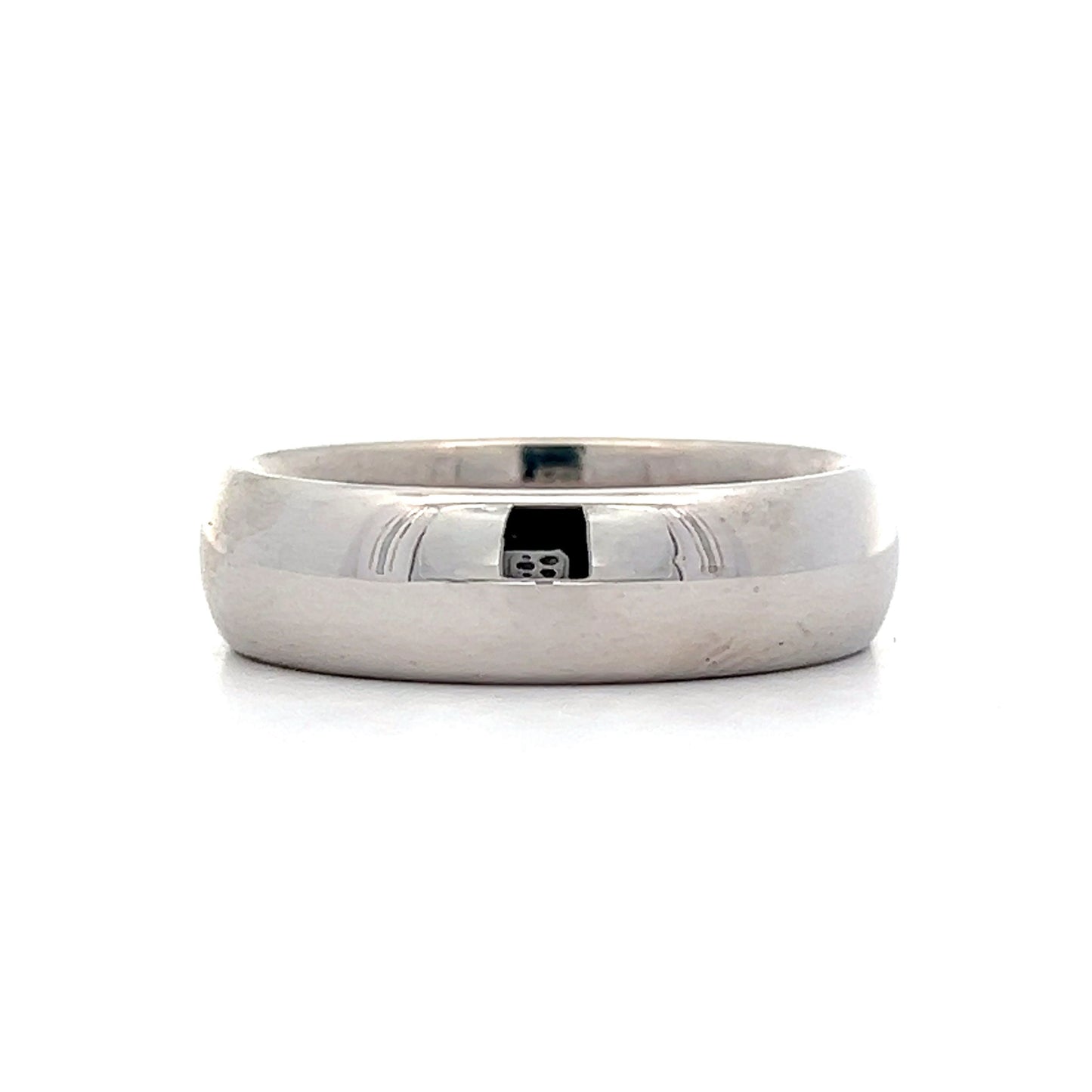This men's wedding band, made from 18 karat white gold, features a half-round design with a comfort fit for all-day wear. The 6 mm band width strikes a balance between presence and sleekness. The high-polished finish provides a clean, reflective surface. This wedding ring is a durable and classic choice.